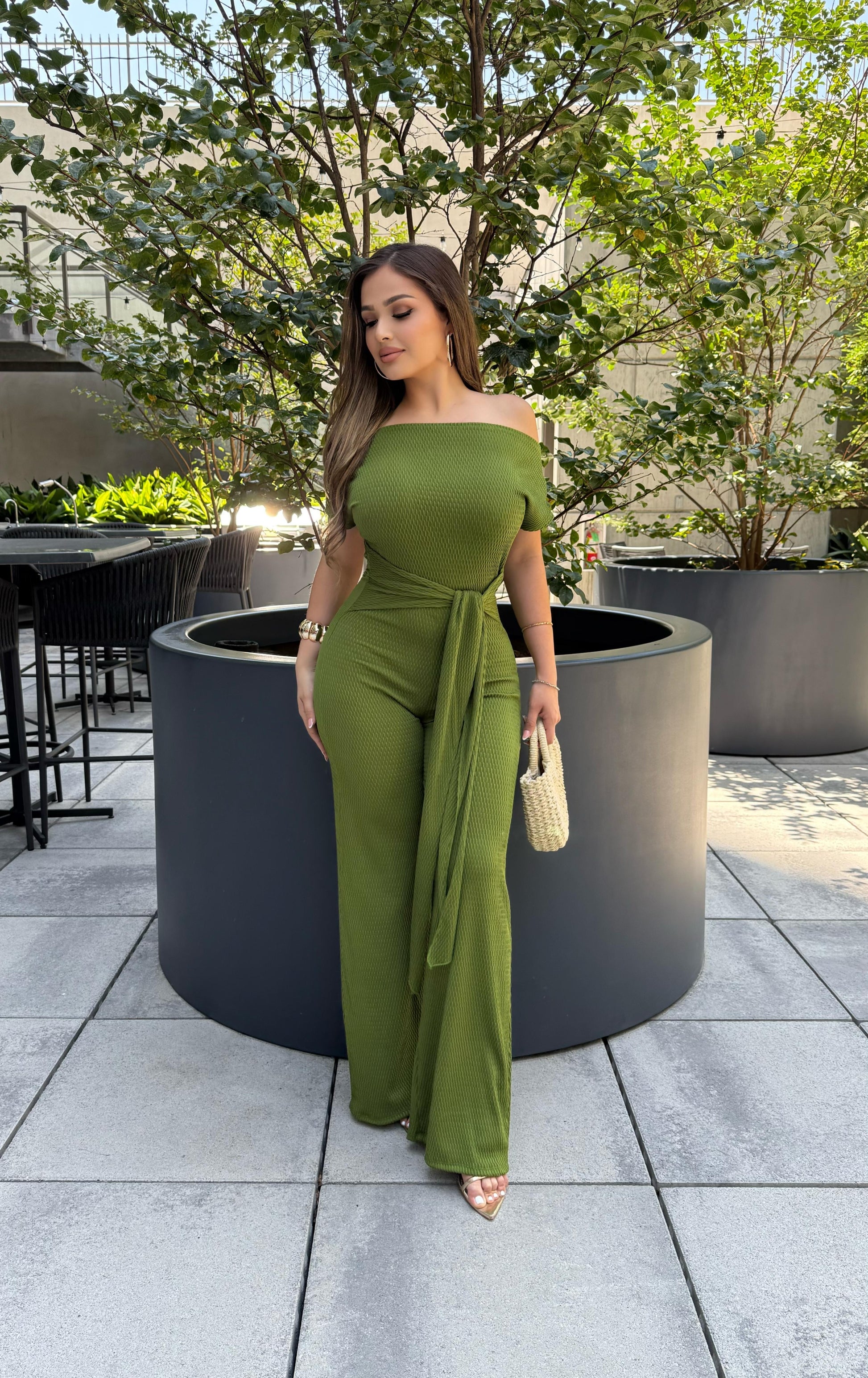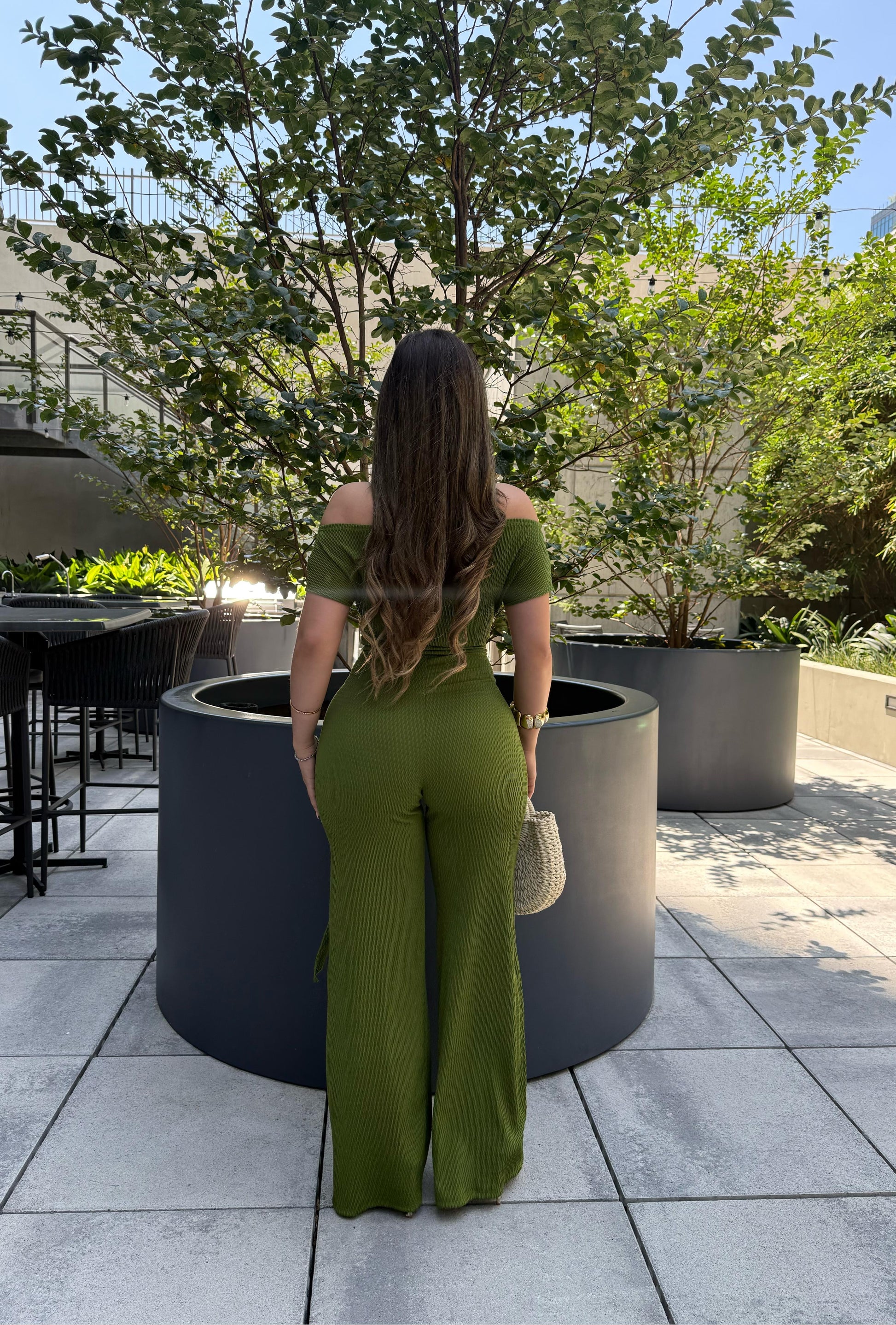 Avocado Green Ribbed Asymmetrical Jumpsuit - Stretchy,Estira