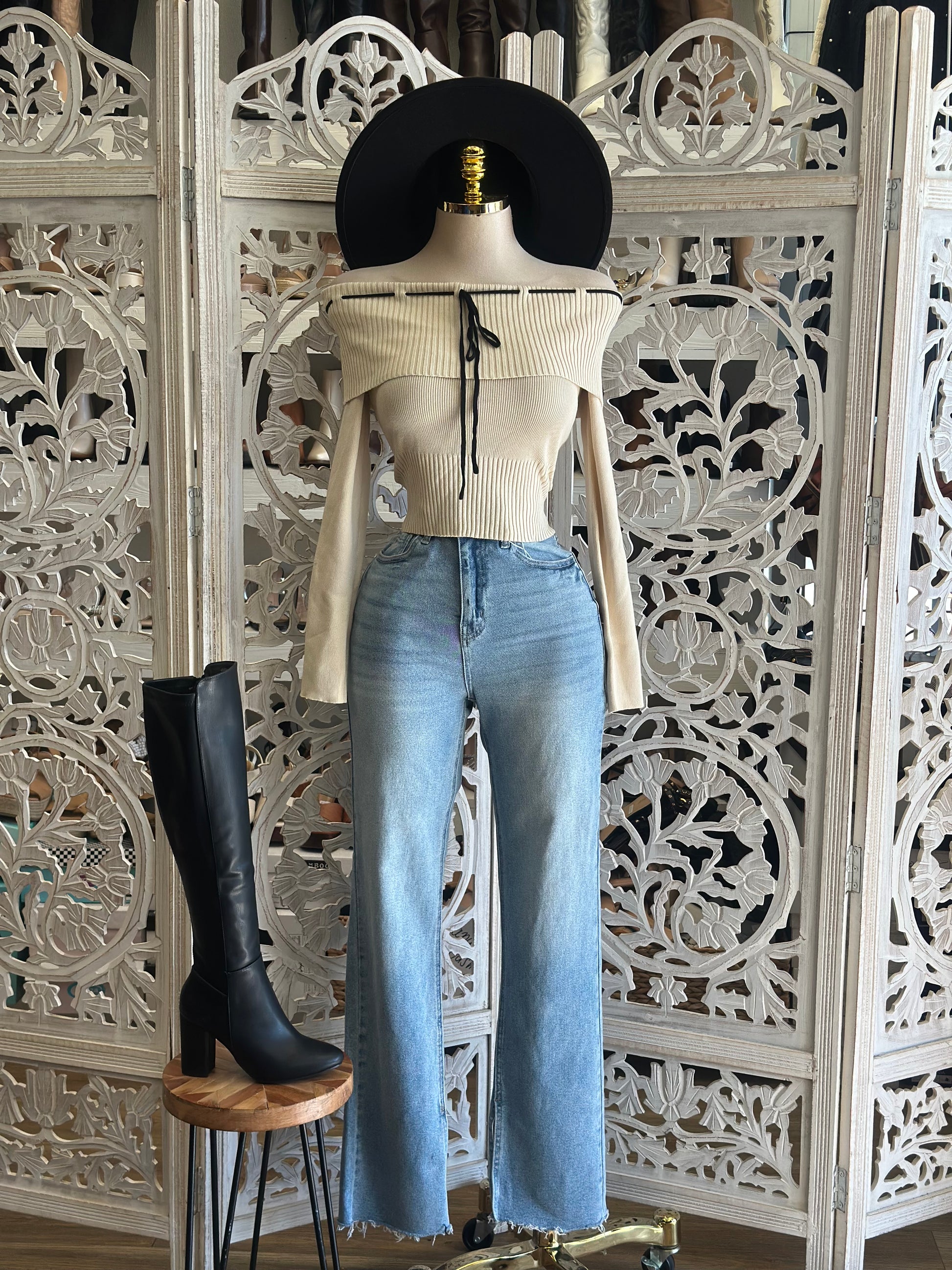 Beige Off Shoulder Ribbed Ribbon Top- Estira, Stretchy