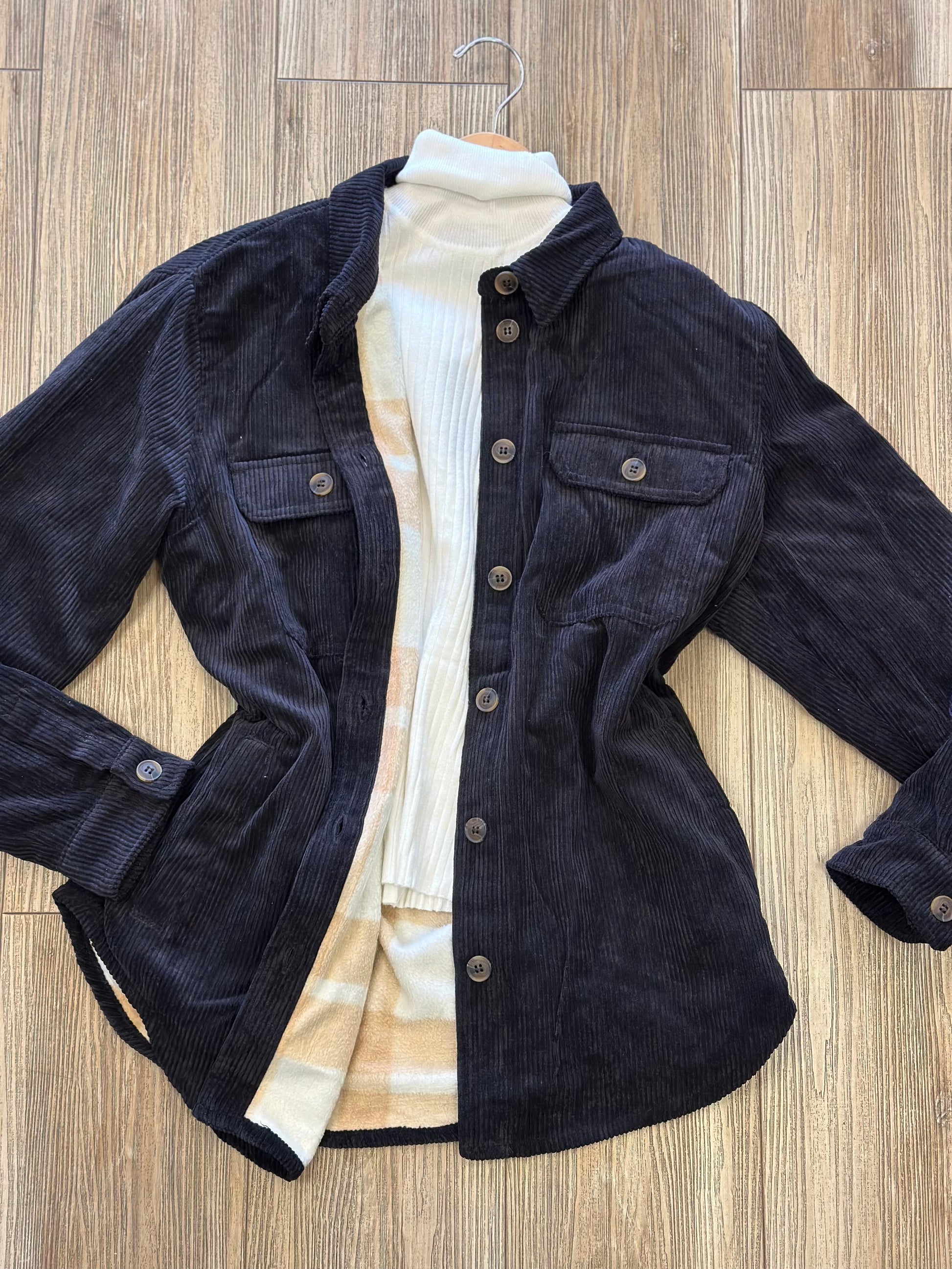 Black Corduroy Reversible Flannel Jacket- Stretchy, Estira