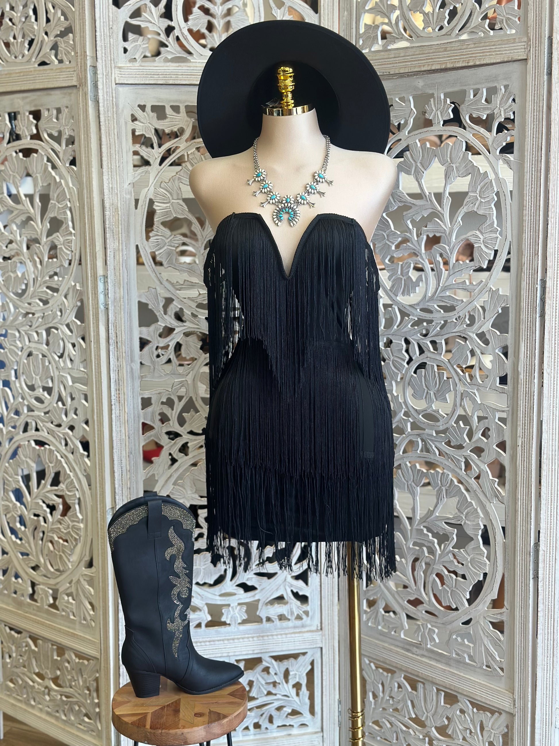 Black Fringe Dress- Stretchy, Estira