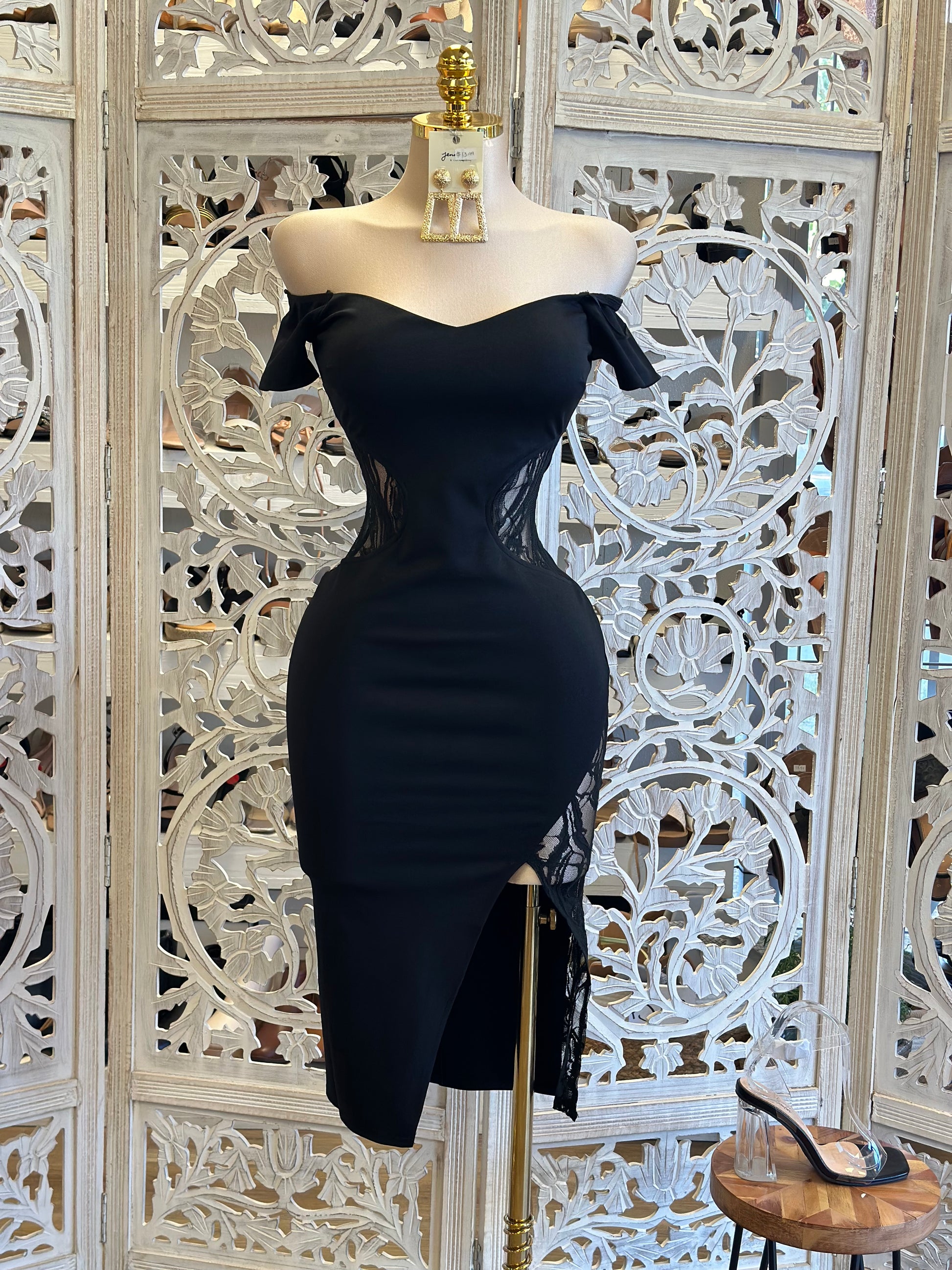 Black Off Shoulder Lace Cutout Dress - Estira, Stretchy