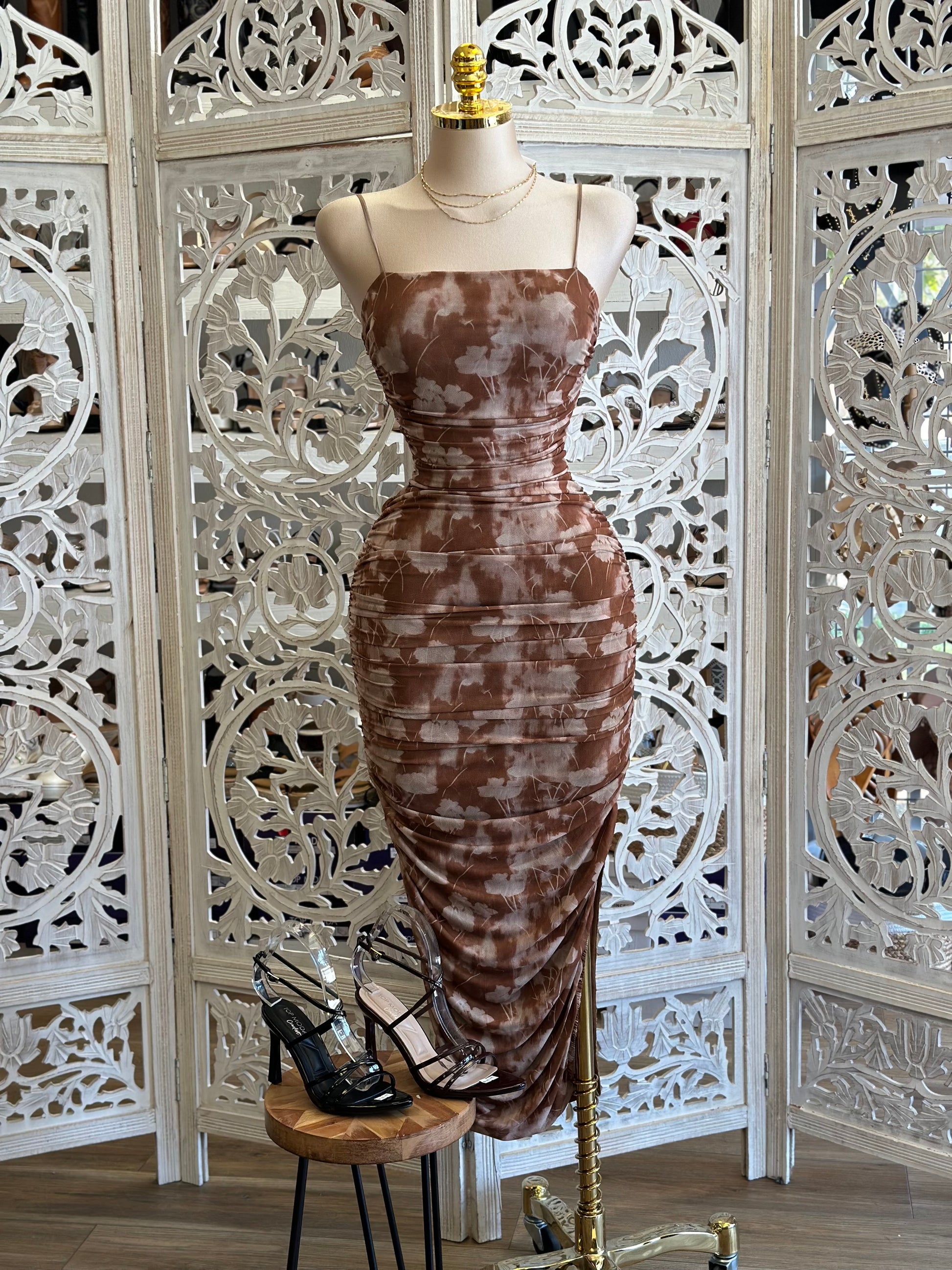 Brown Pattern Cami Mesh Midi Dress - Estira, Stretchy