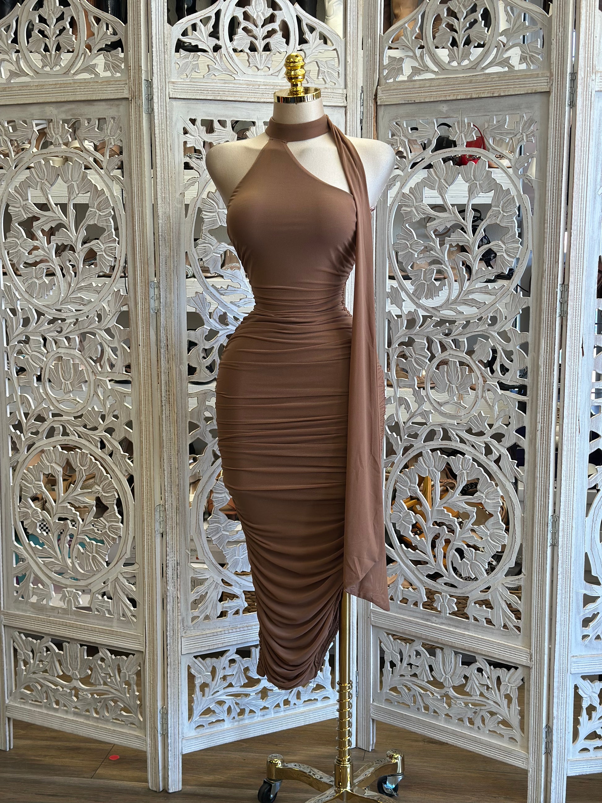 Brown Ruched Scarfed Midi Dress - Estira, Stretchy