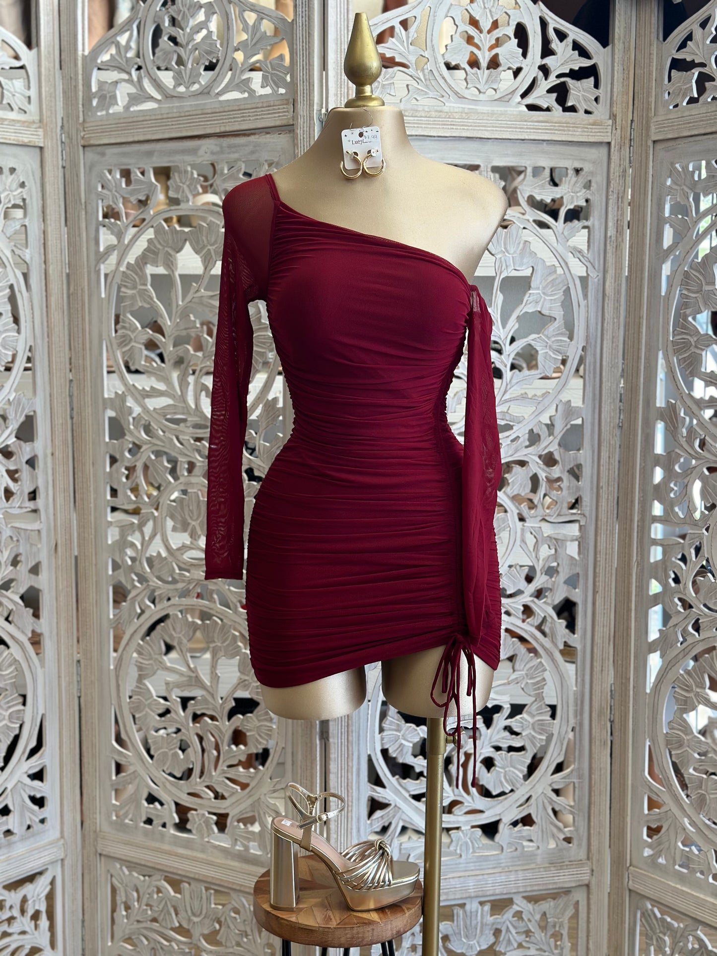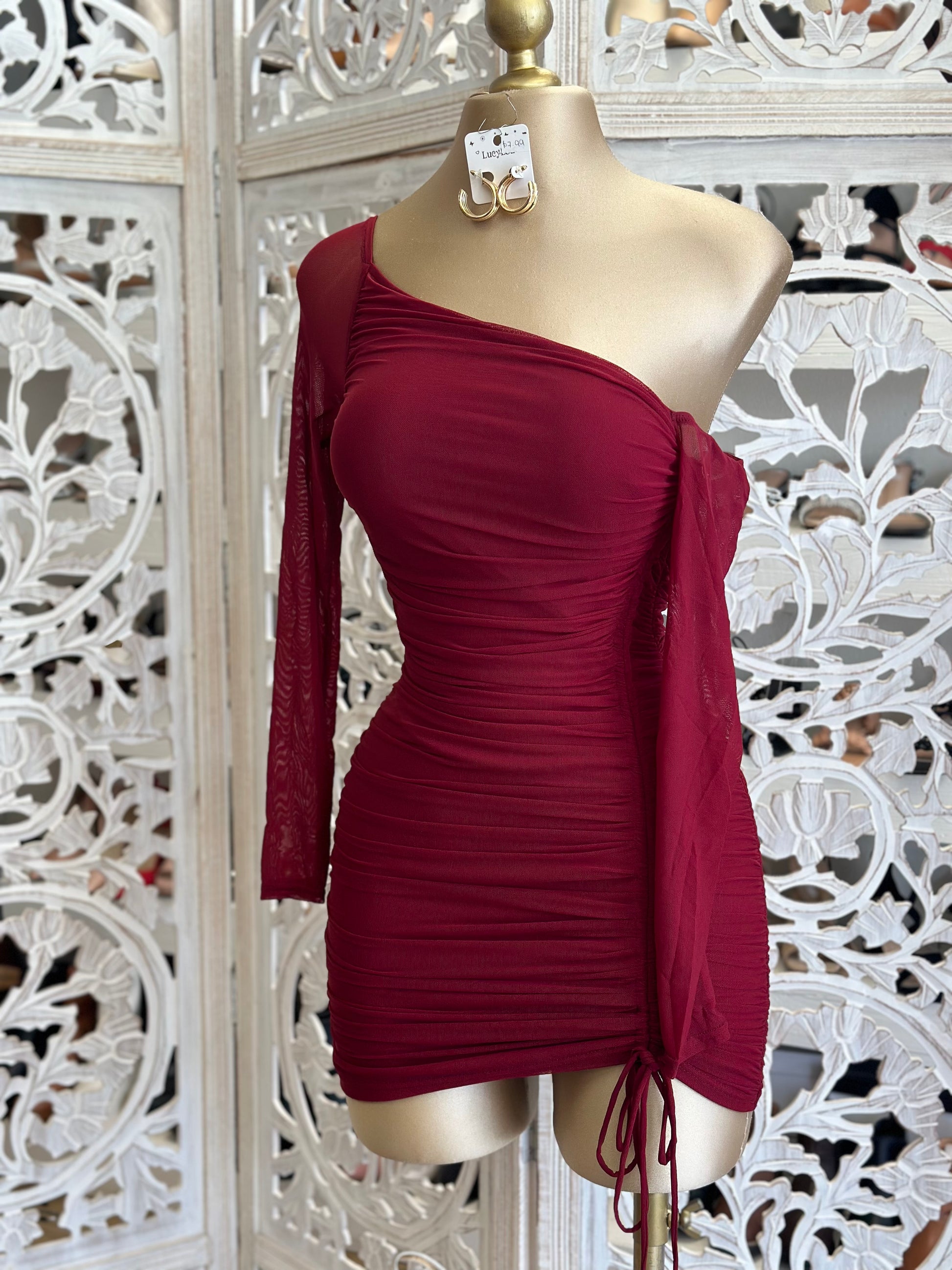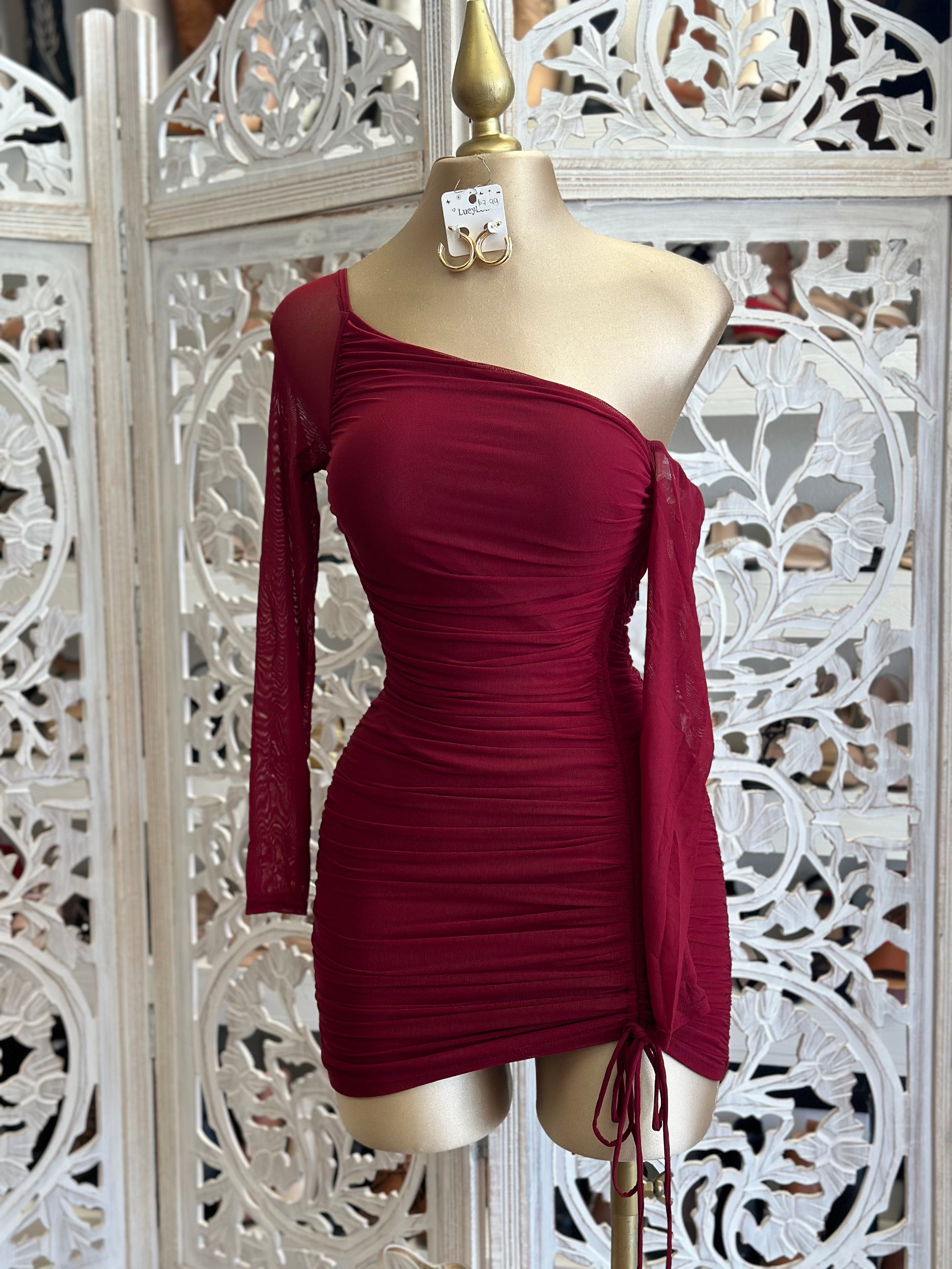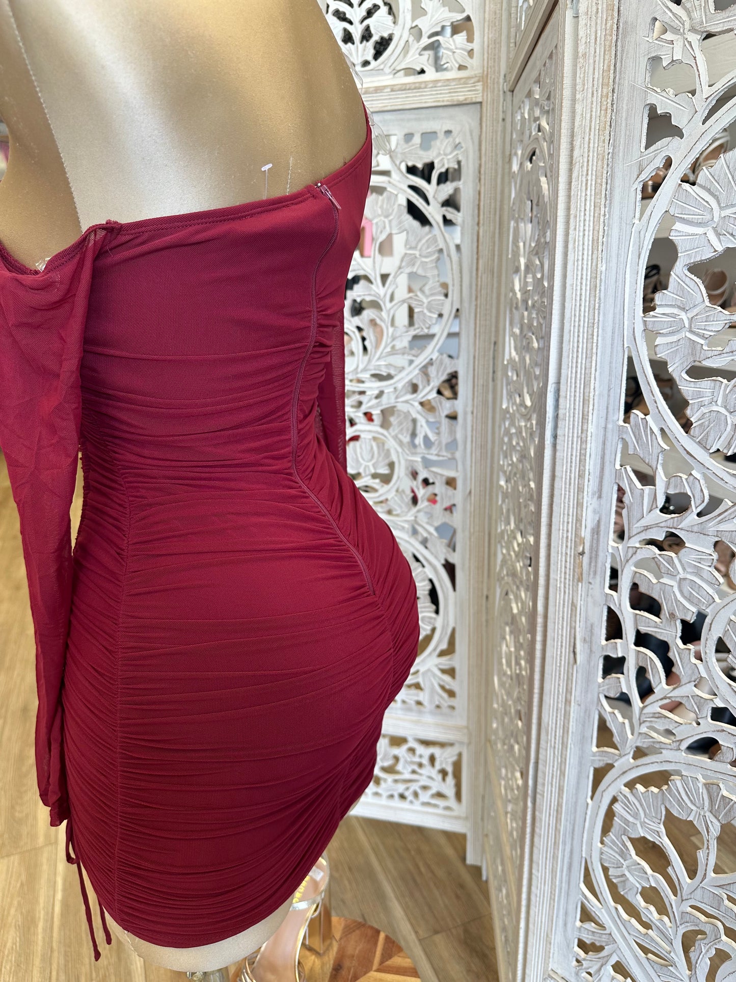Burgundy Asymmetrical Ruched Mini Dress-Stretchy