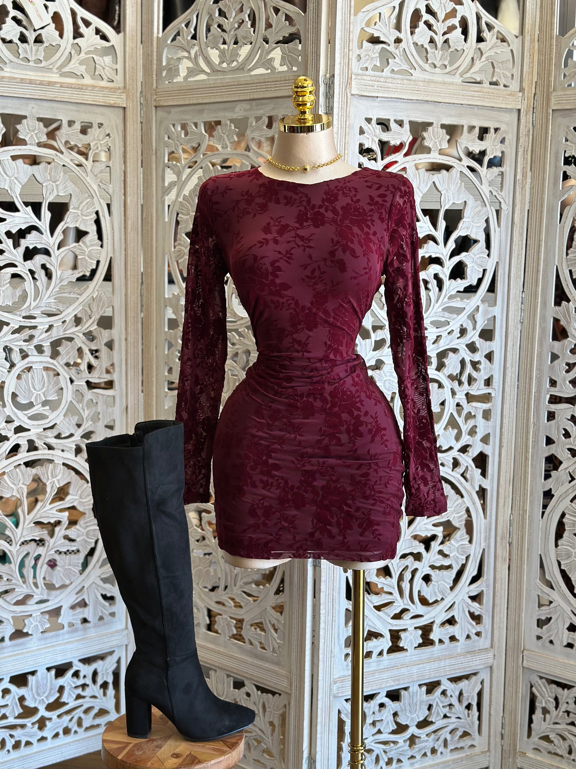 Burgundy Velvet Floral Cutout Mini Dress- Stretchy,Estira
