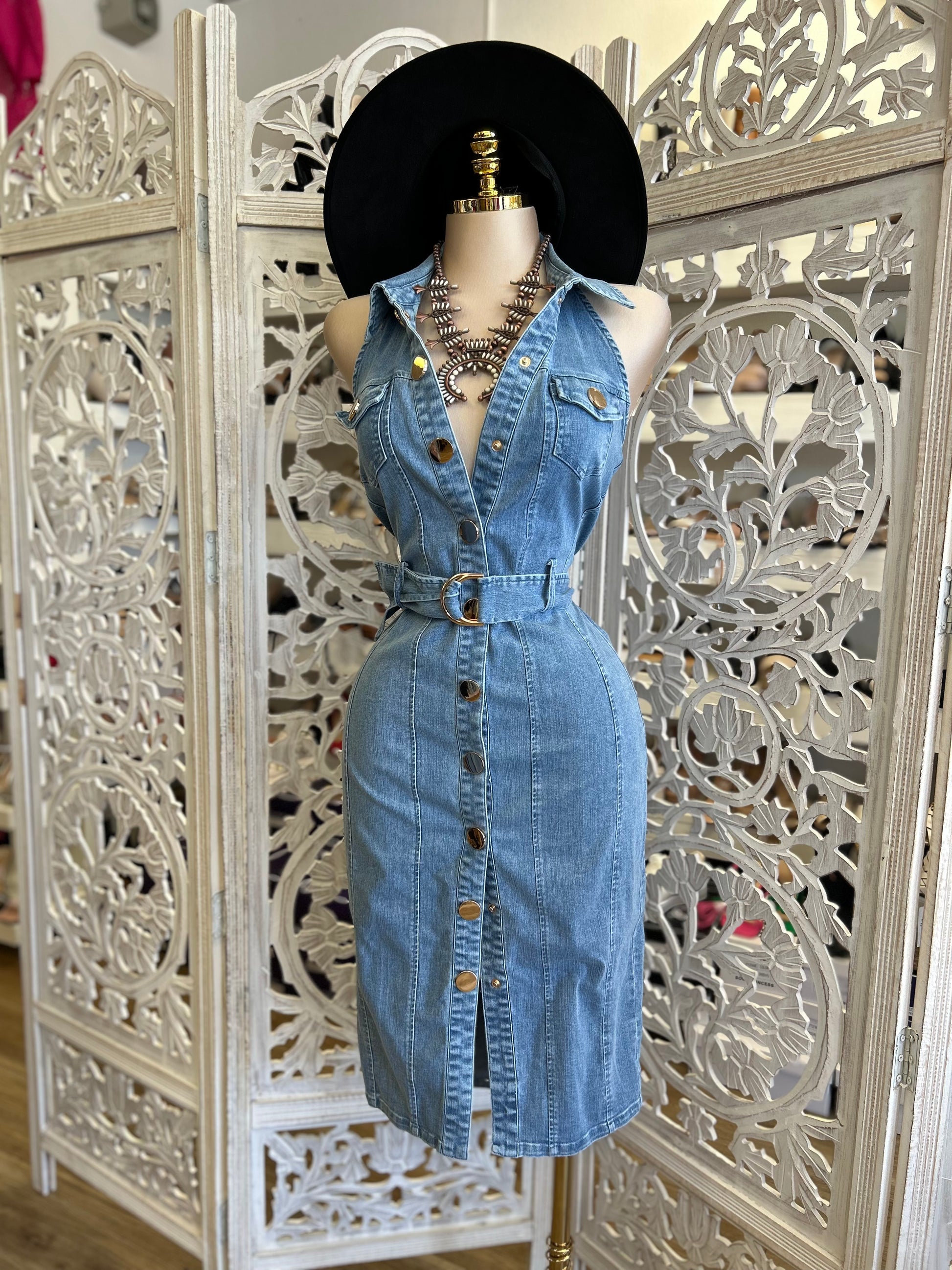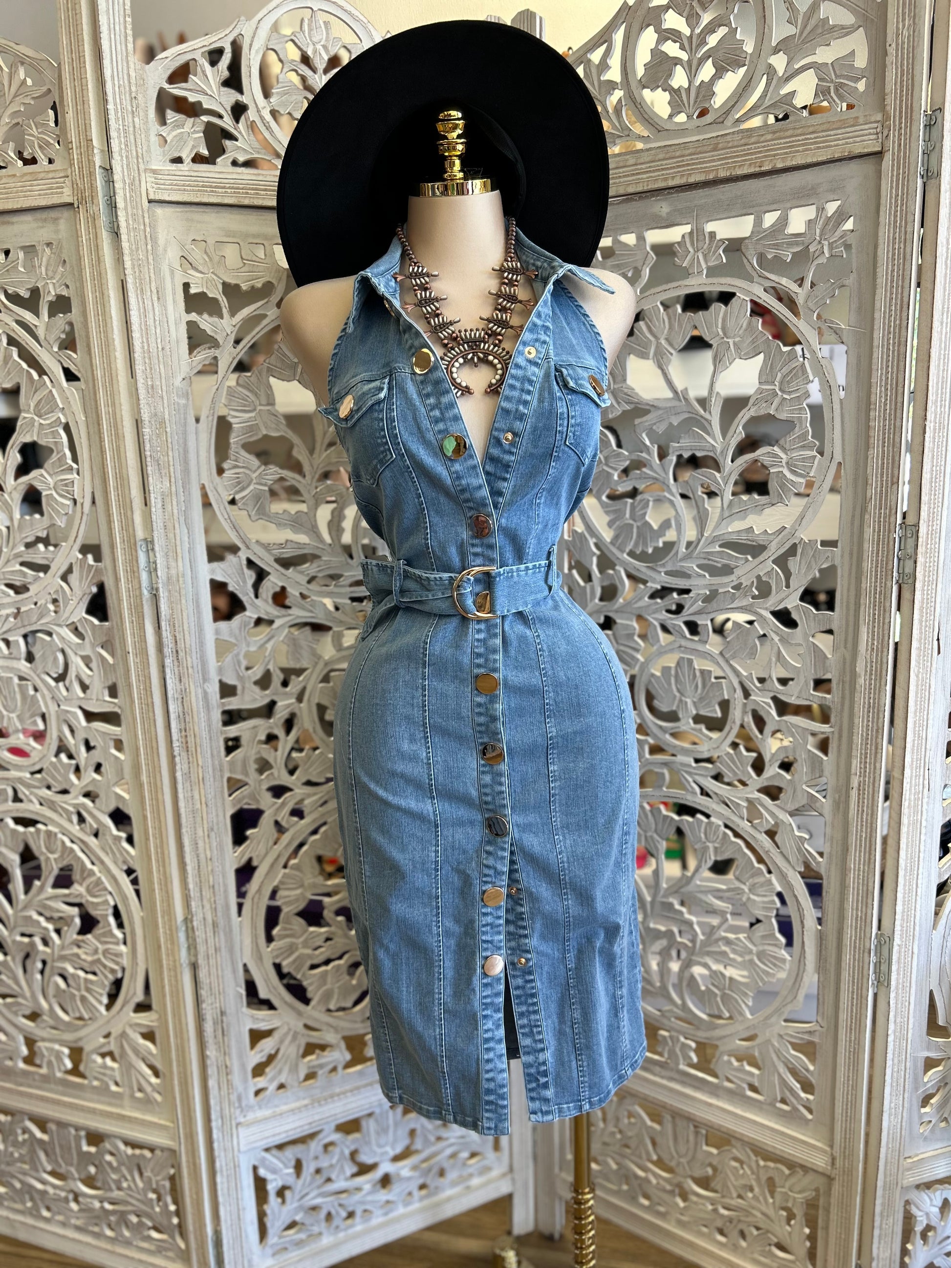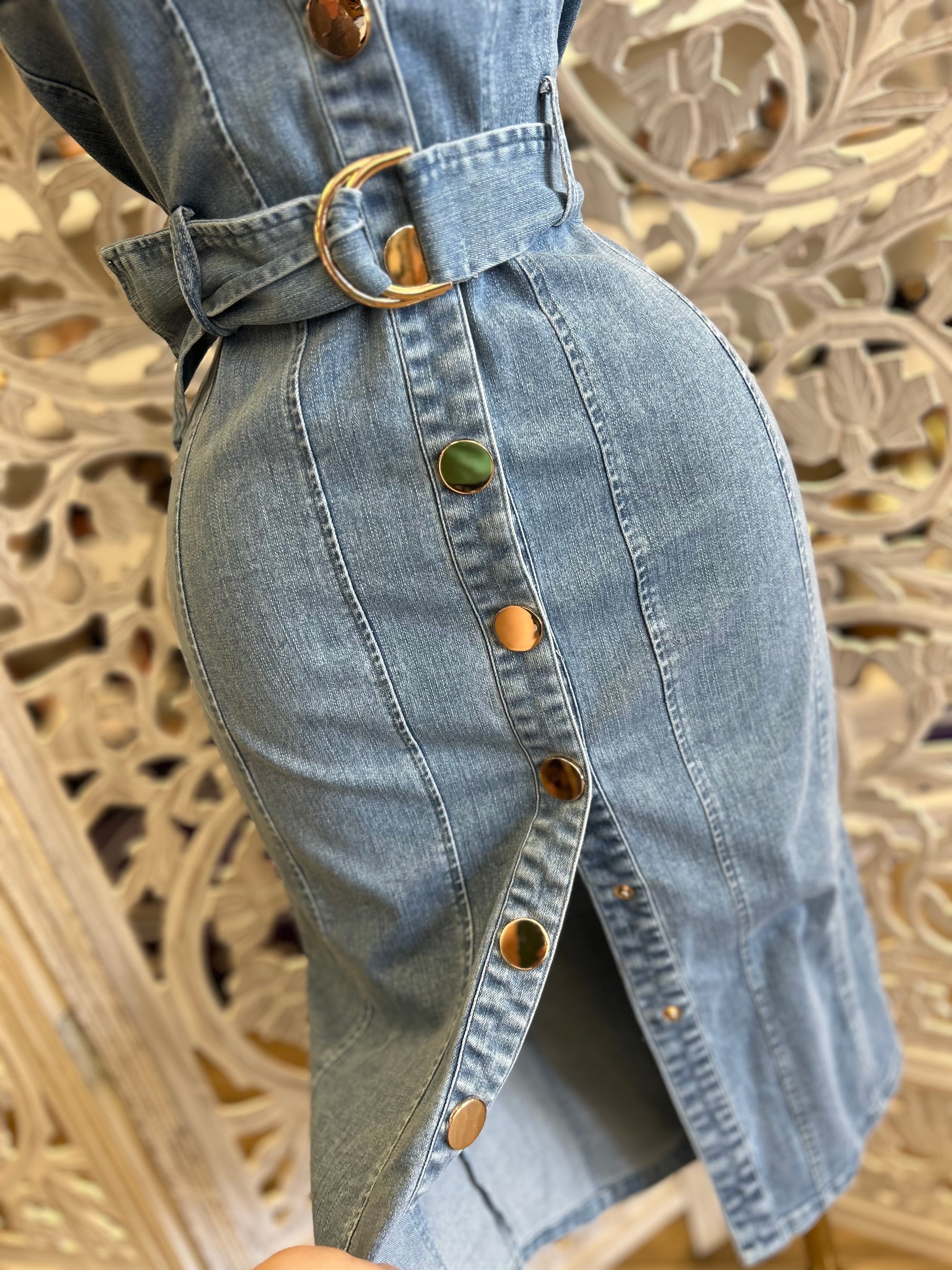 Collard Denim Button Up Dress - Estira Poco, Slightly Stretchy