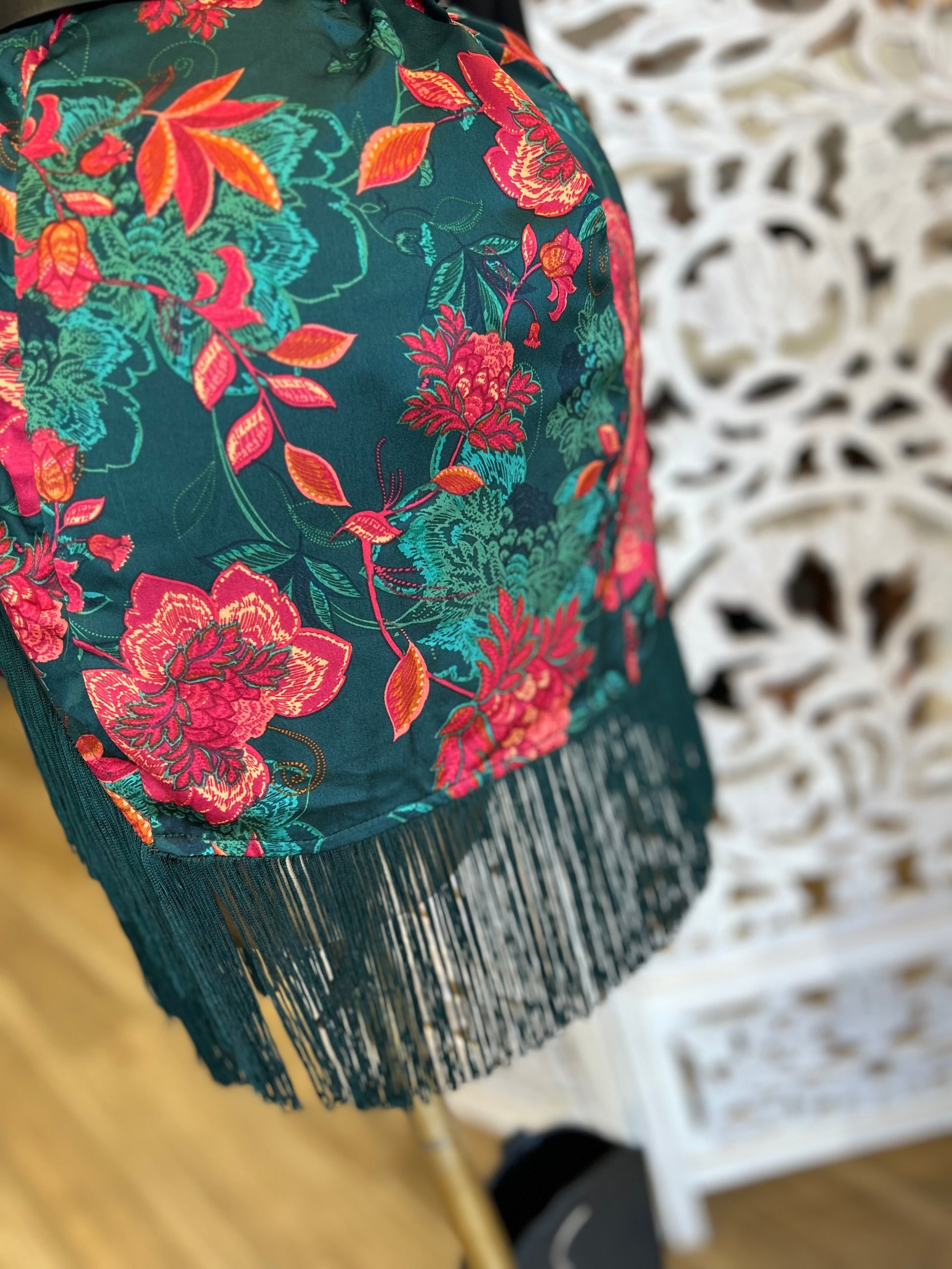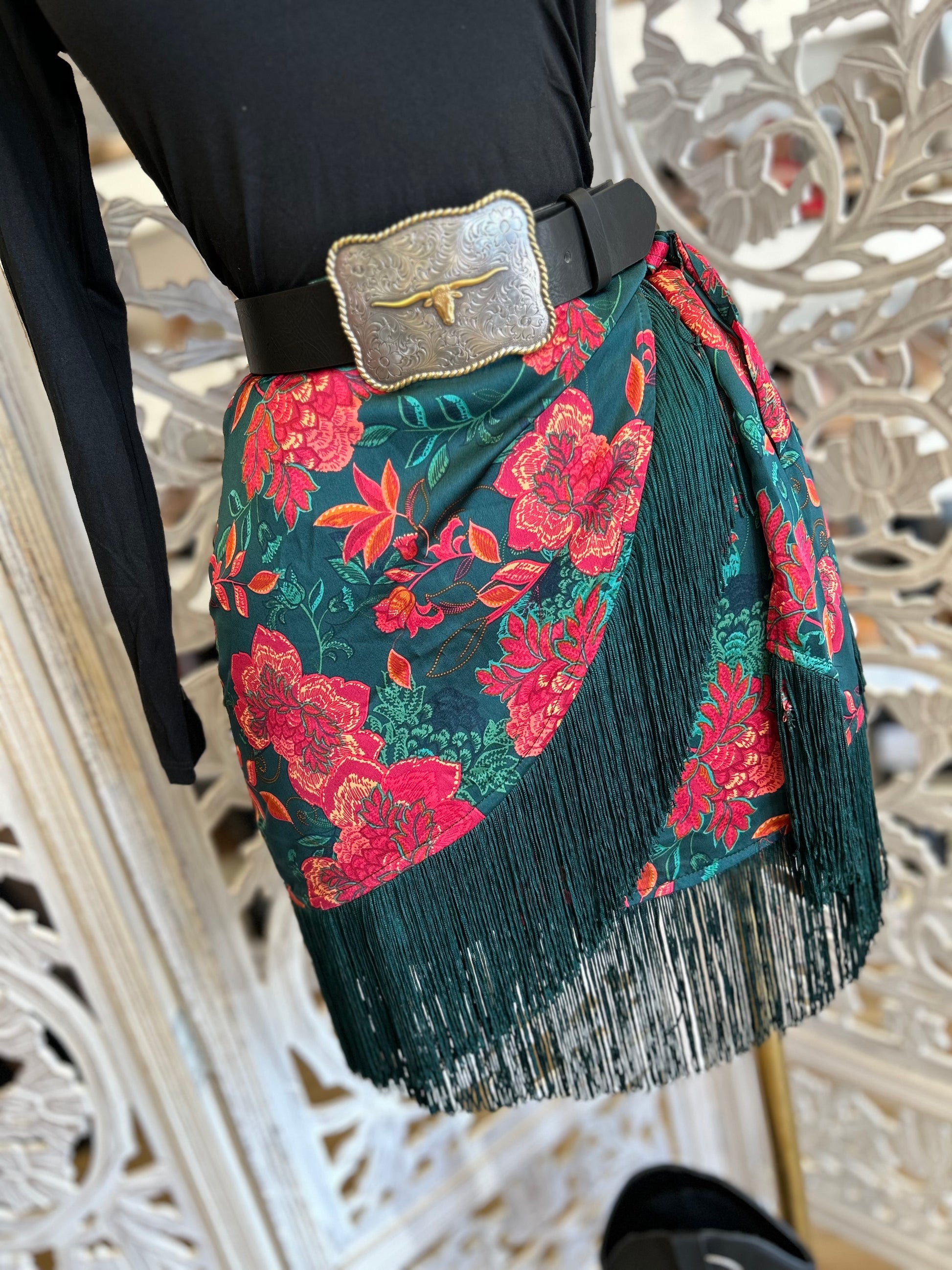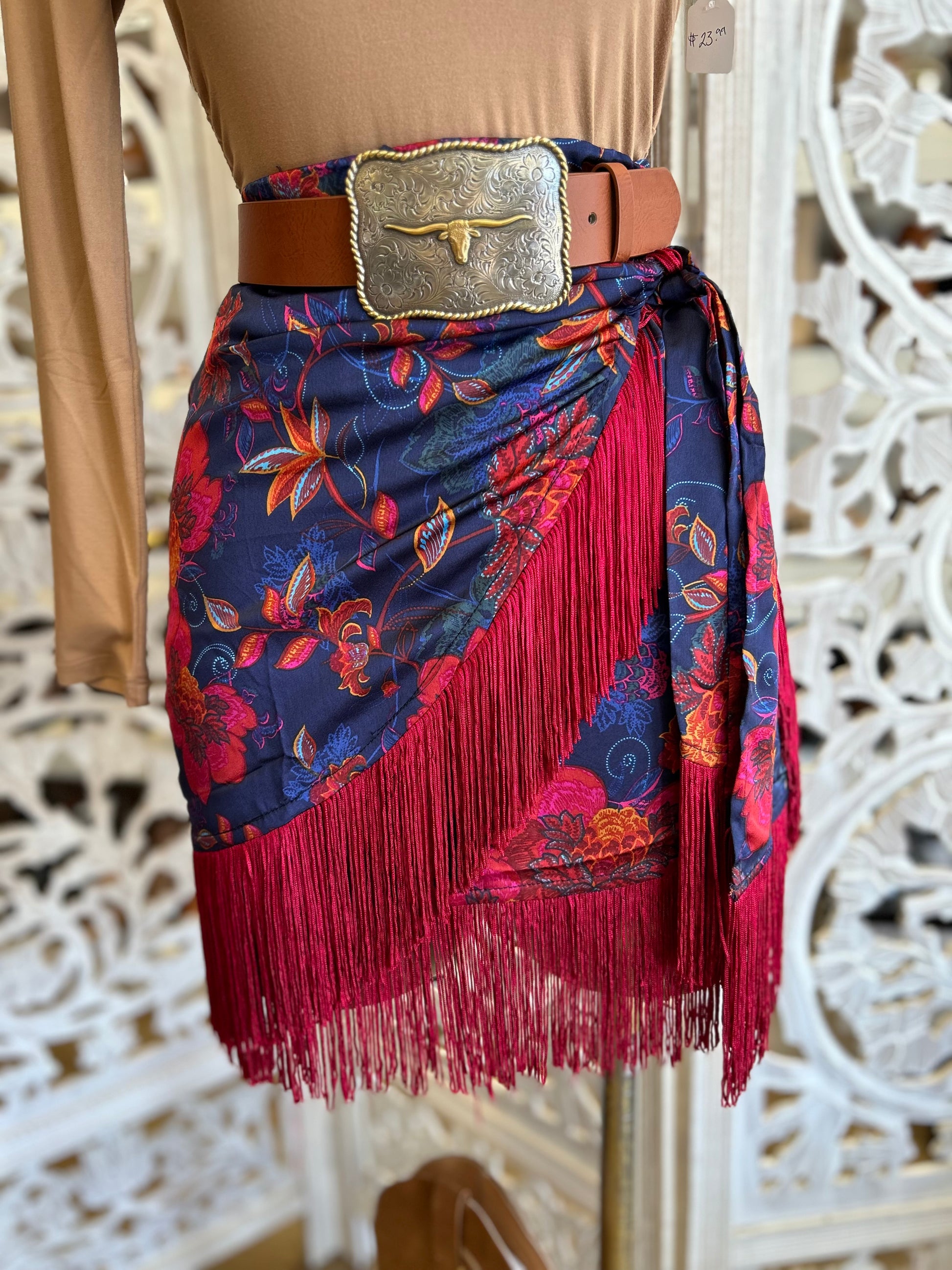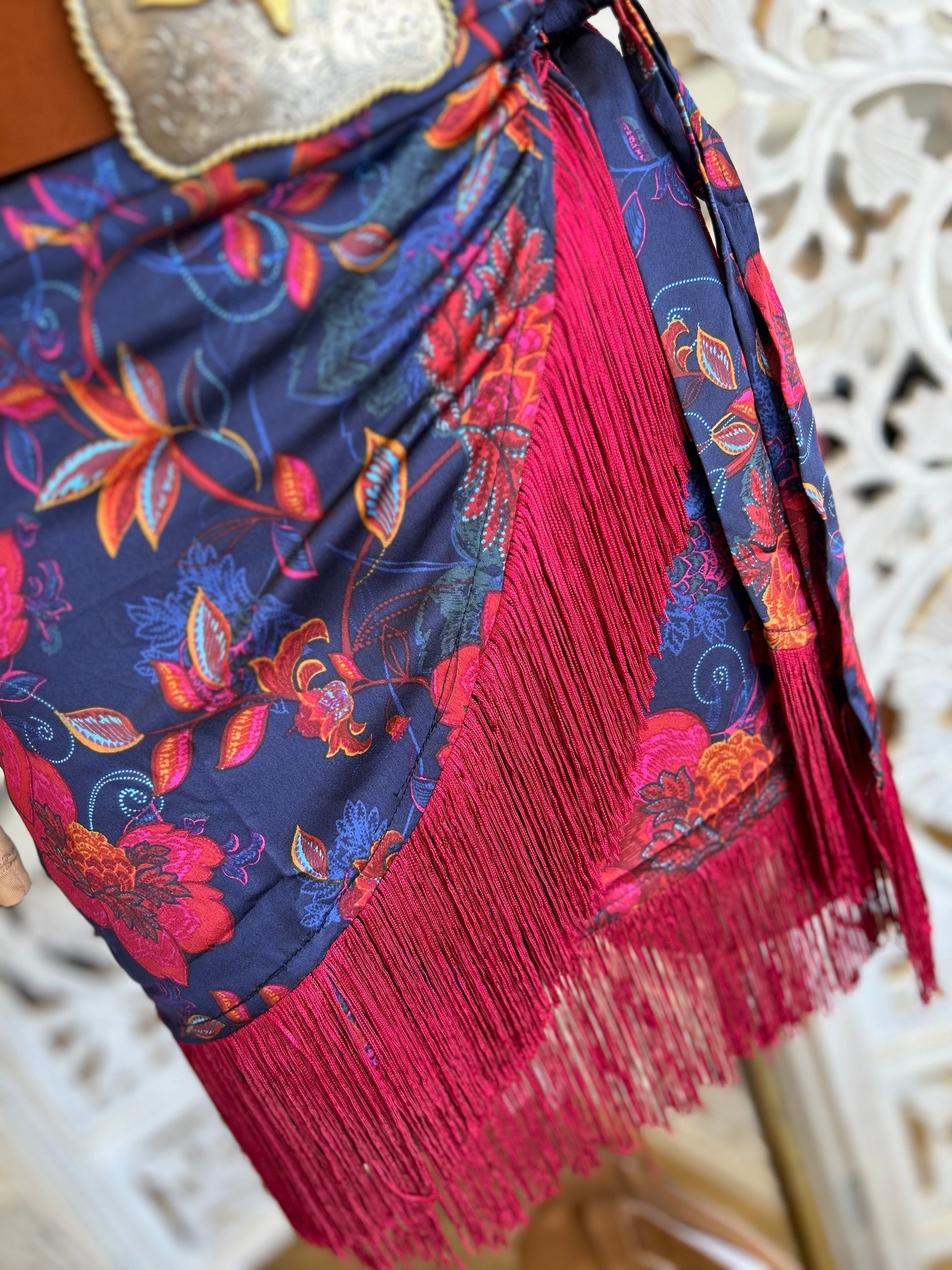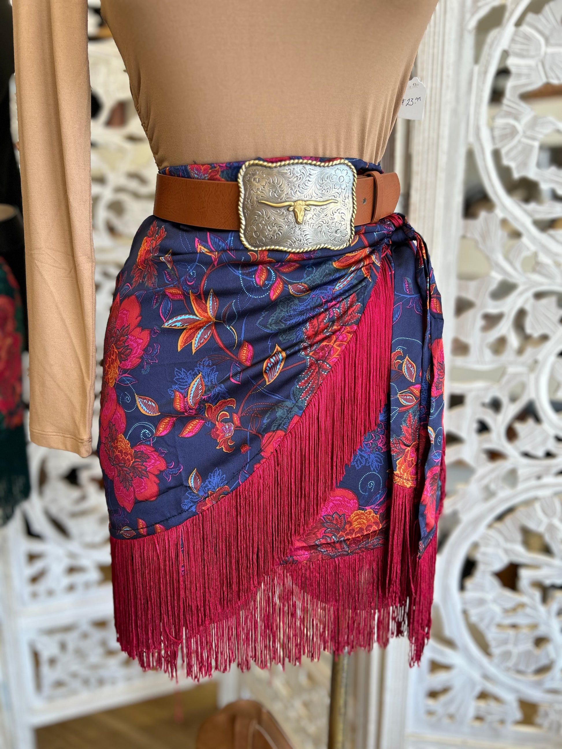 Fringe Draped Floral Skirt - Slightly Stretchy