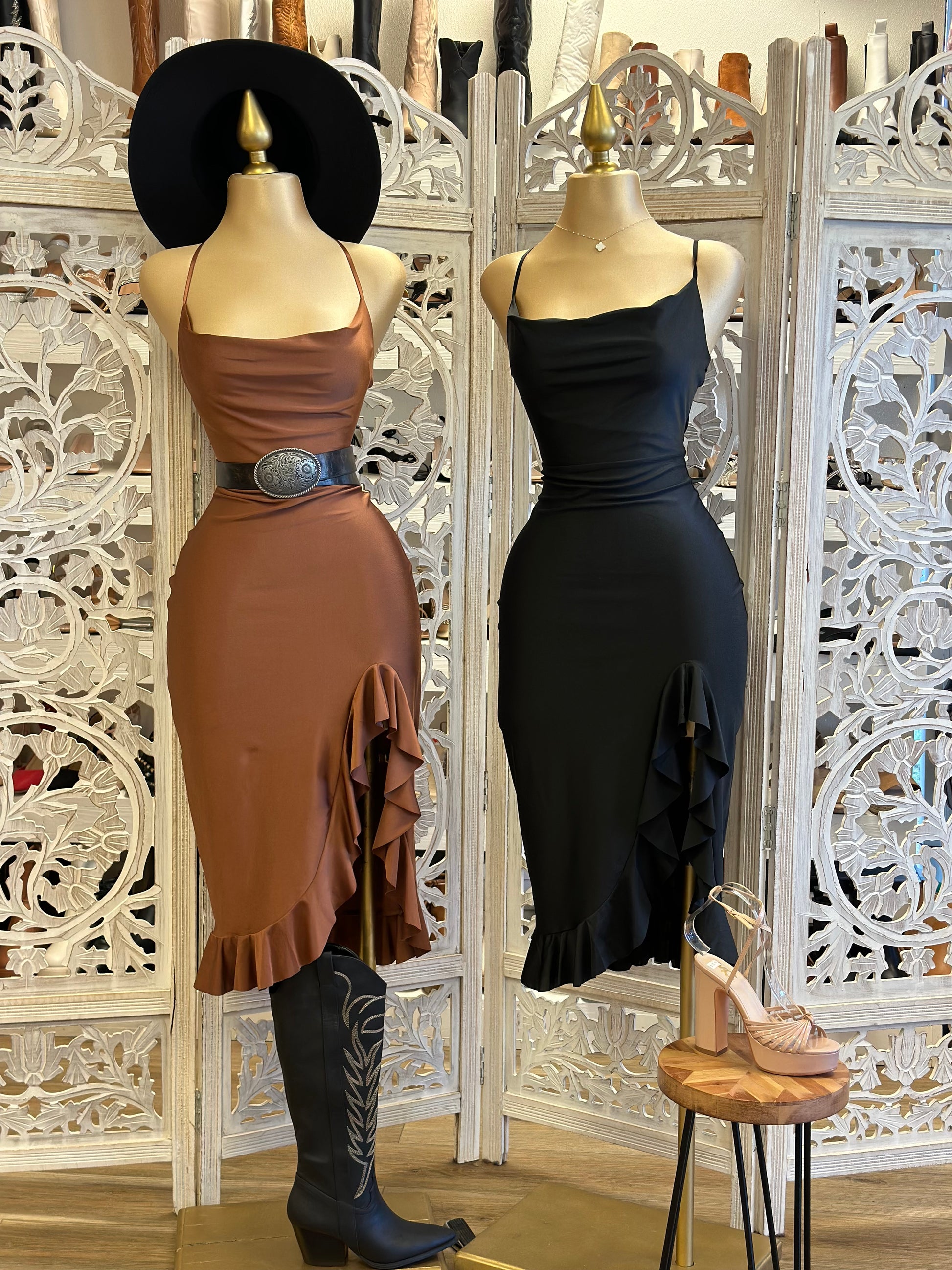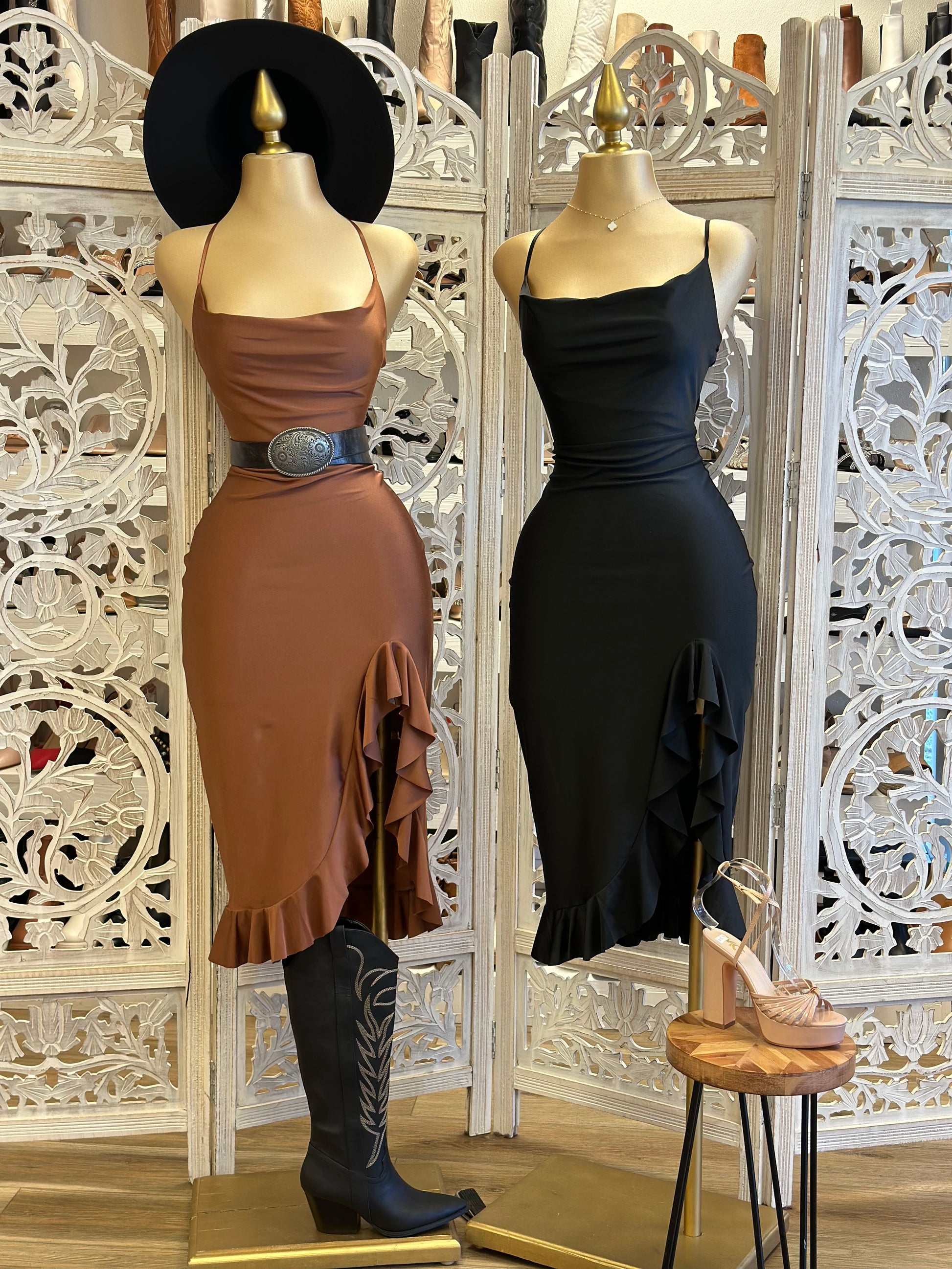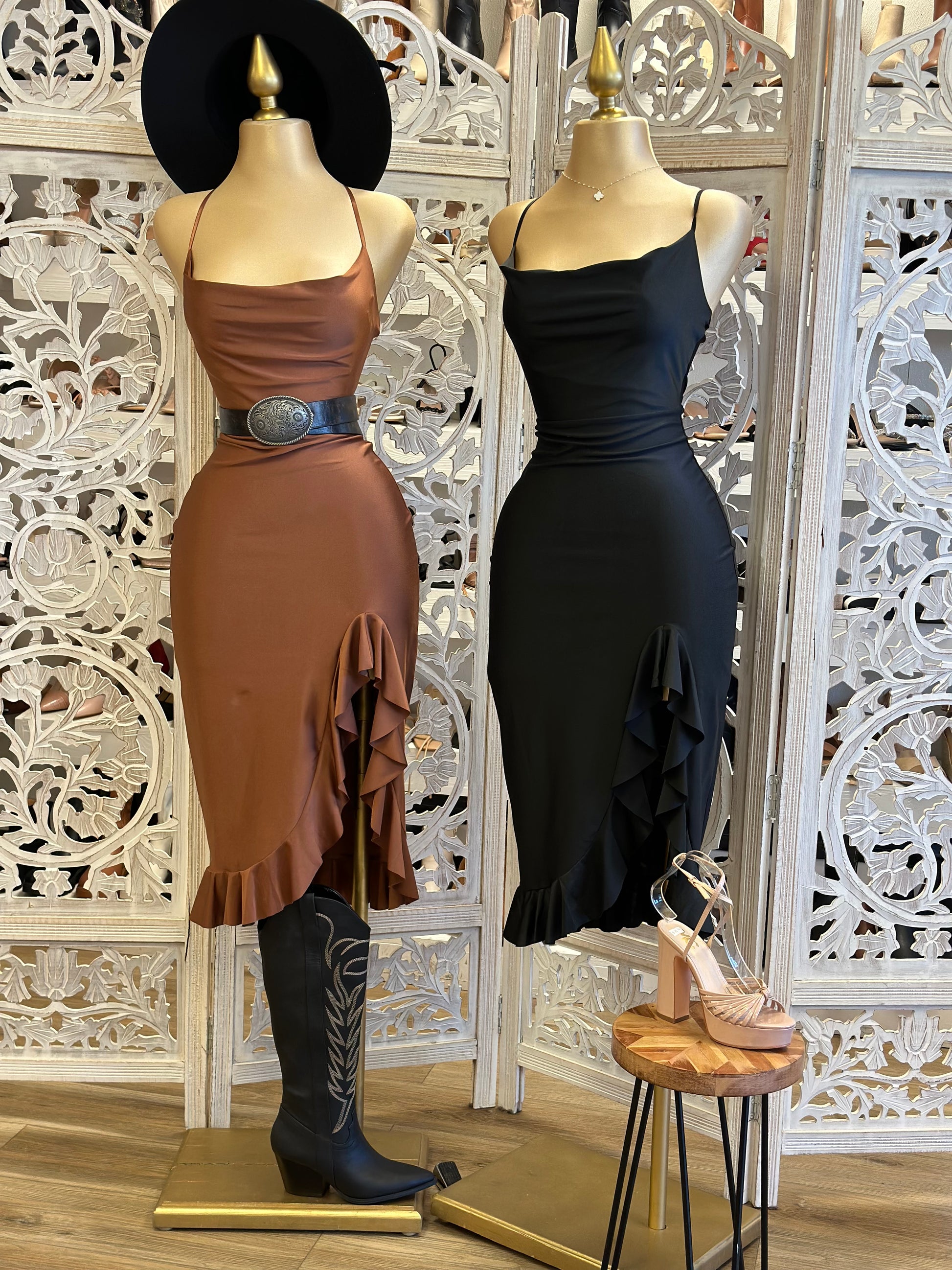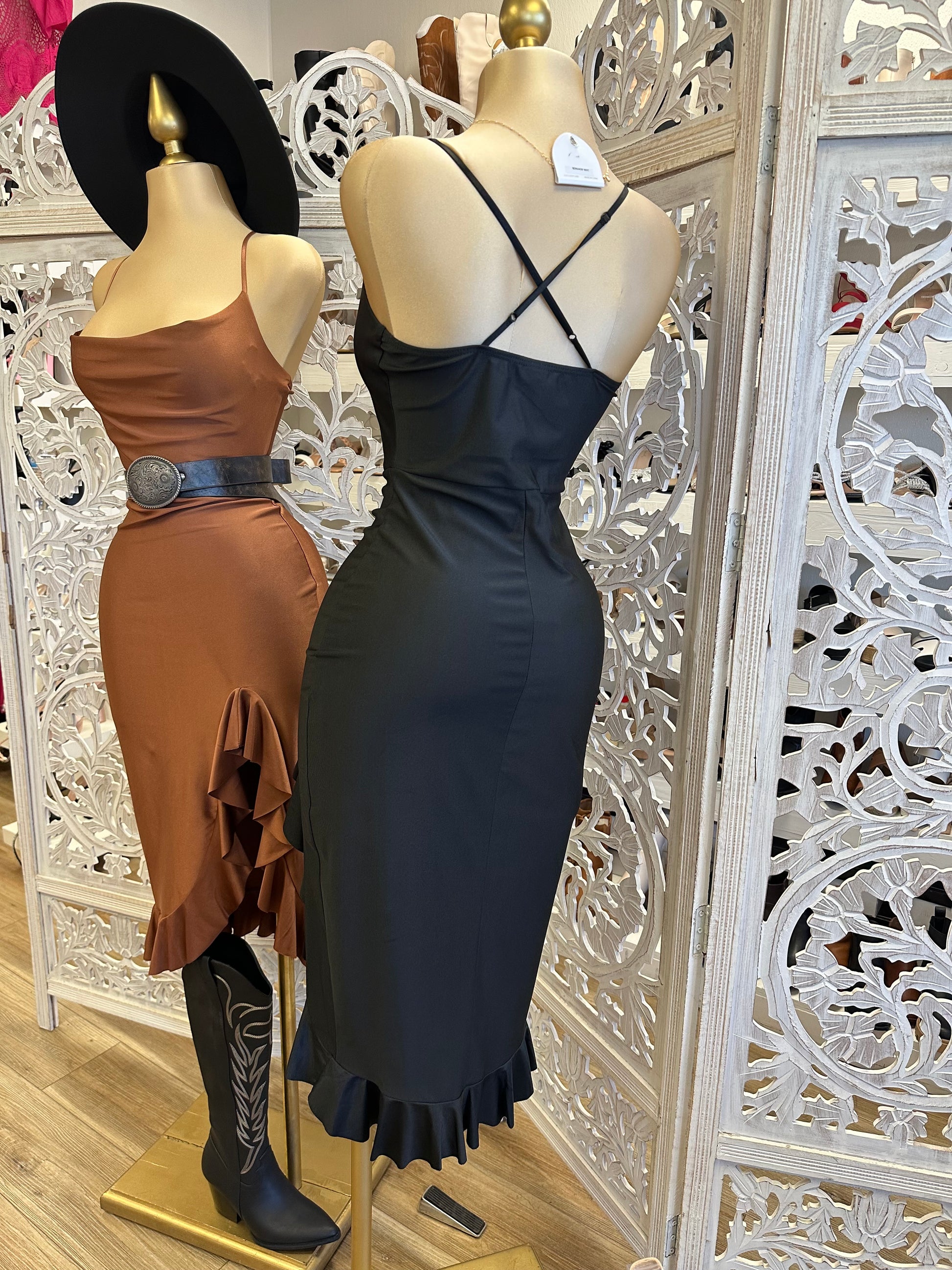 Cross Back Cowl Neck Ruffle Dress- Stretchy