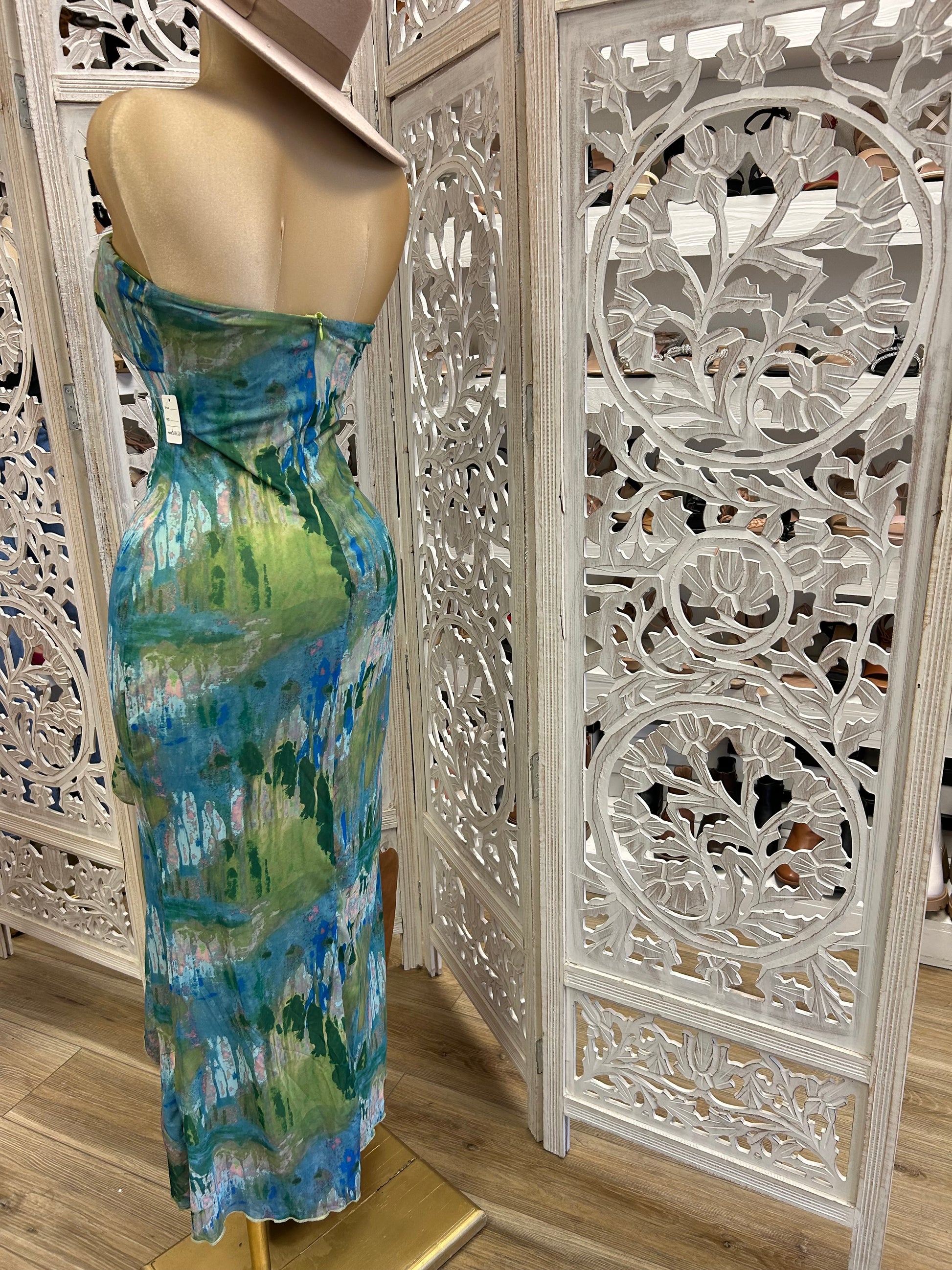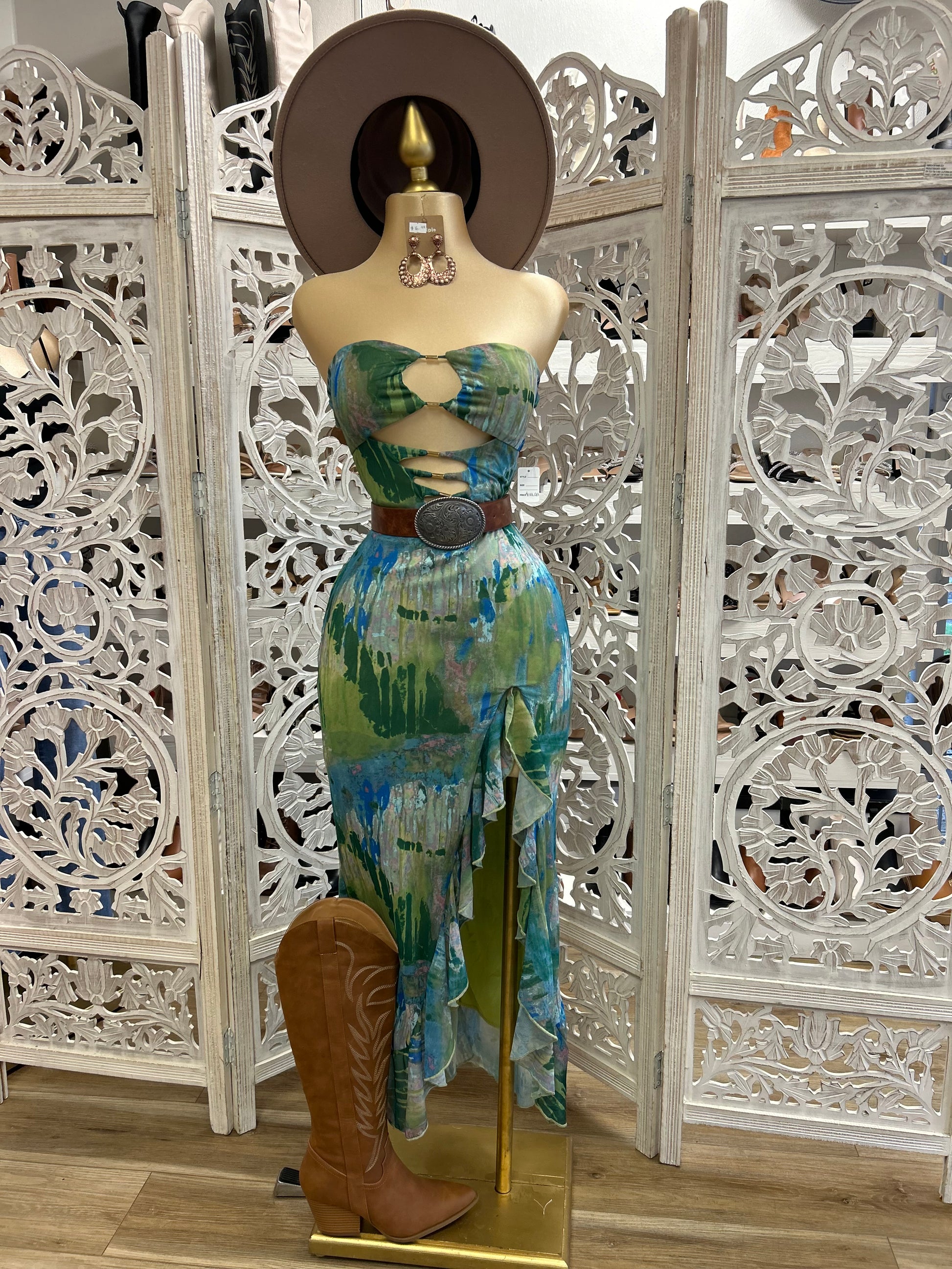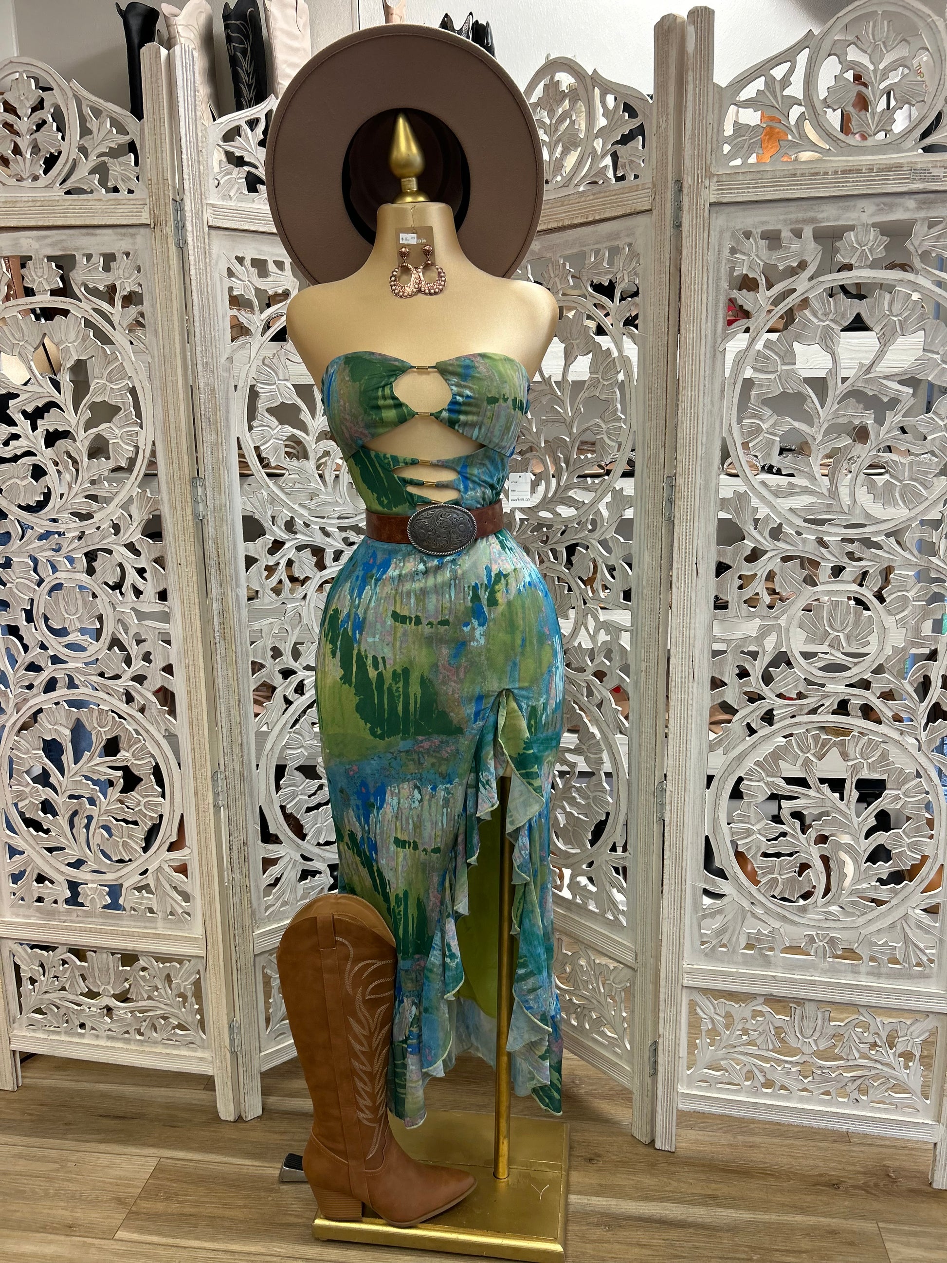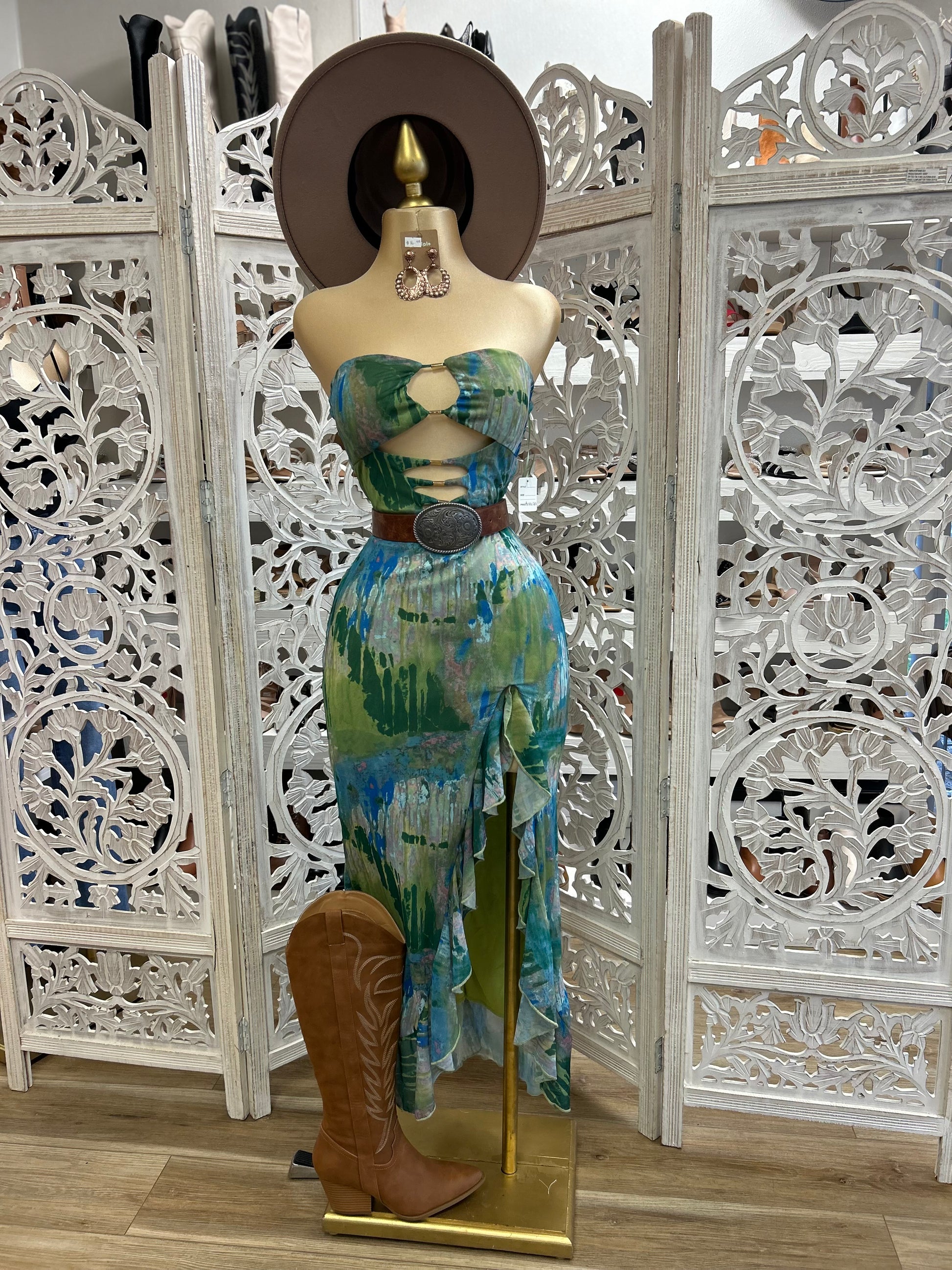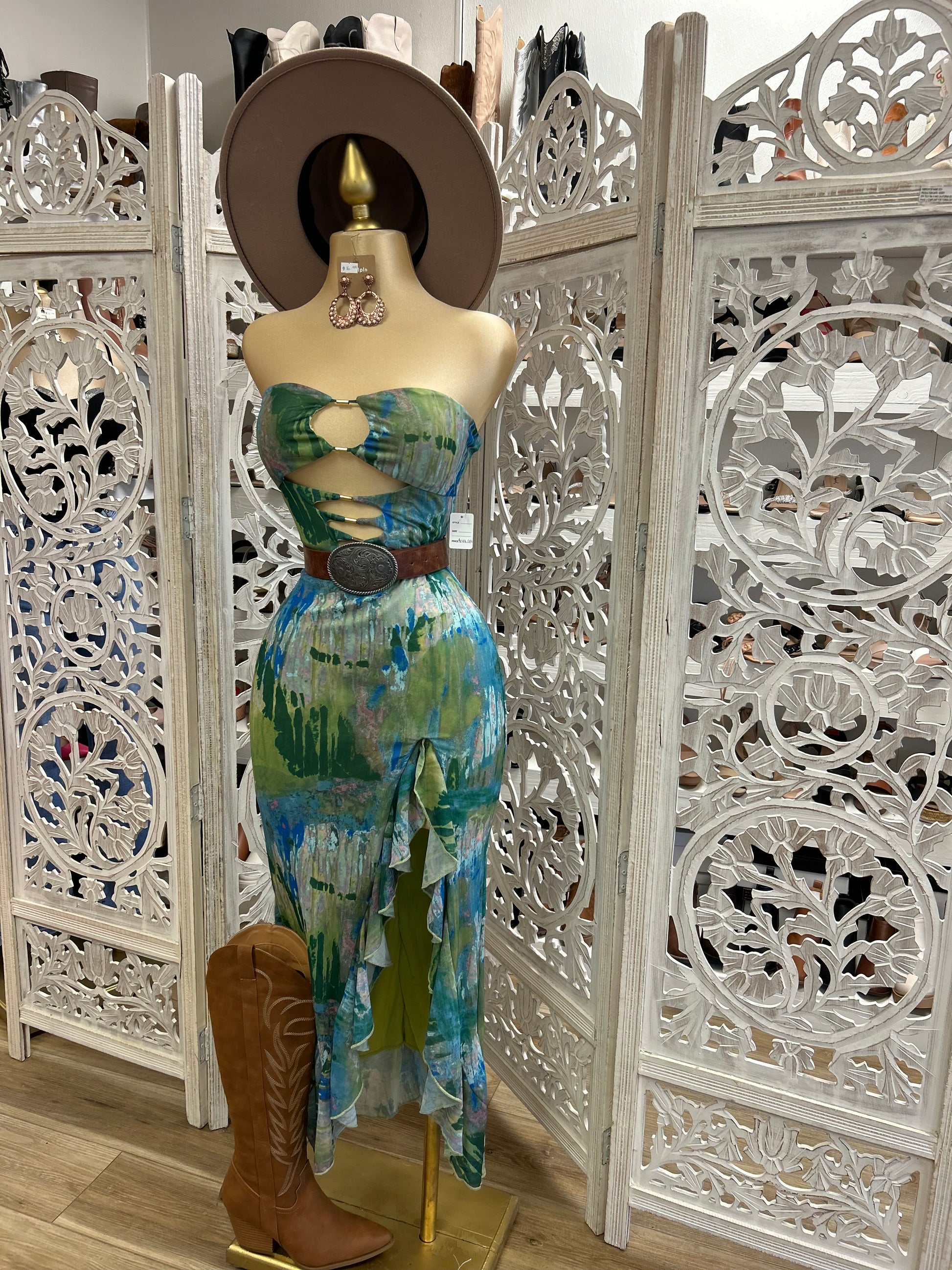 Cytout Strapless Green Pattern Ruffle Slit Dress- Stretchy