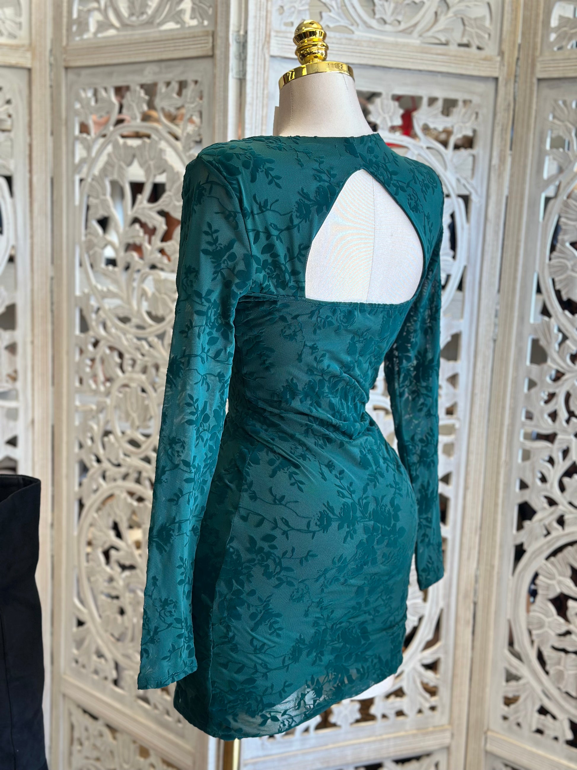 Deep Green Velvet Floral Cutout Mini Dress- Stretchy,Estira