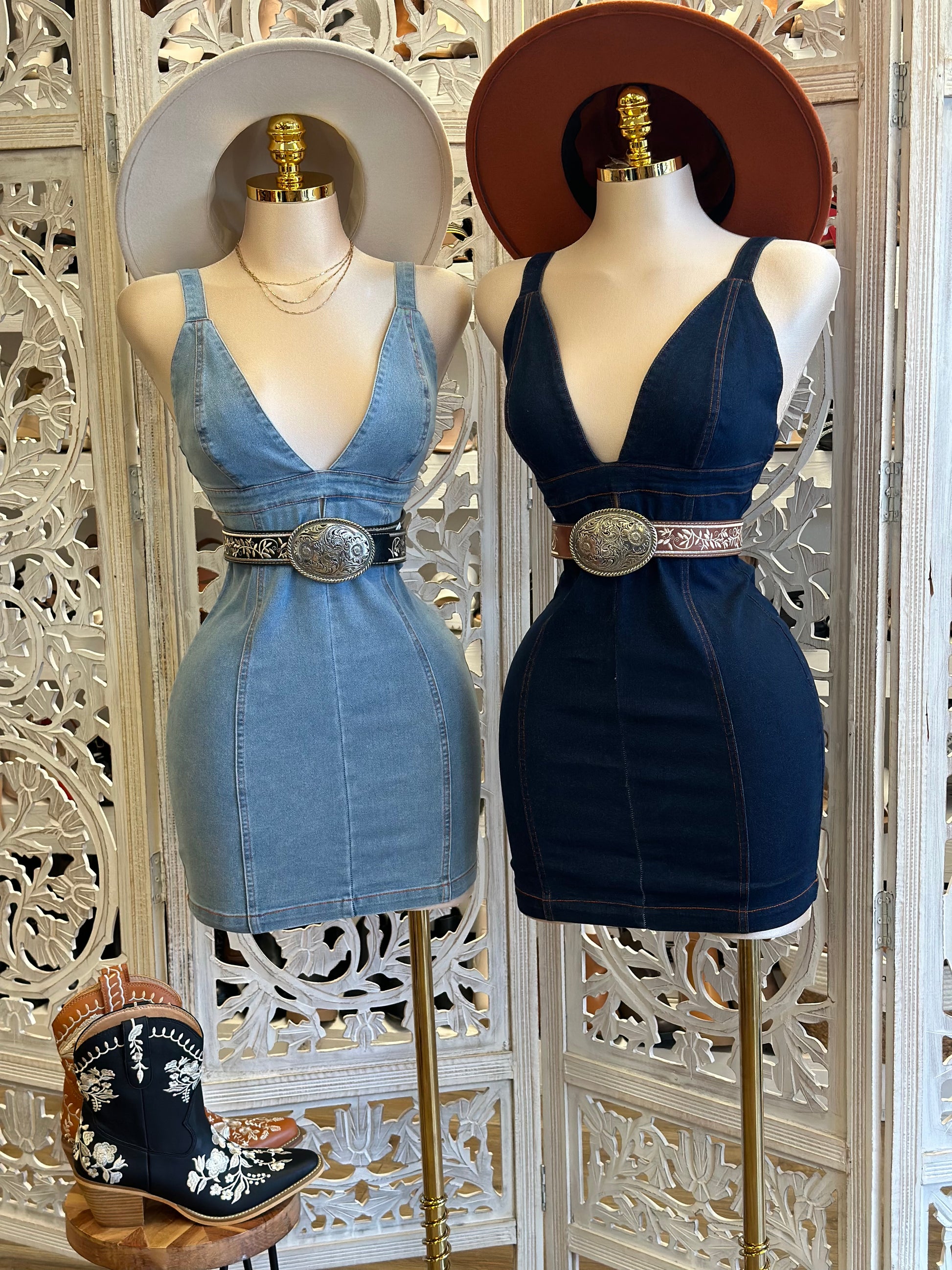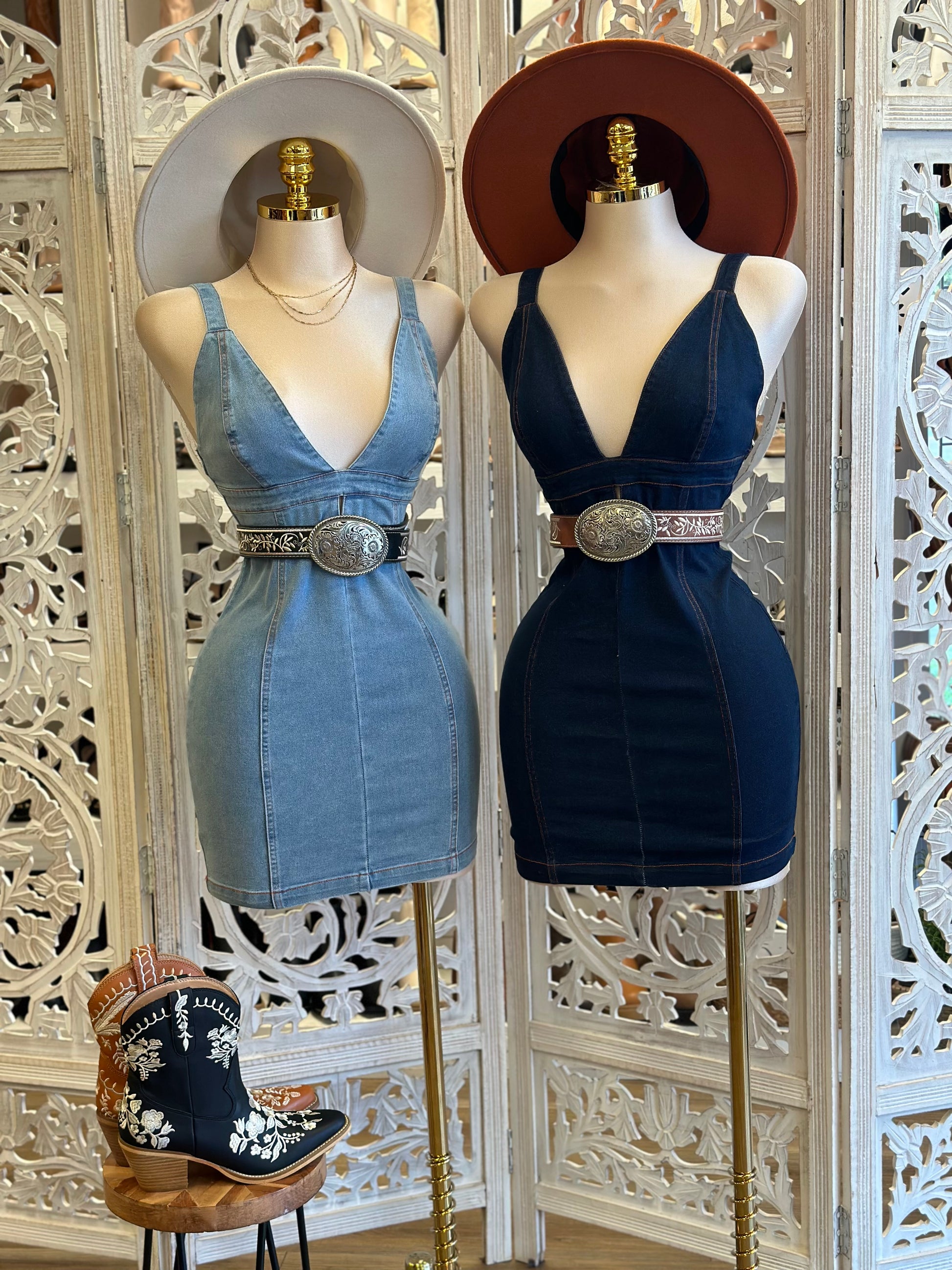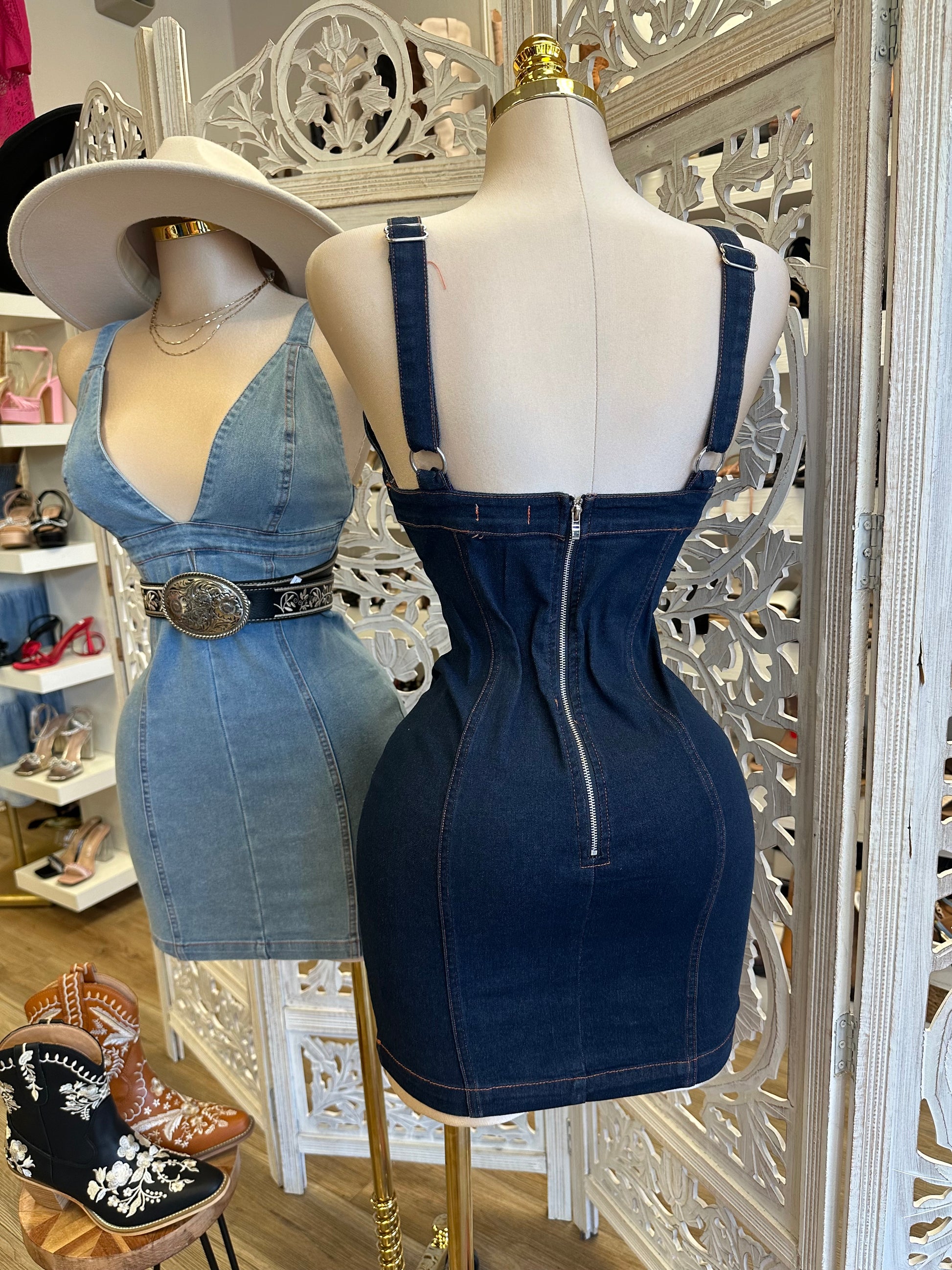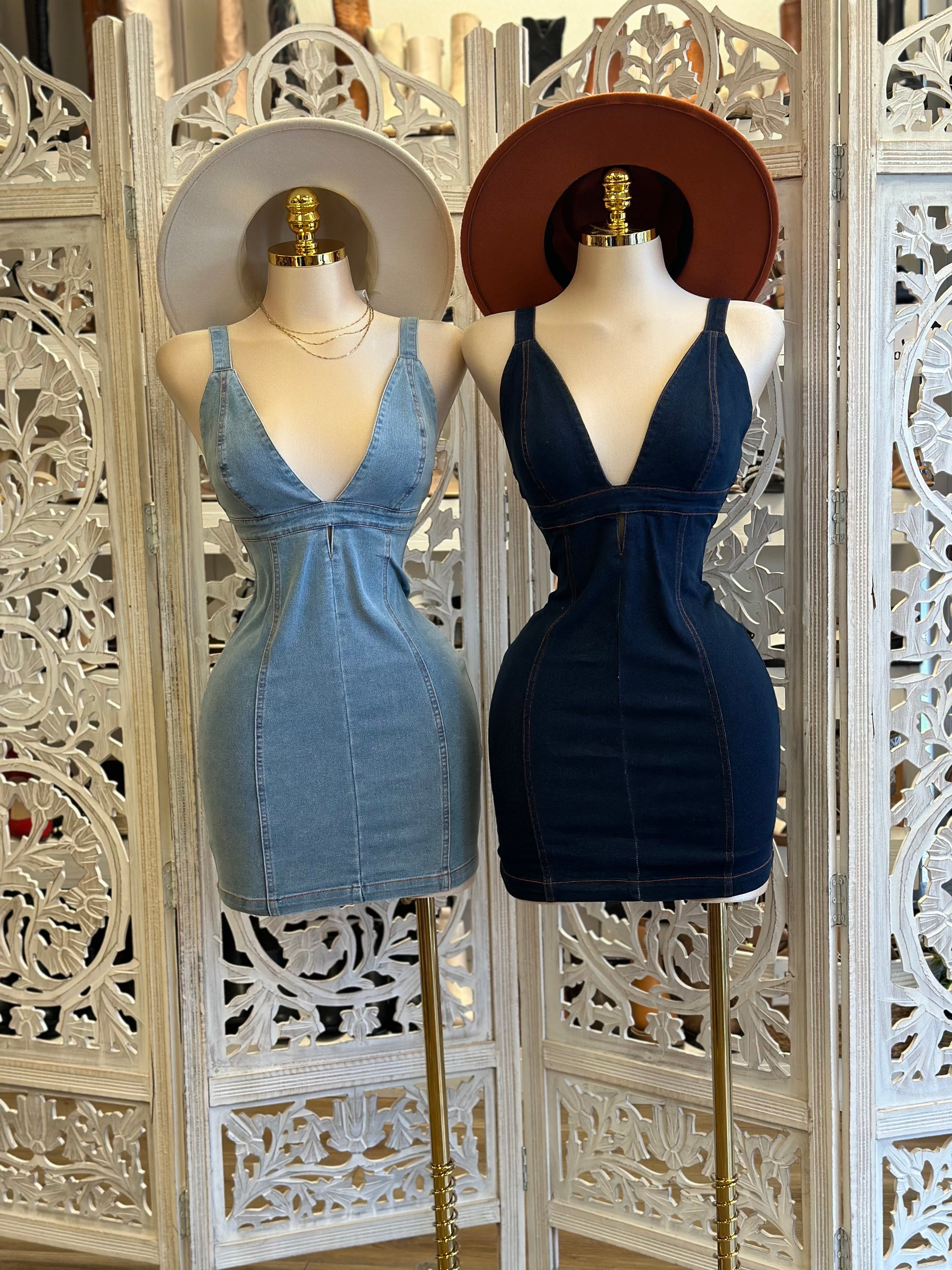 Deep V Mini Denim Dress- Not Stretchy, No Estira