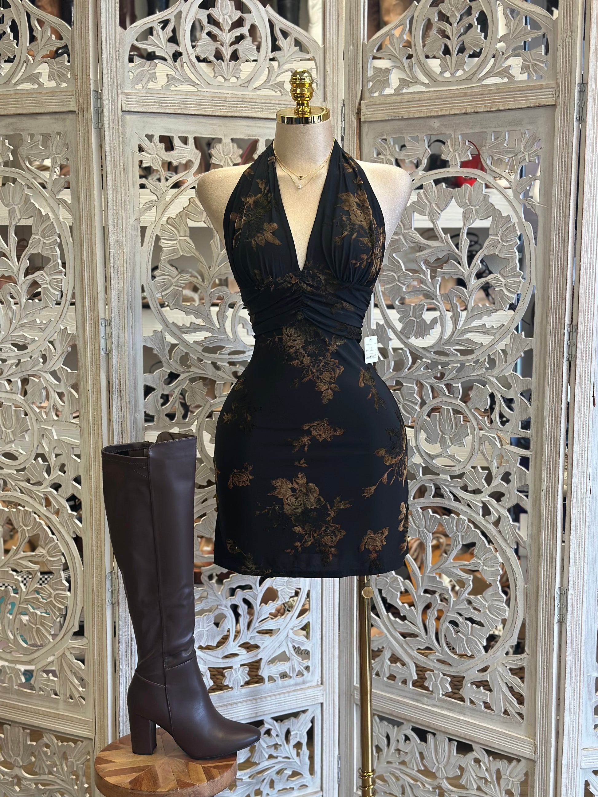 Deep V Open Back Fall Floral Mini Dress - Estira , Stretchy