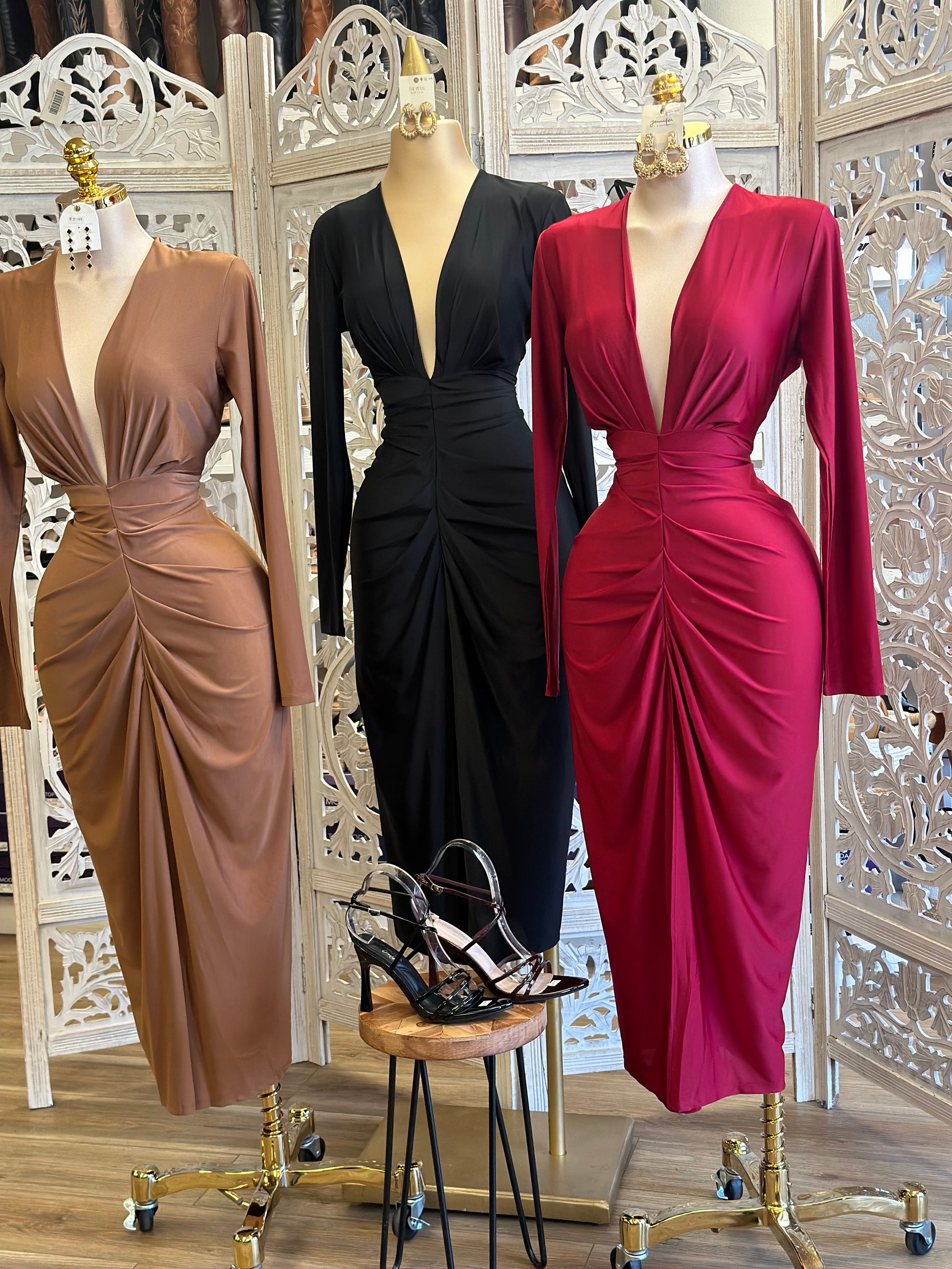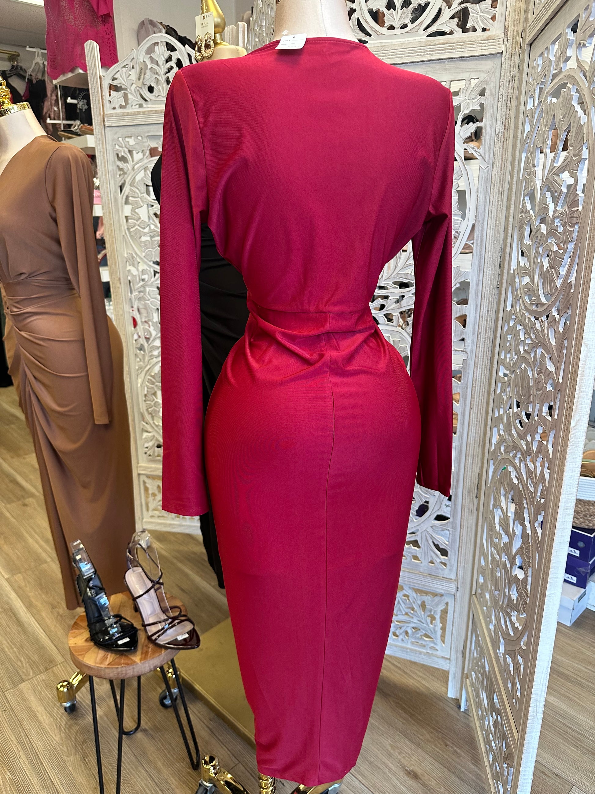 Deep V Ruched Long Sleeve Dress- Stretchy