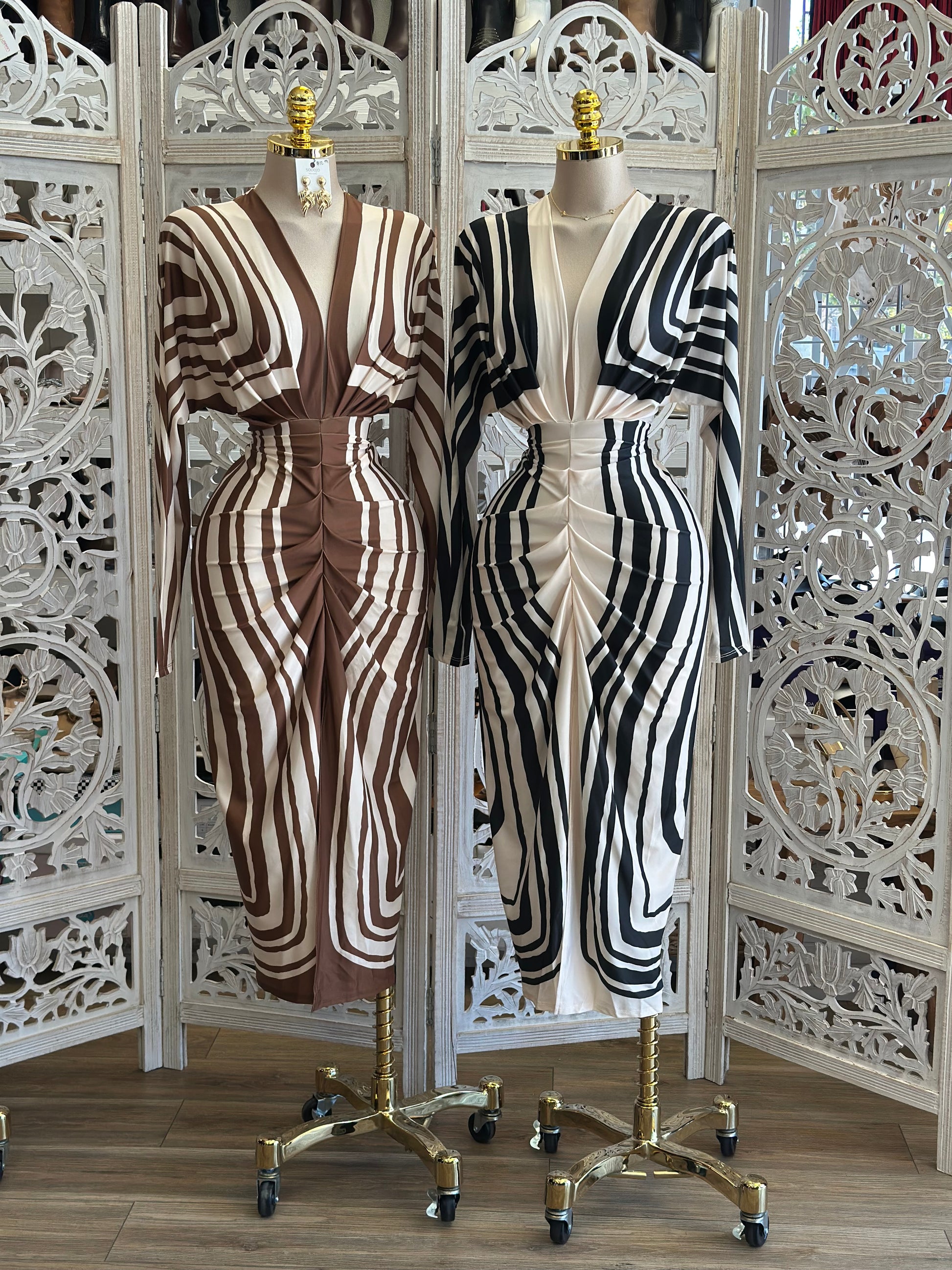 Deep V Striped Ruched Dress- Stretchy,Estira