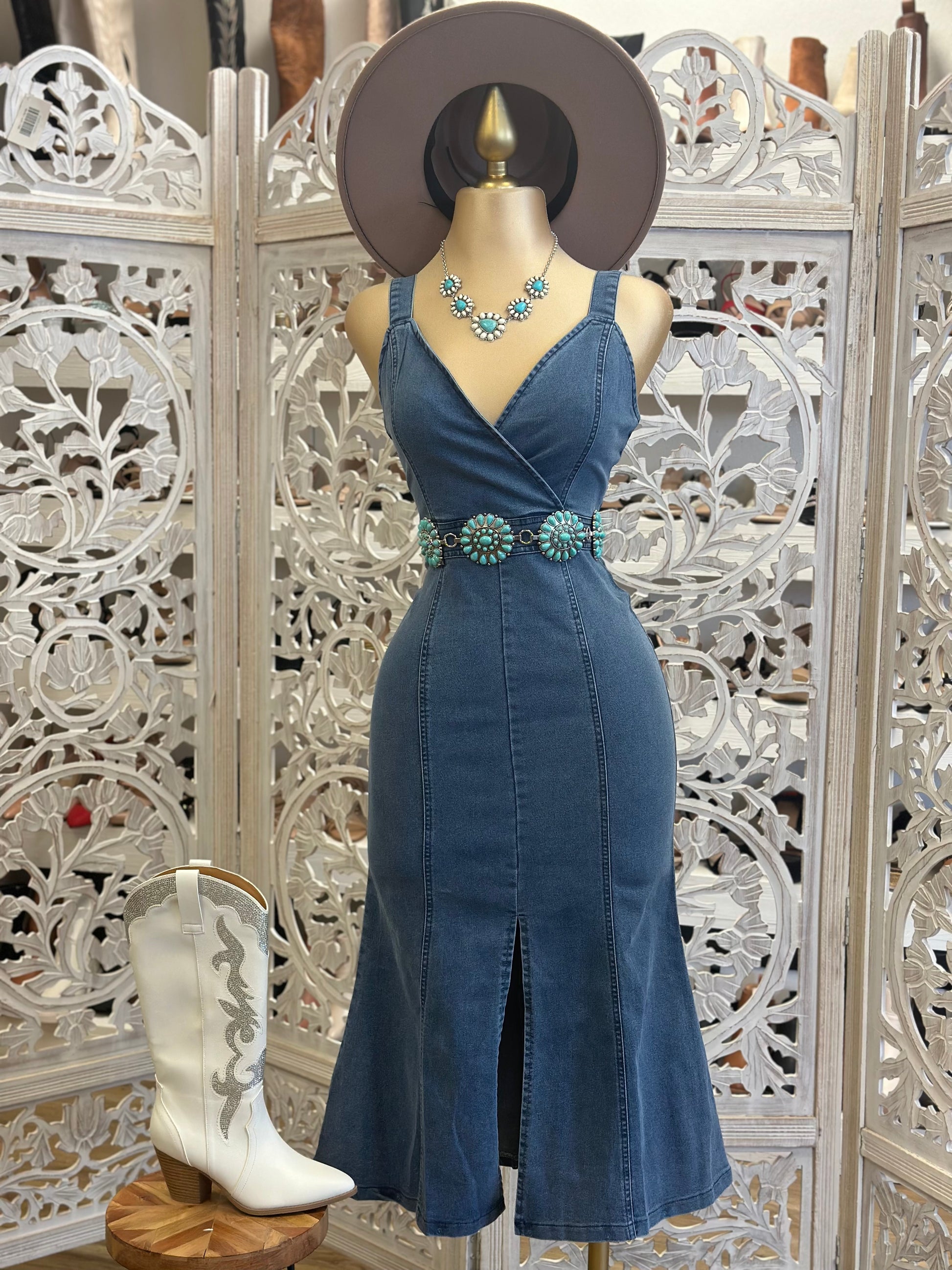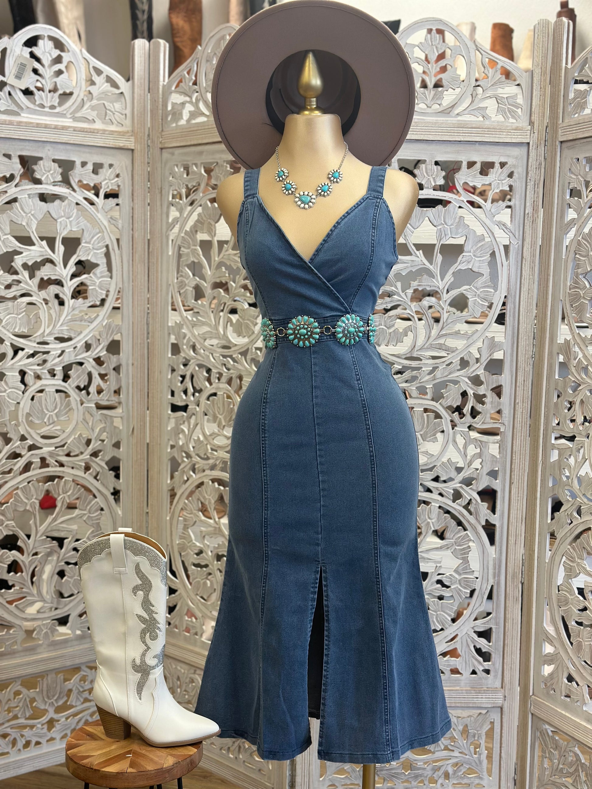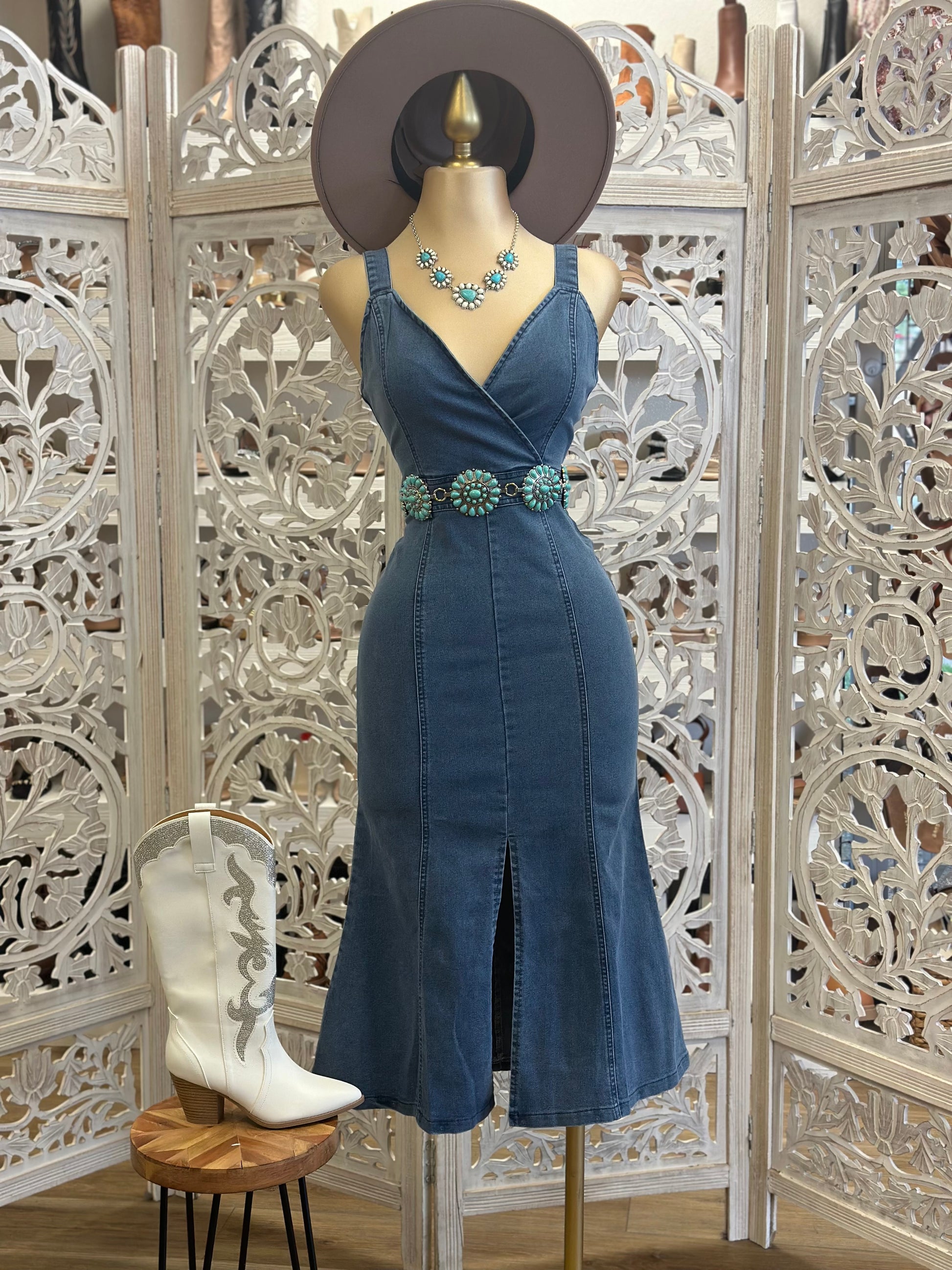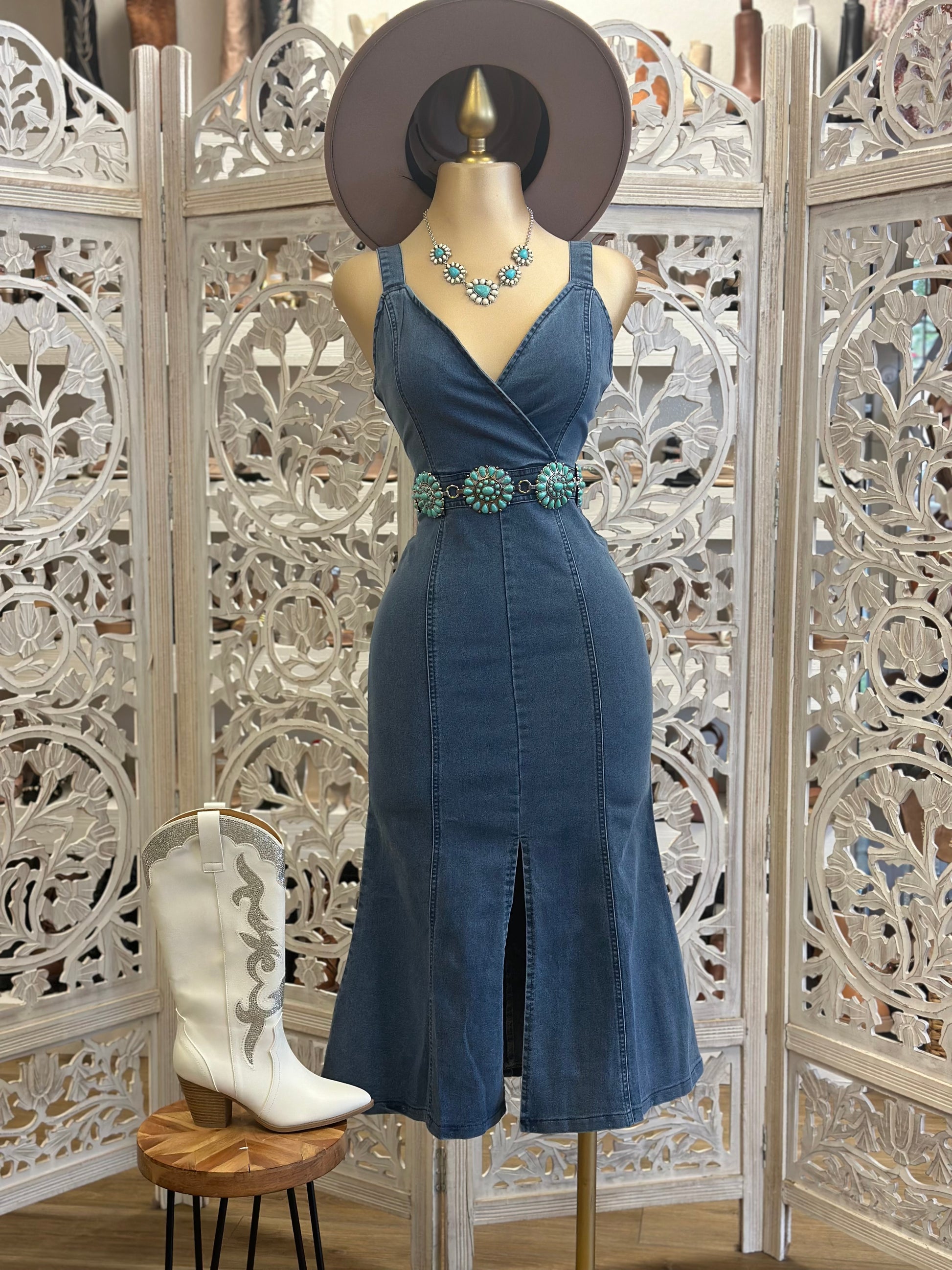 Denim Cross Fromt Midi Dress- Slightly Stretchy