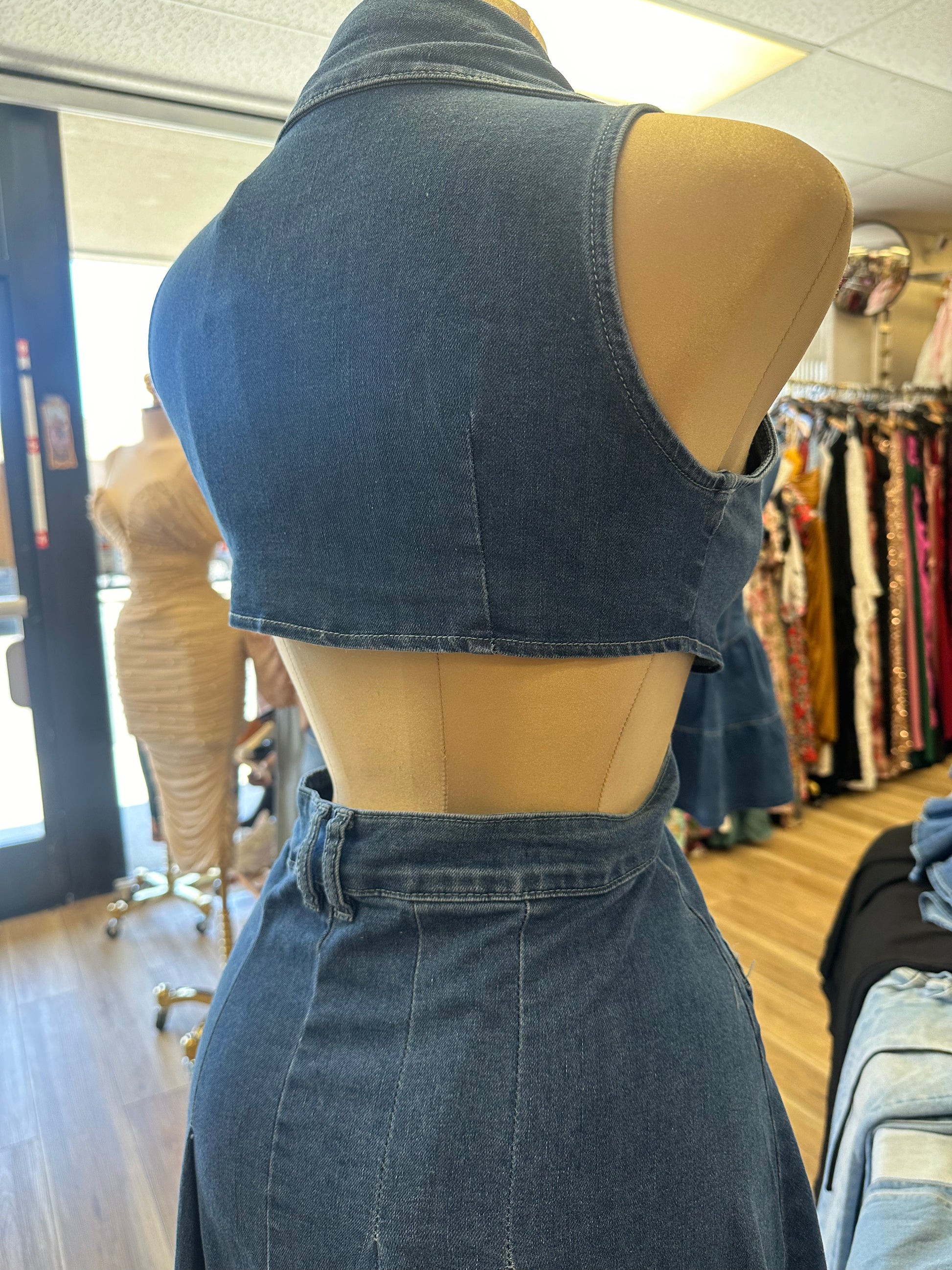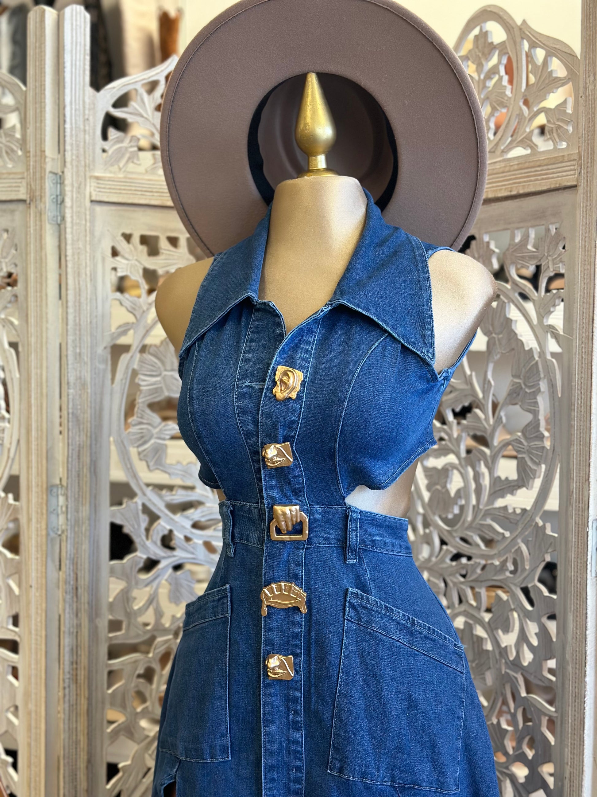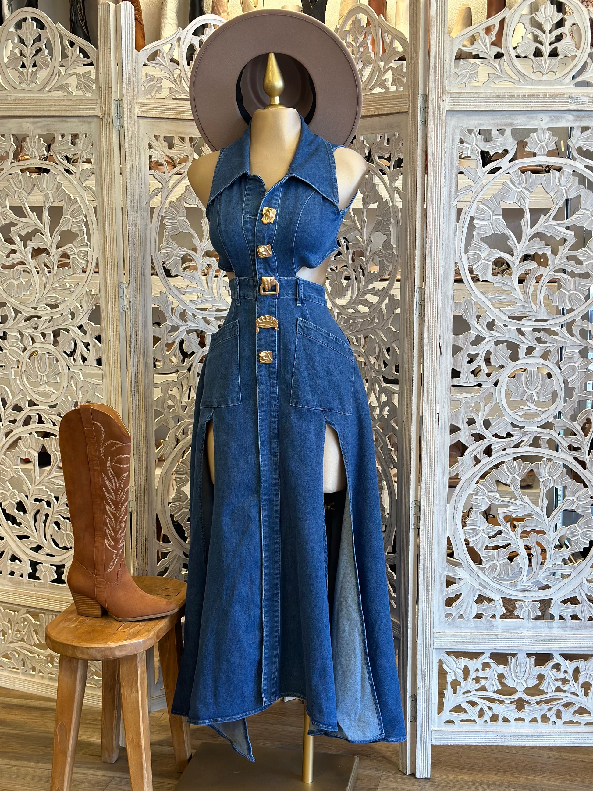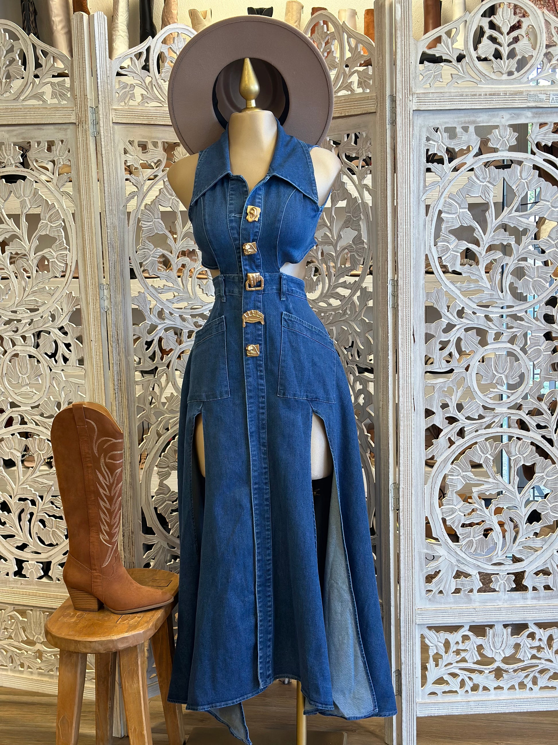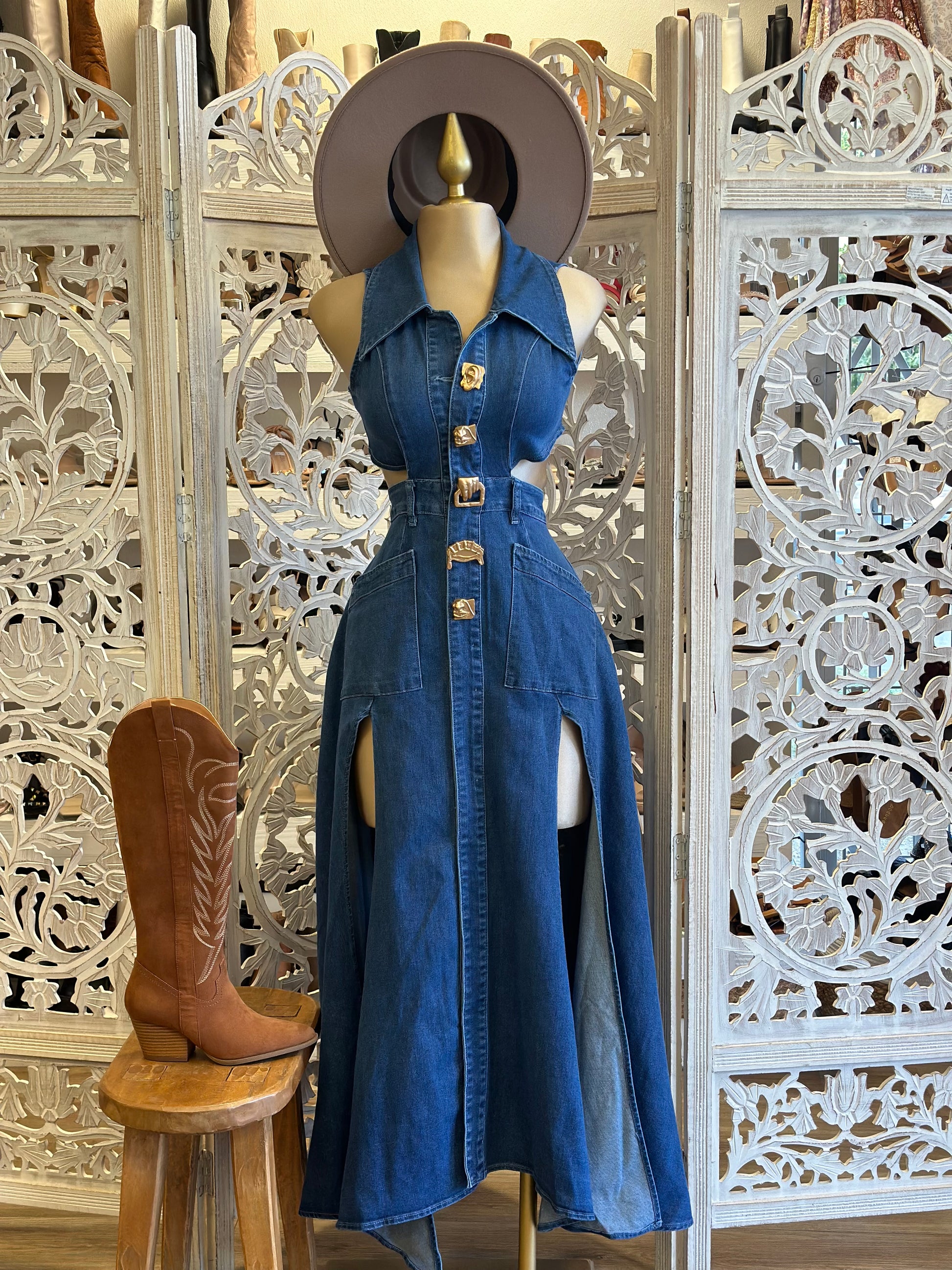 Denim Cutout Collard Maxi Dress- Slightly Stretchy