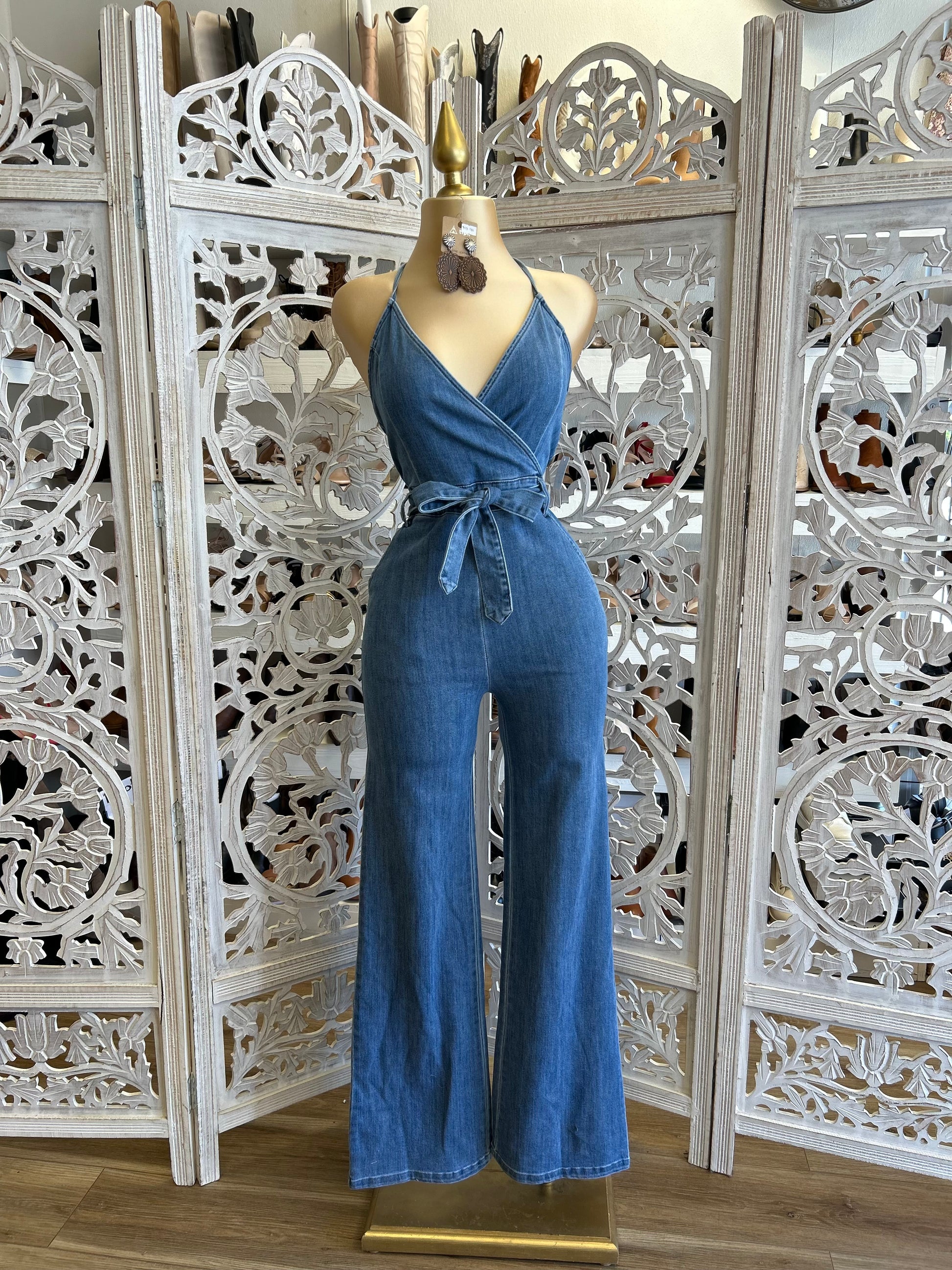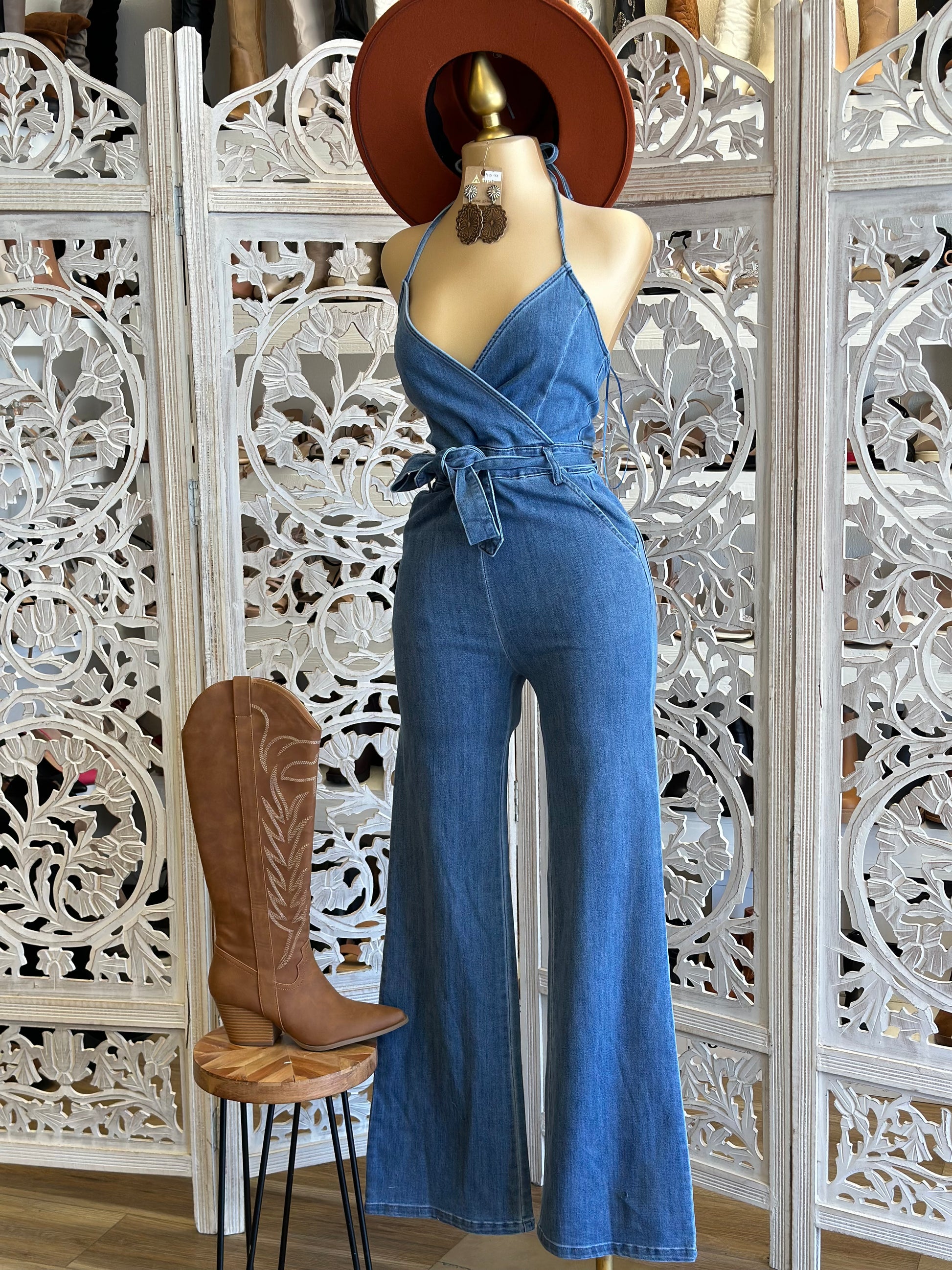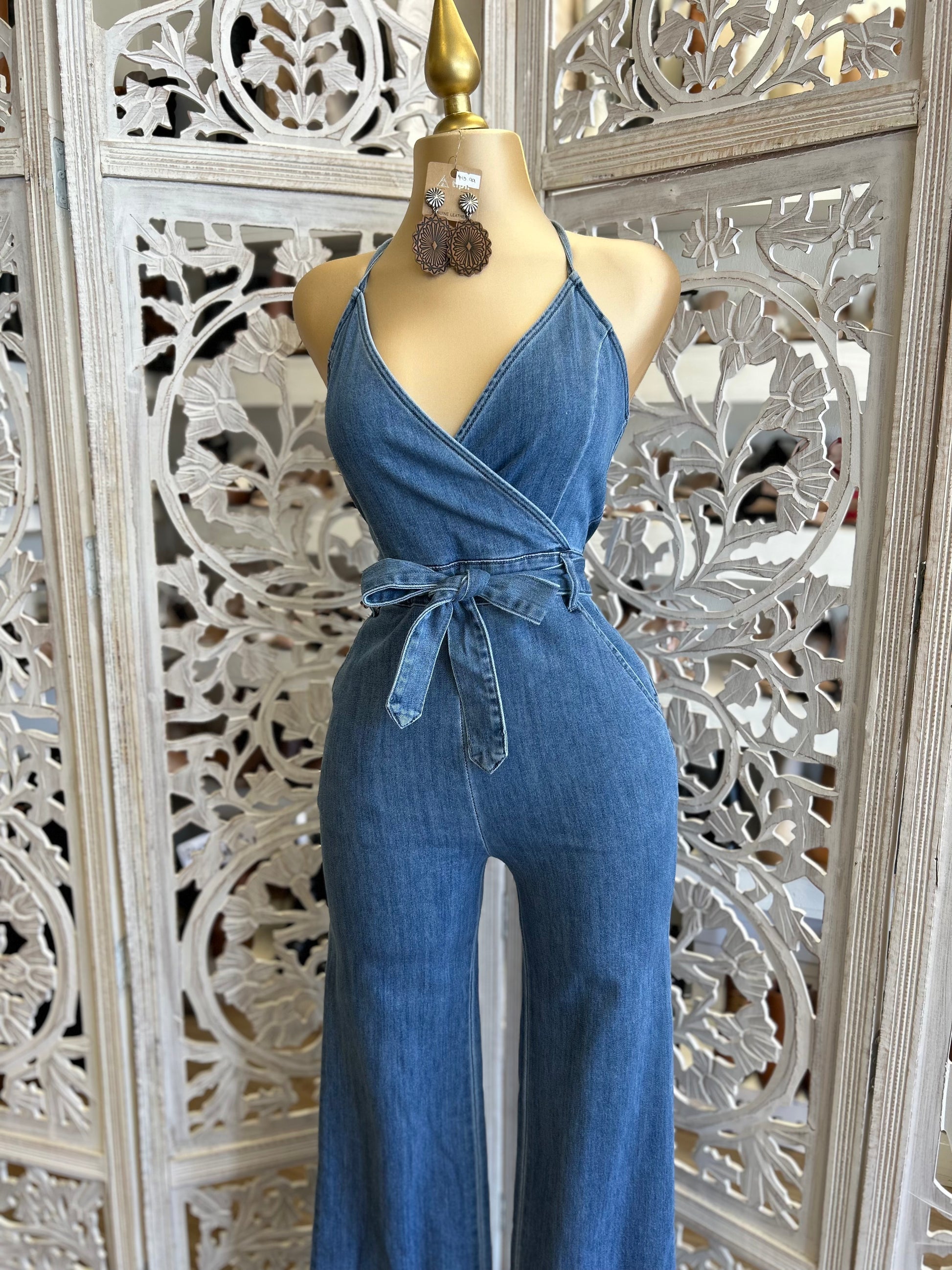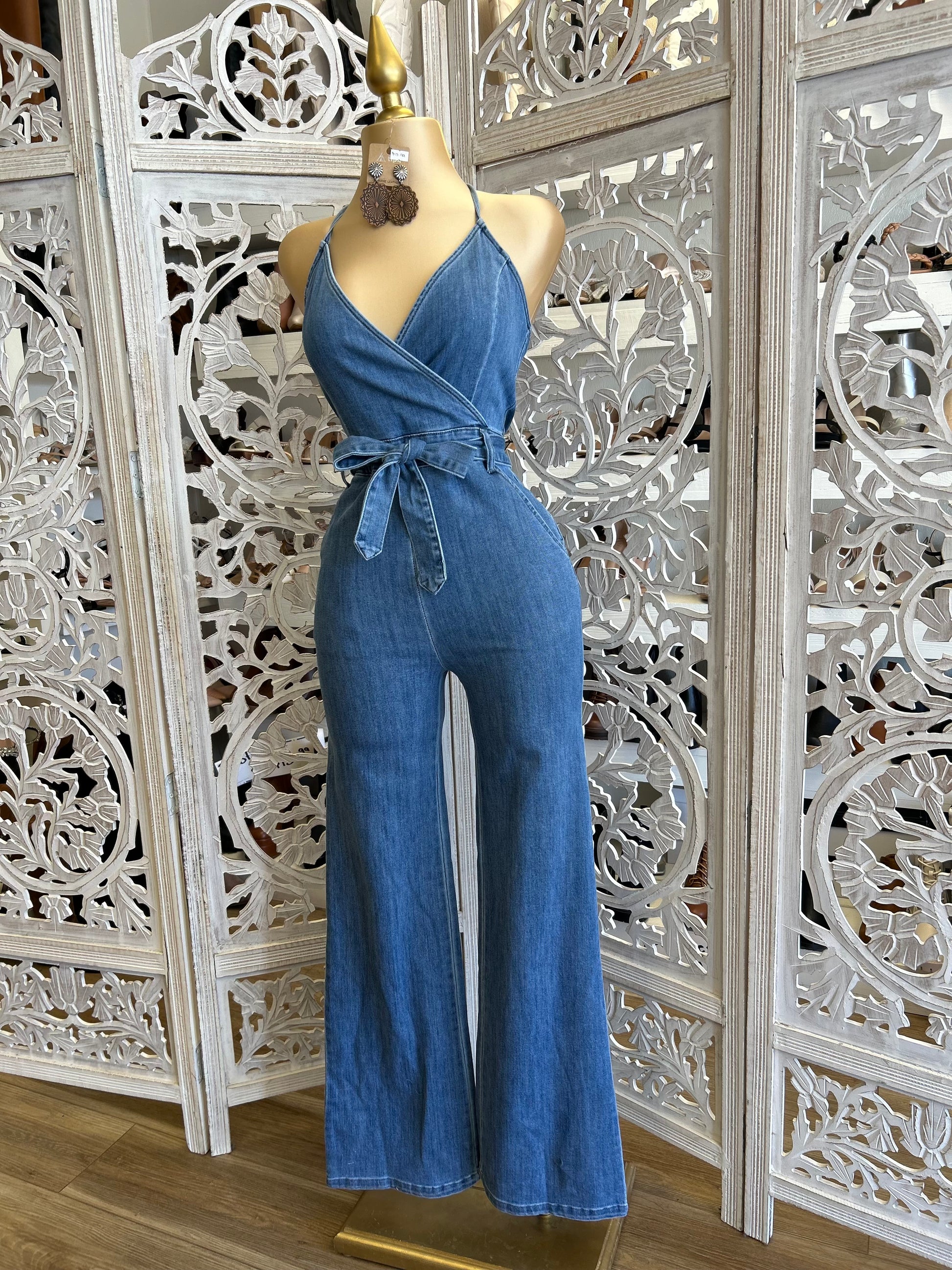 Denim Flare Backless Jumpsuit- Slightly Stretchy