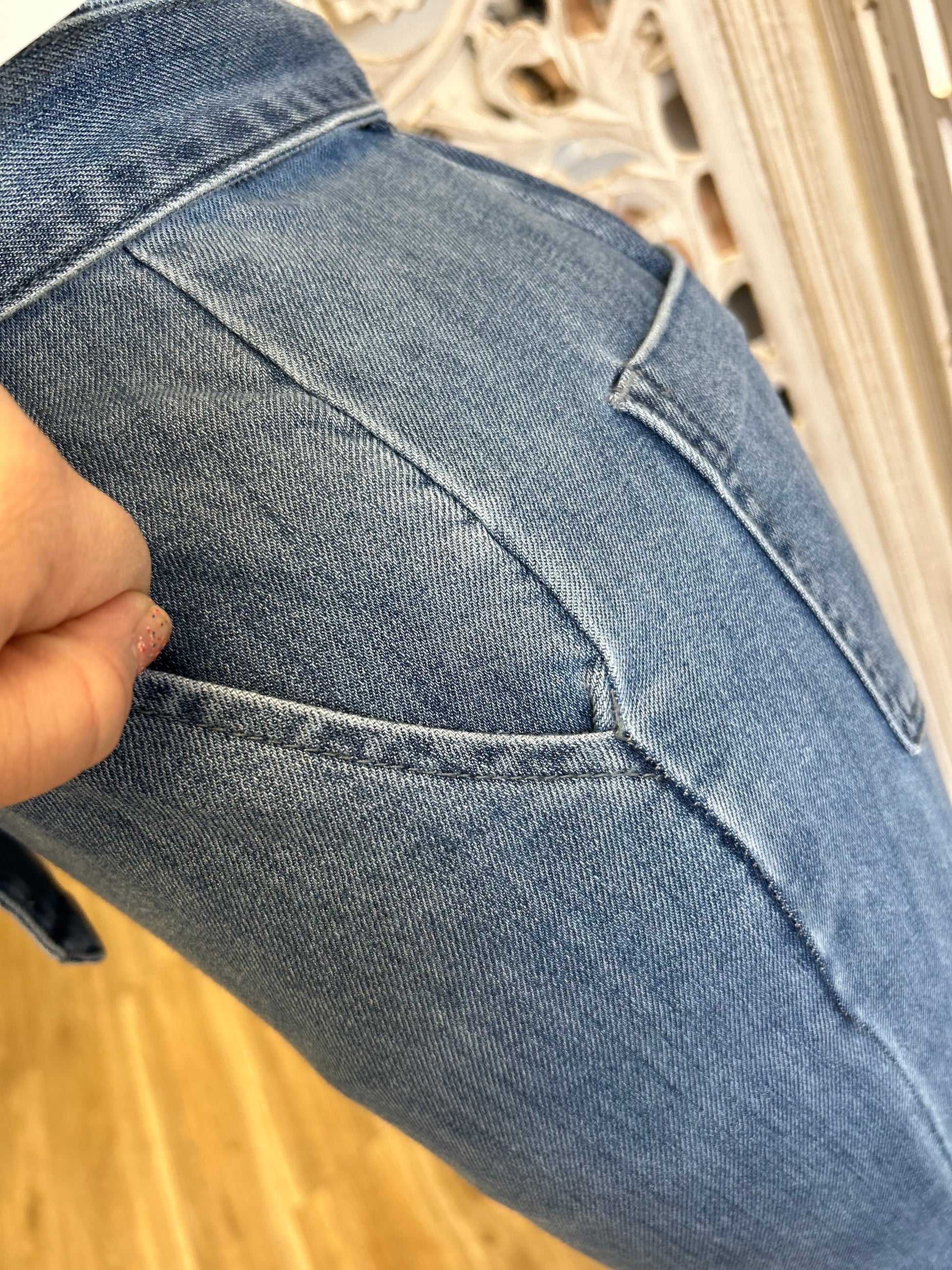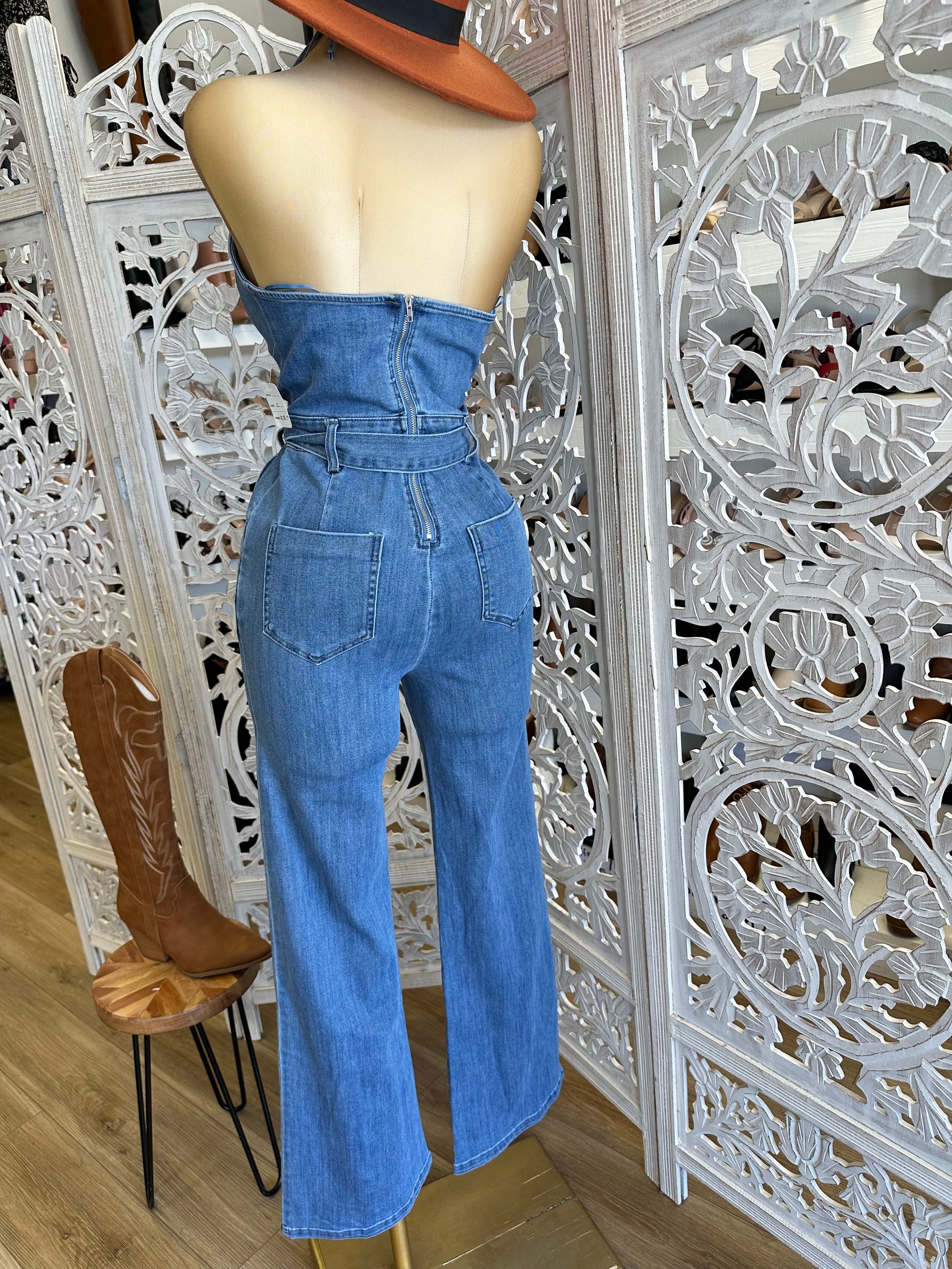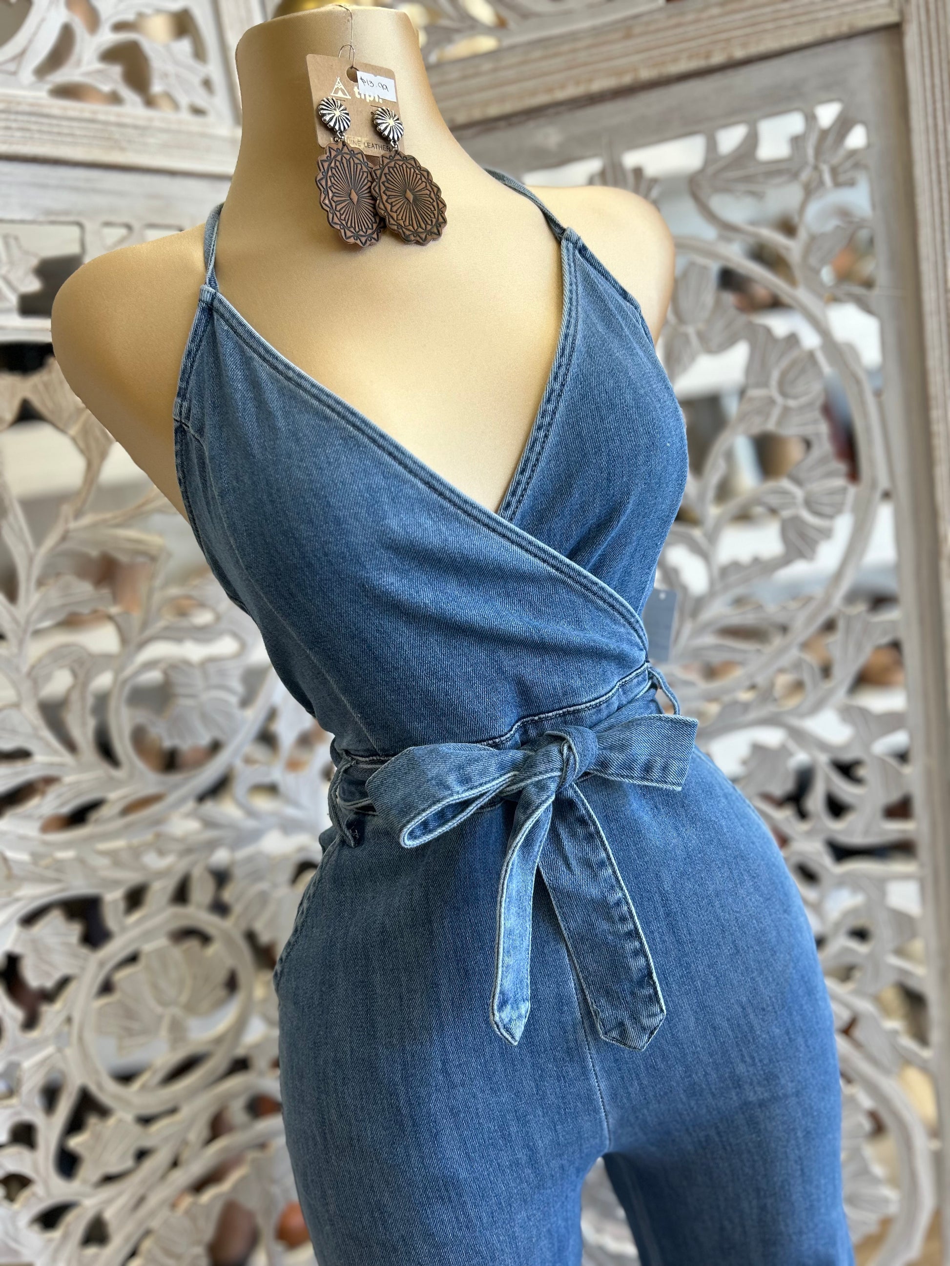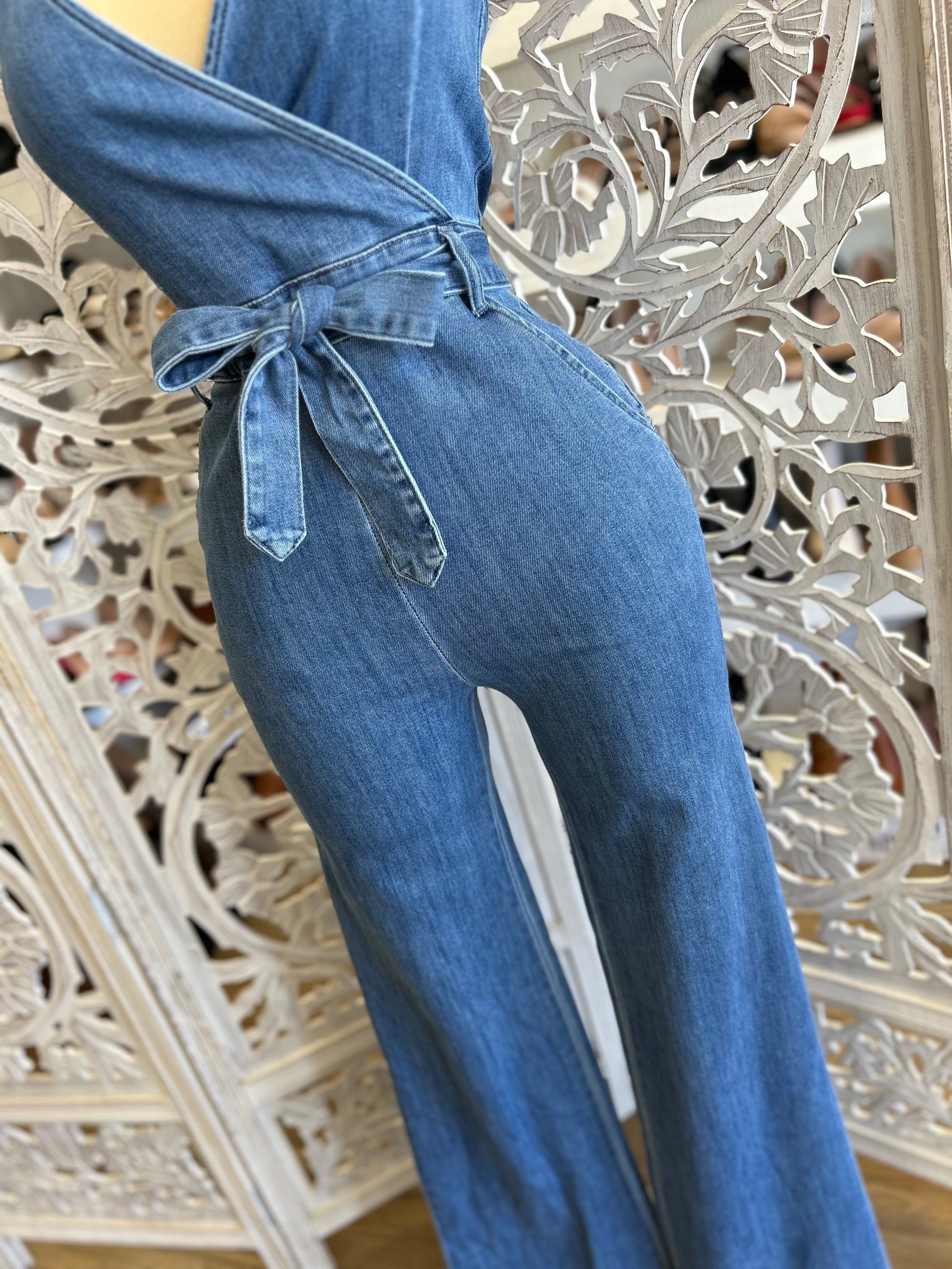 Denim Flare Backless Jumpsuit- Slightly Stretchy