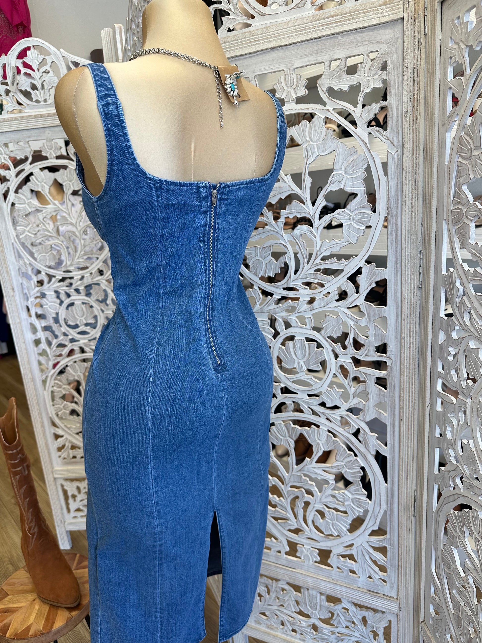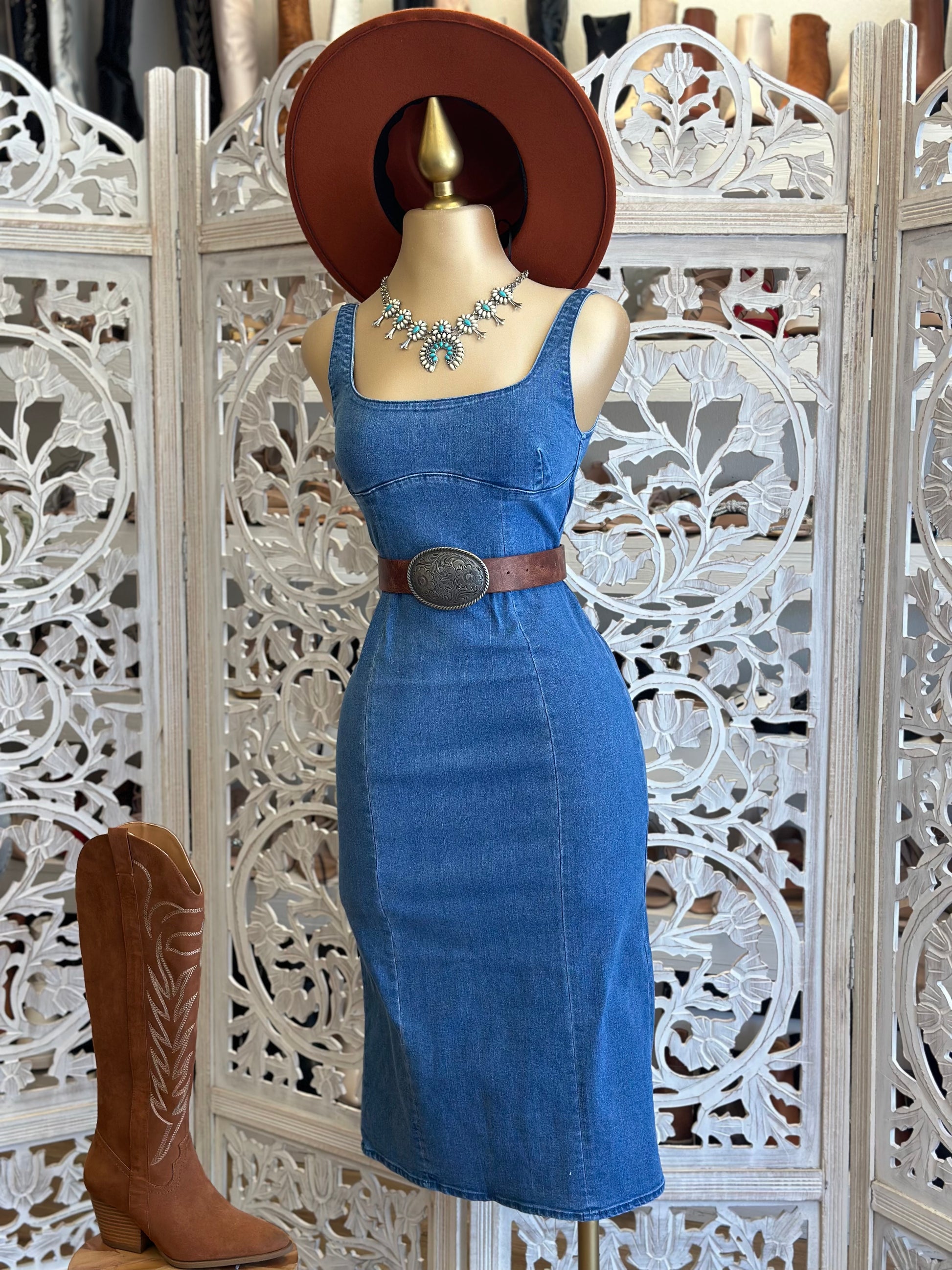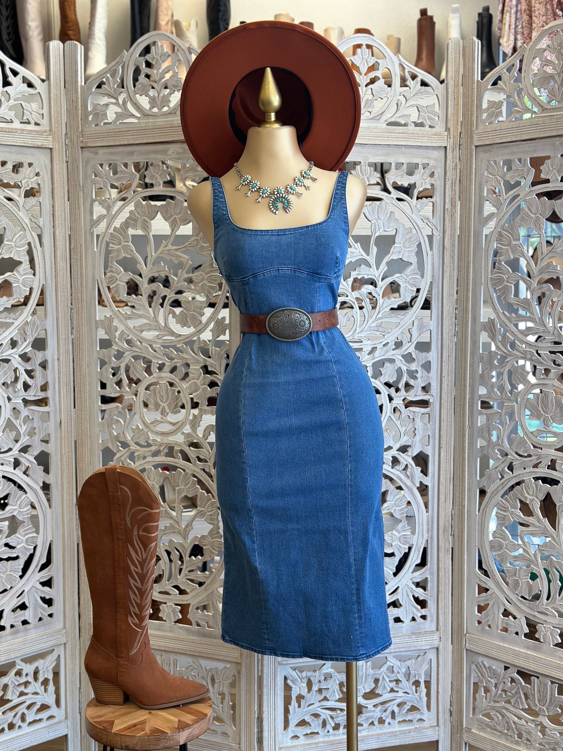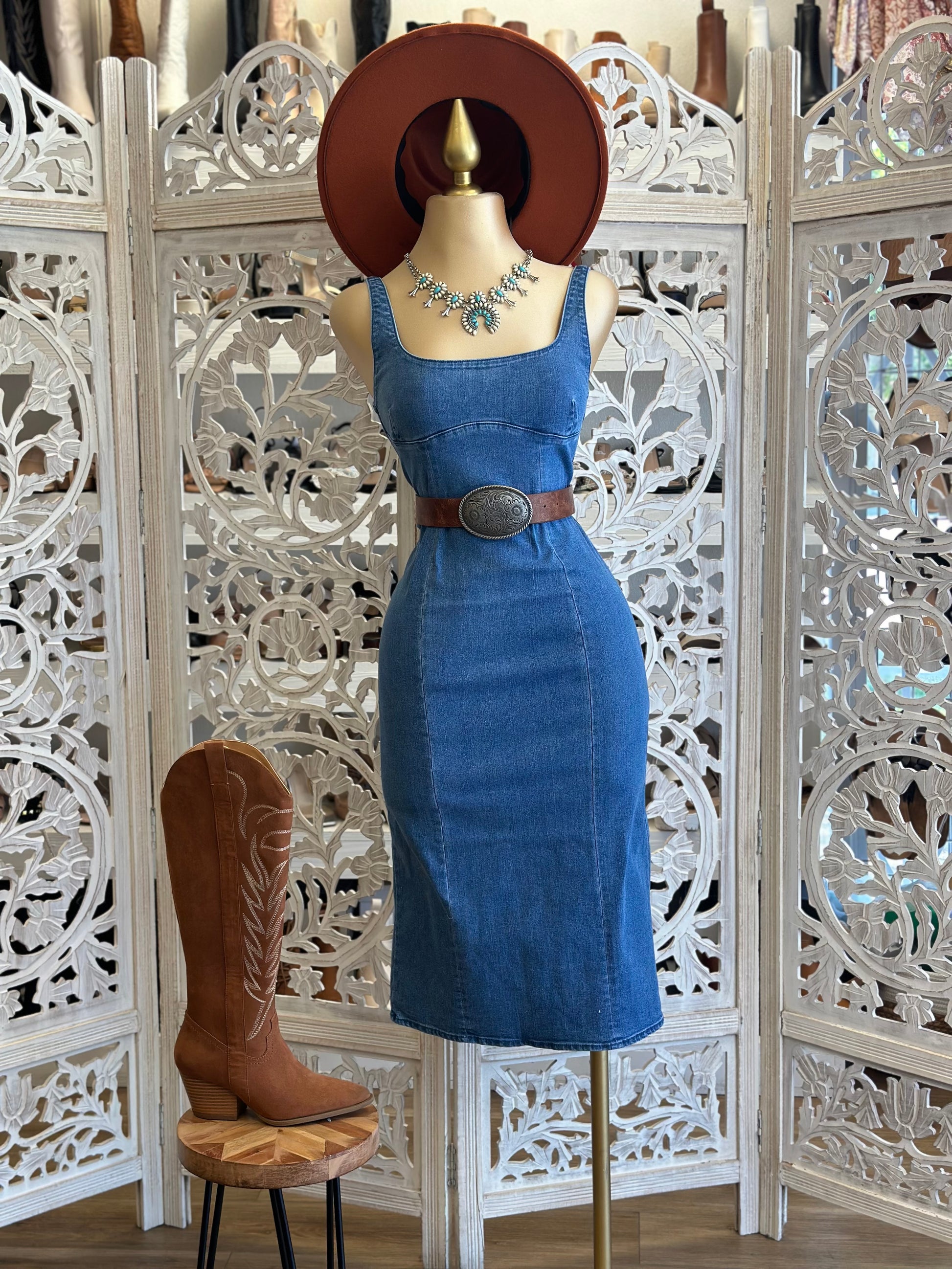 Denim Square Neck Midi Dress- Slightly Stretchy