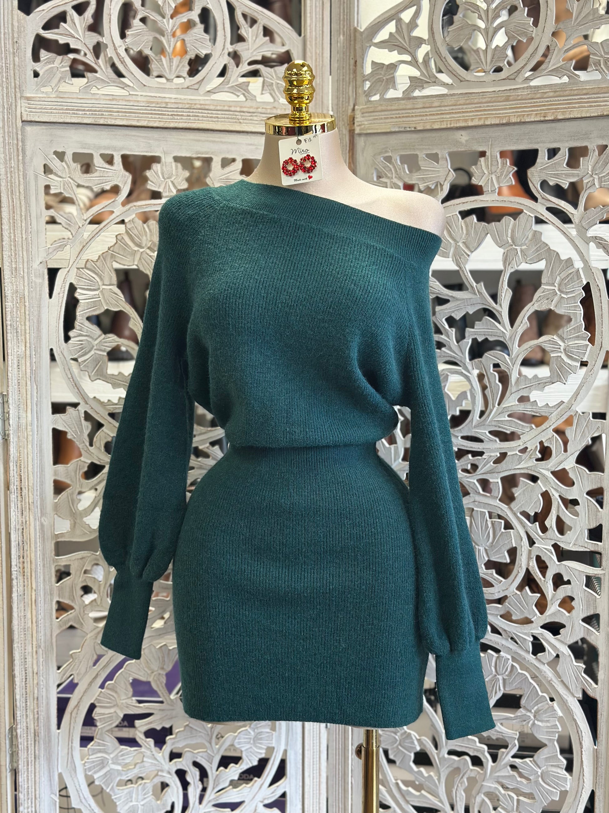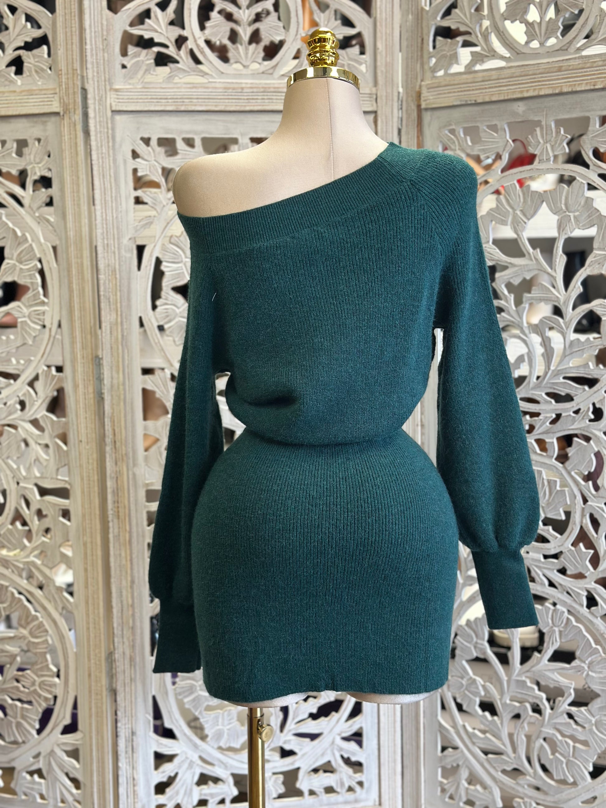 Draped Shoulder Deep Green Dress- Stretchy,Estira