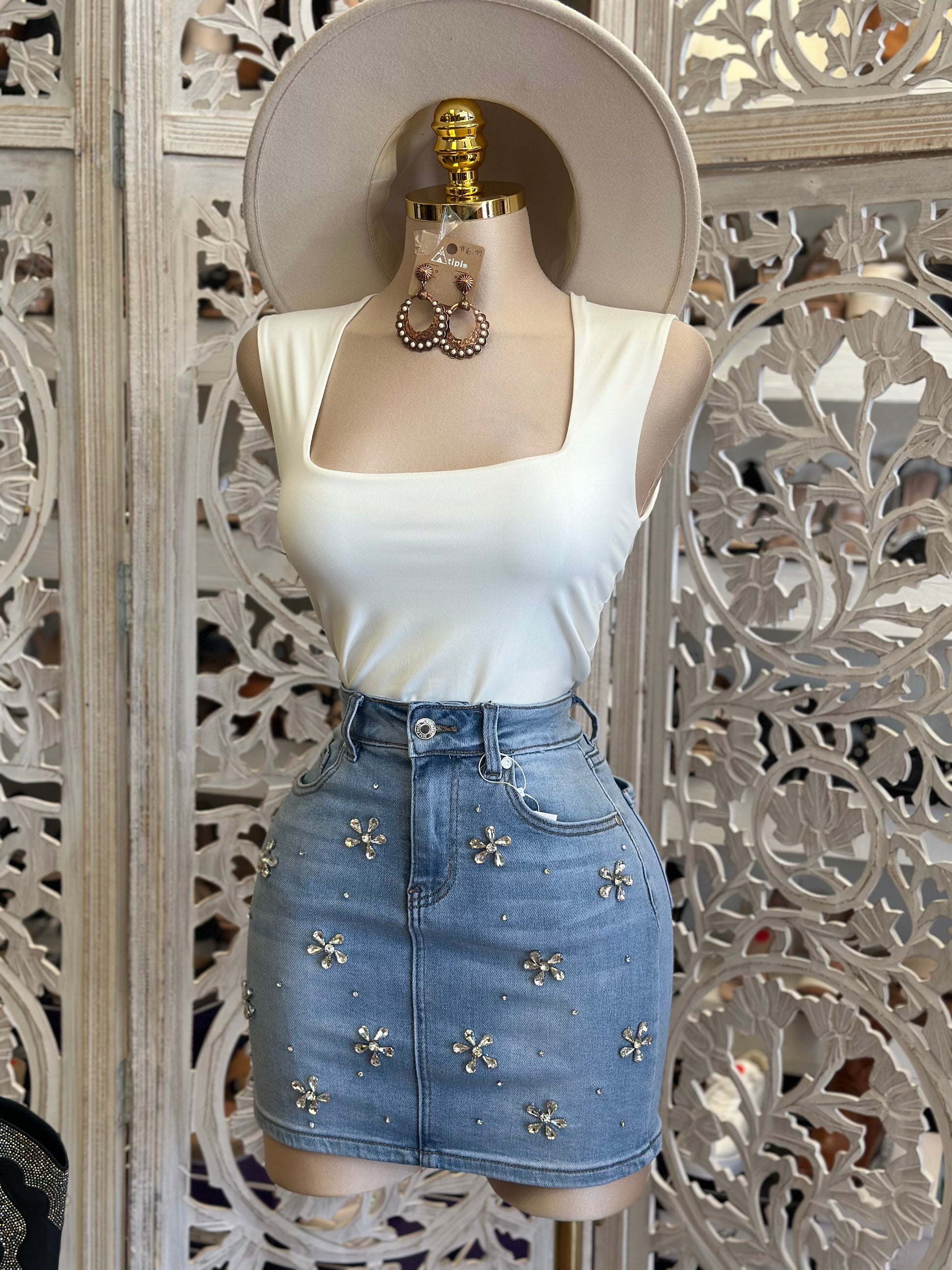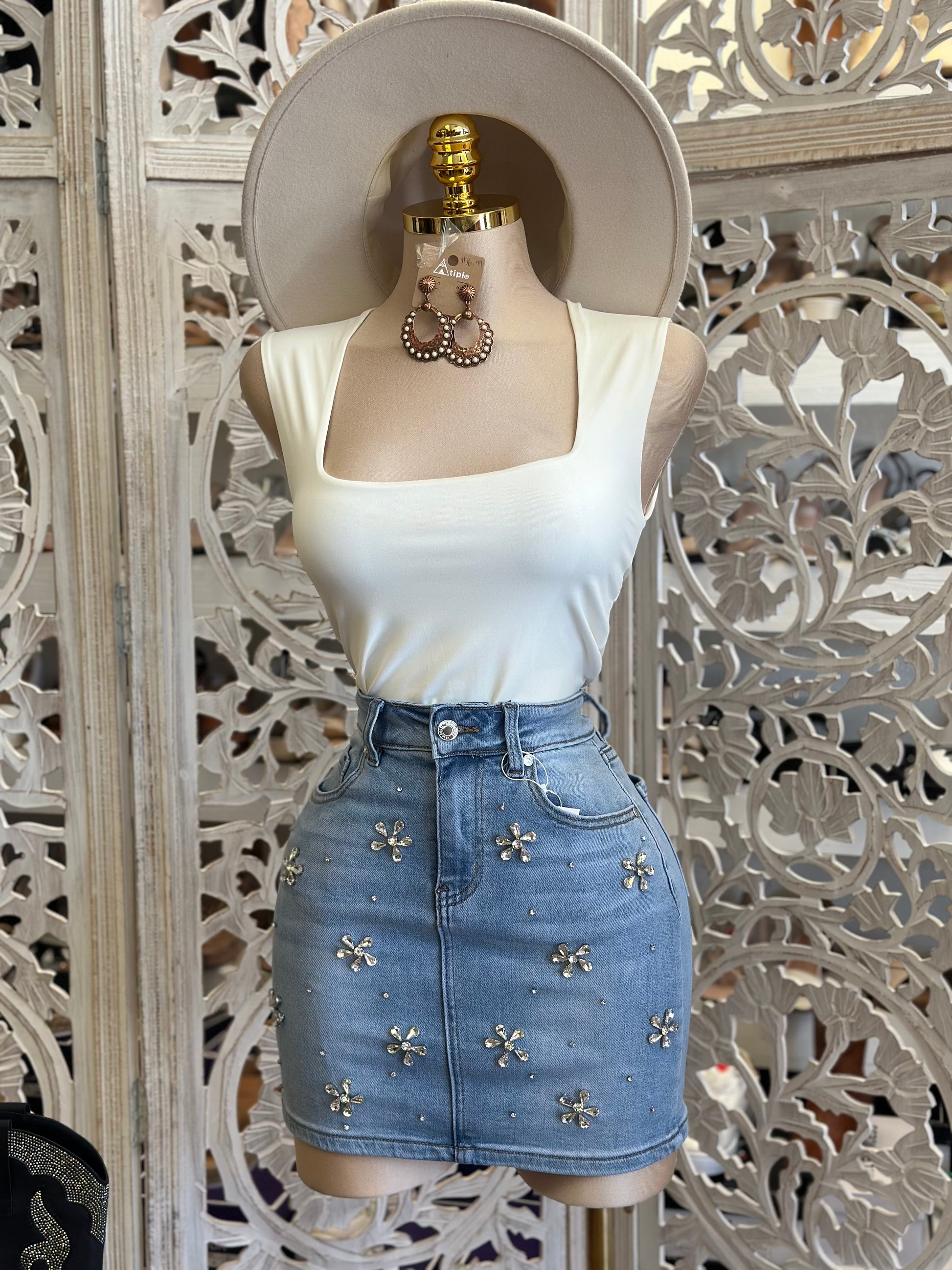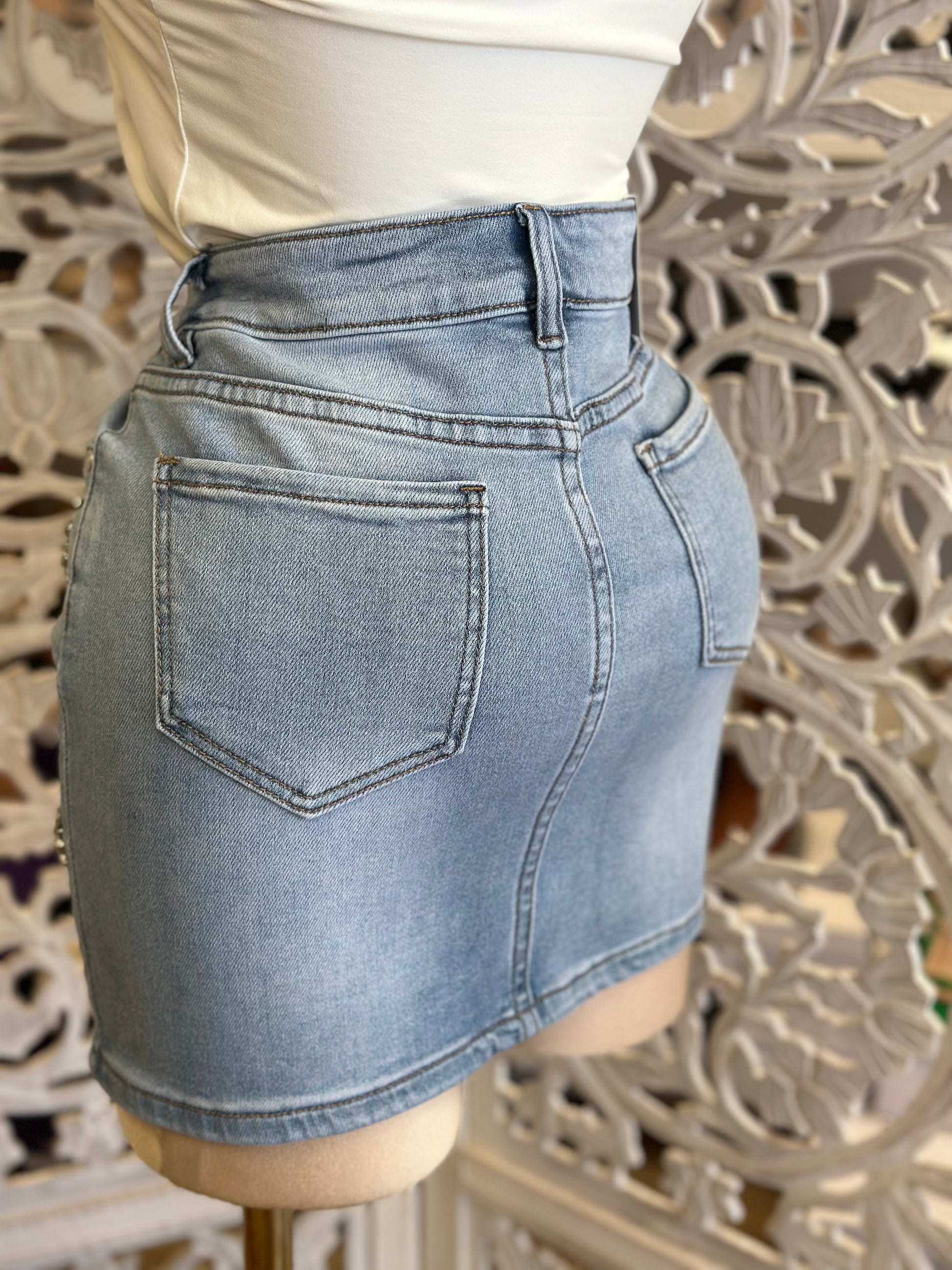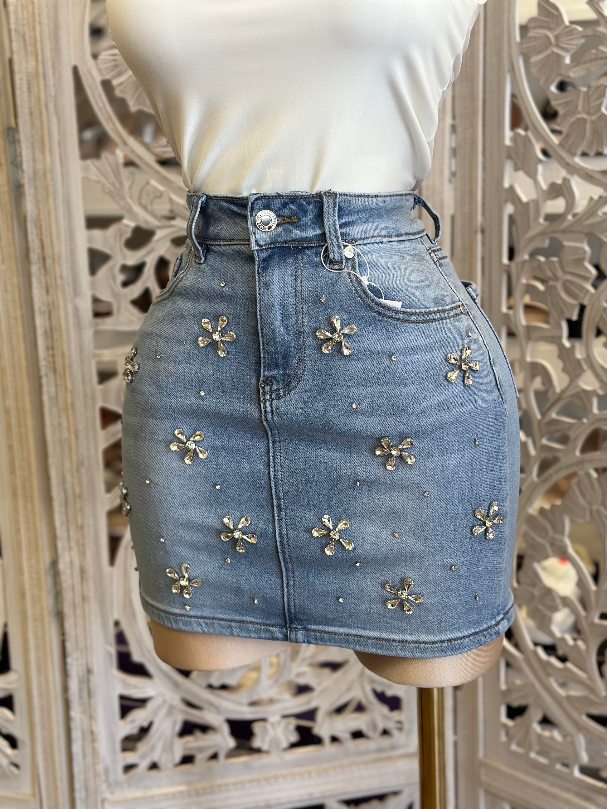 Flower Rhinestone Mini Skirt-Estira , Stretchy