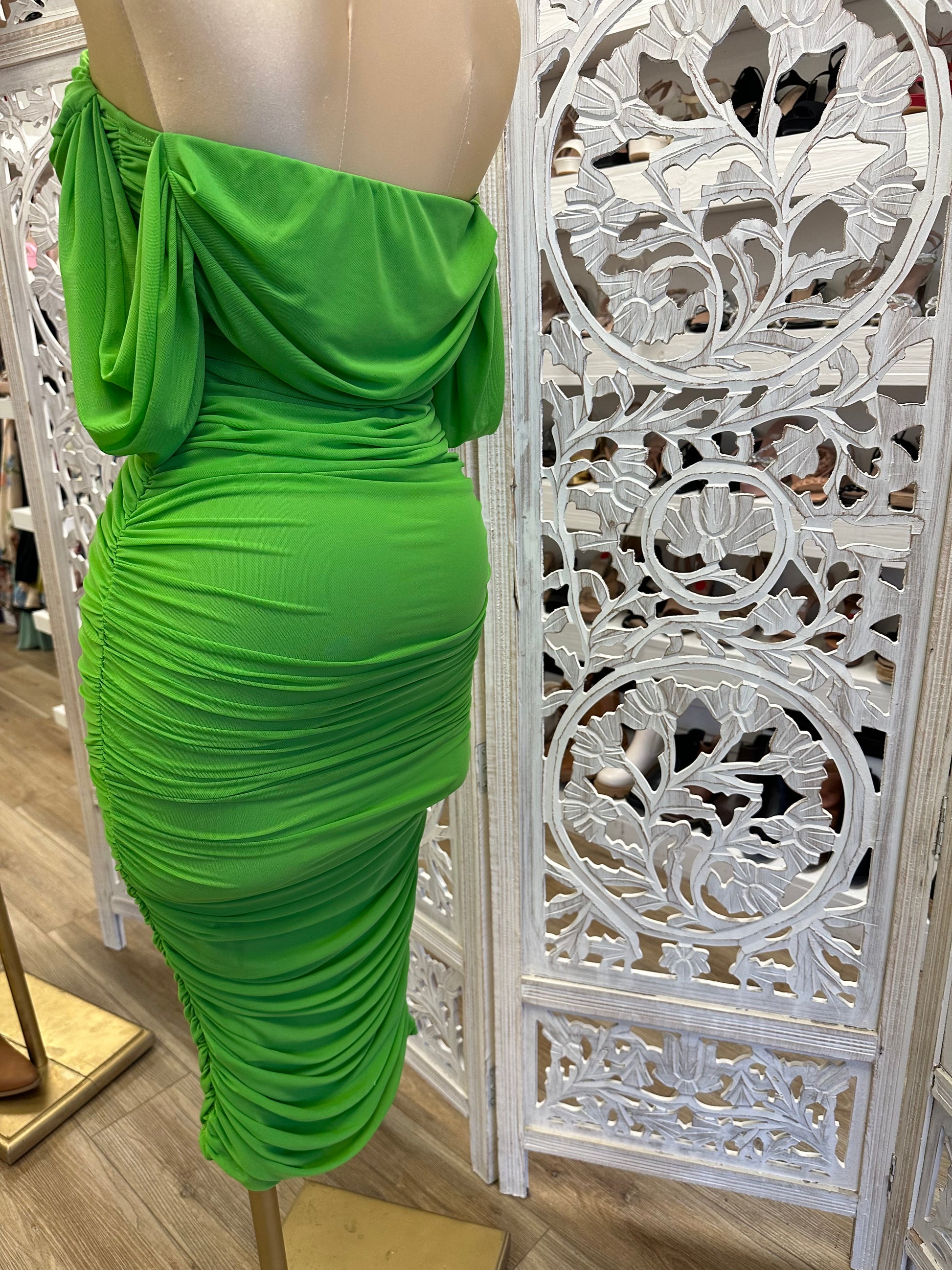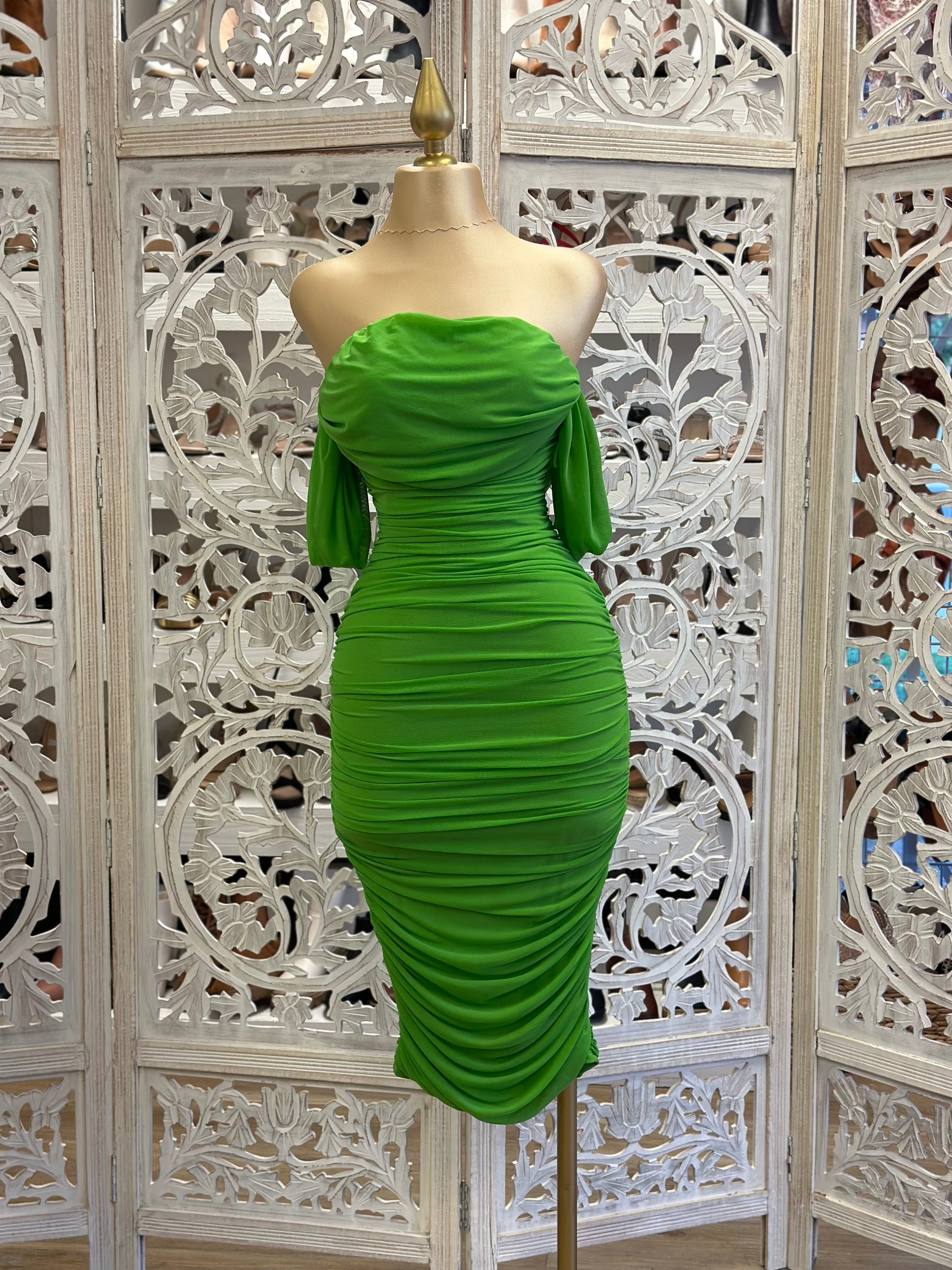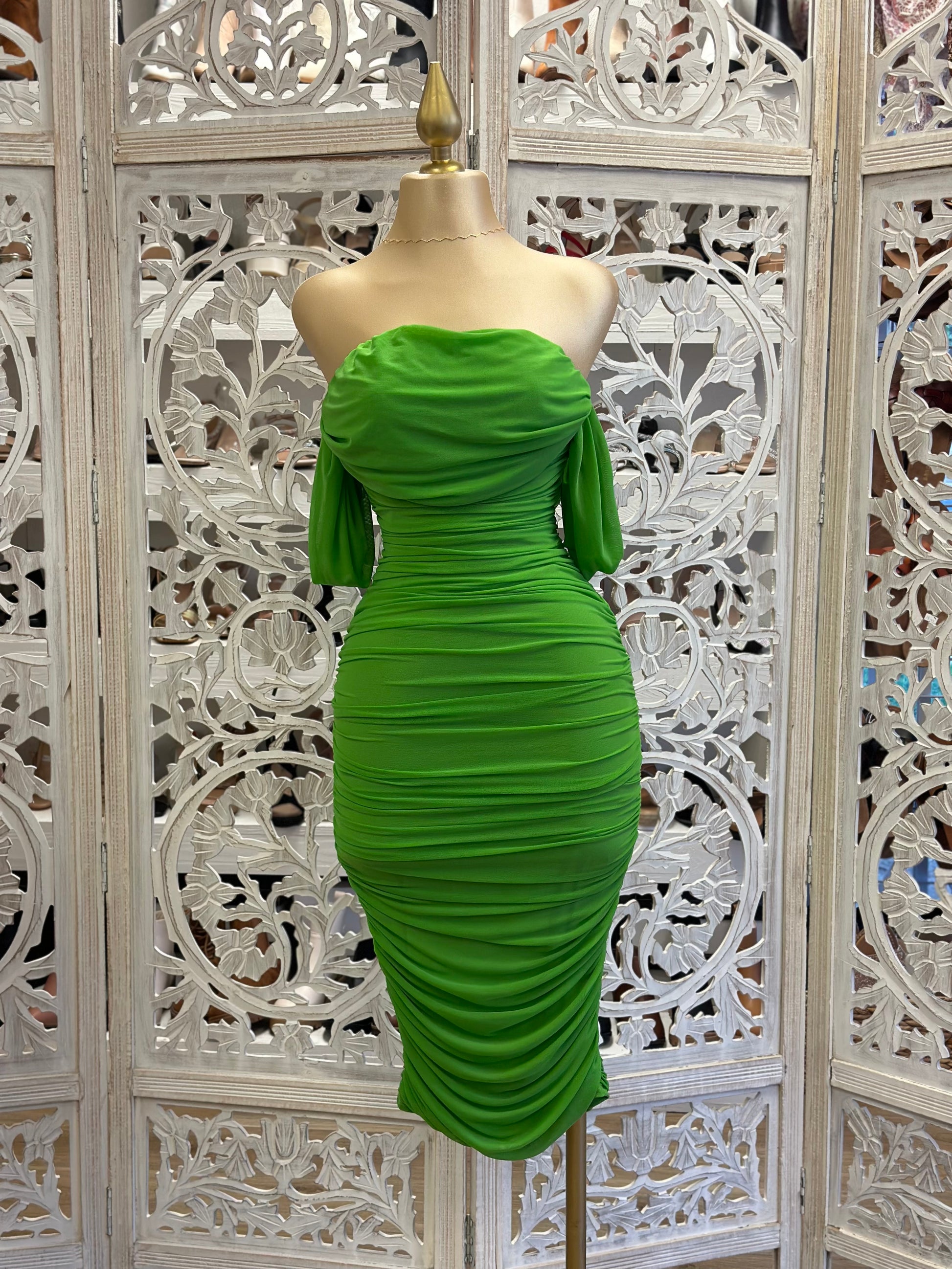 Green Midi Off Shoulder Ruched Dress- Stretchy