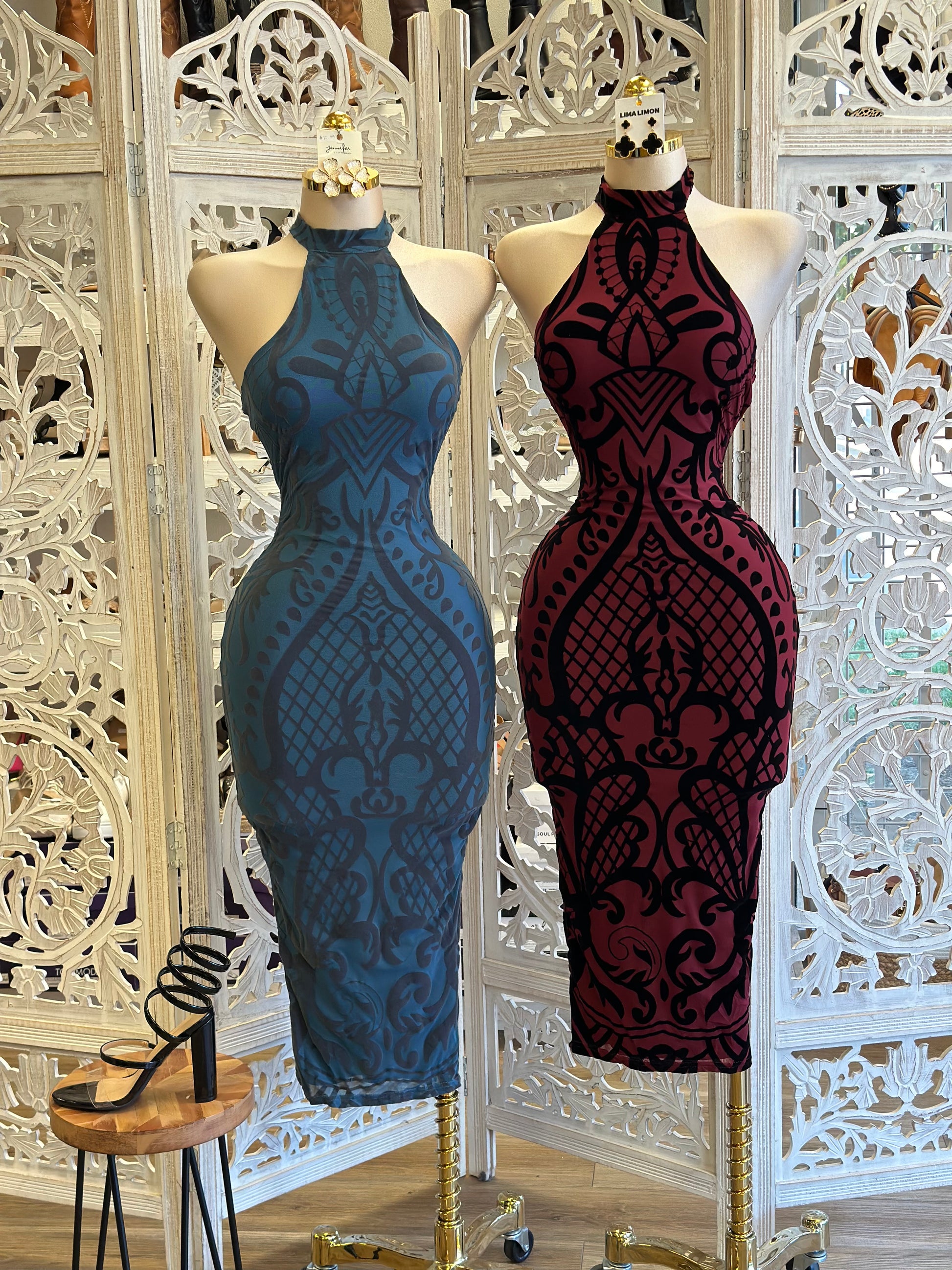 Halter Neck Velvet Pattern Dress- Estira, Stretchy
