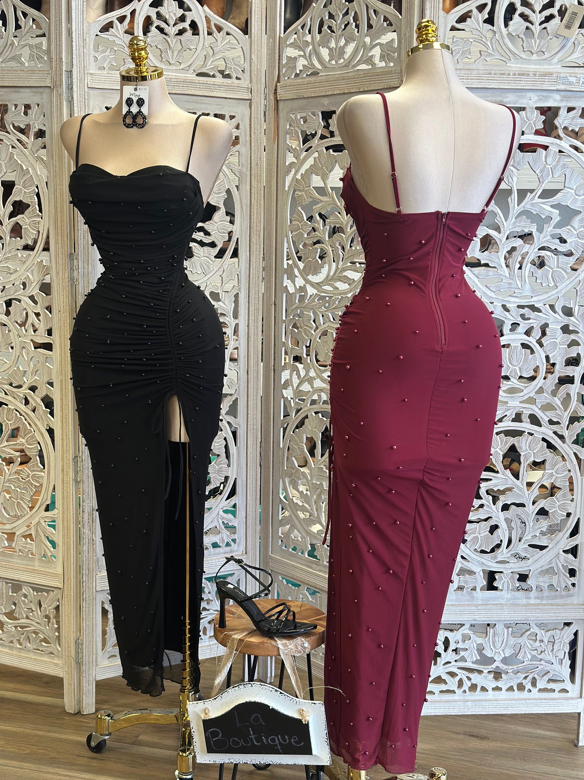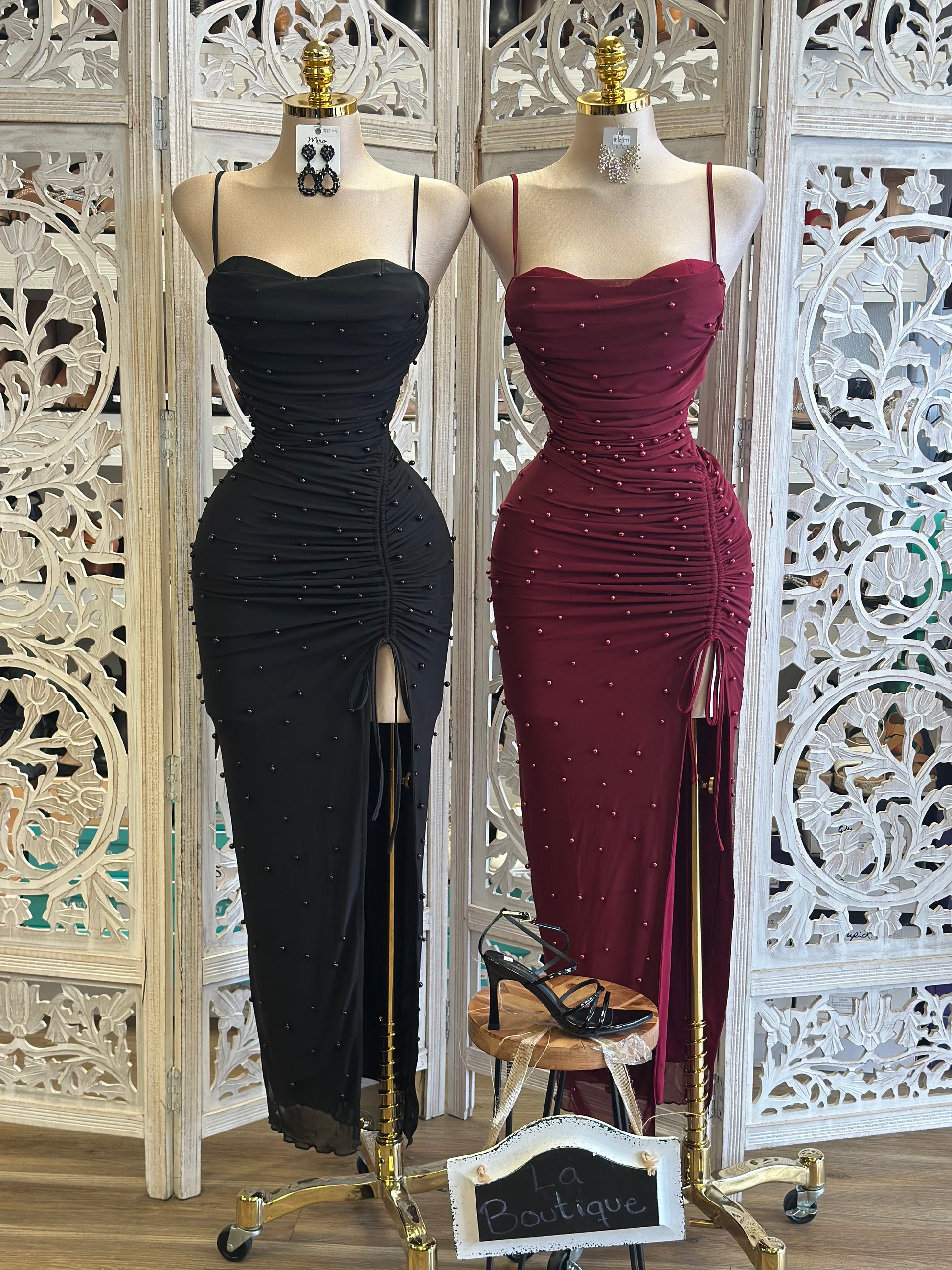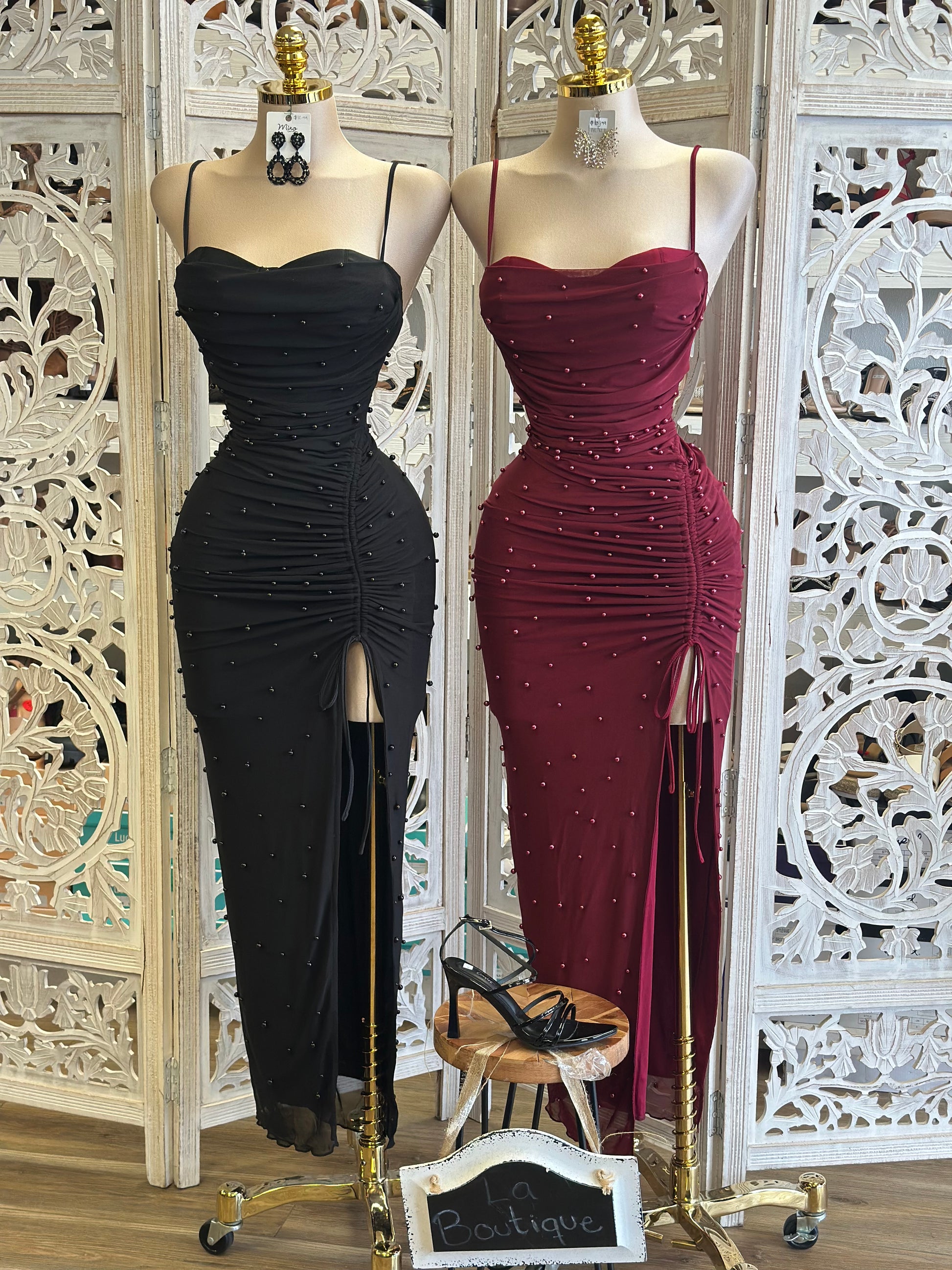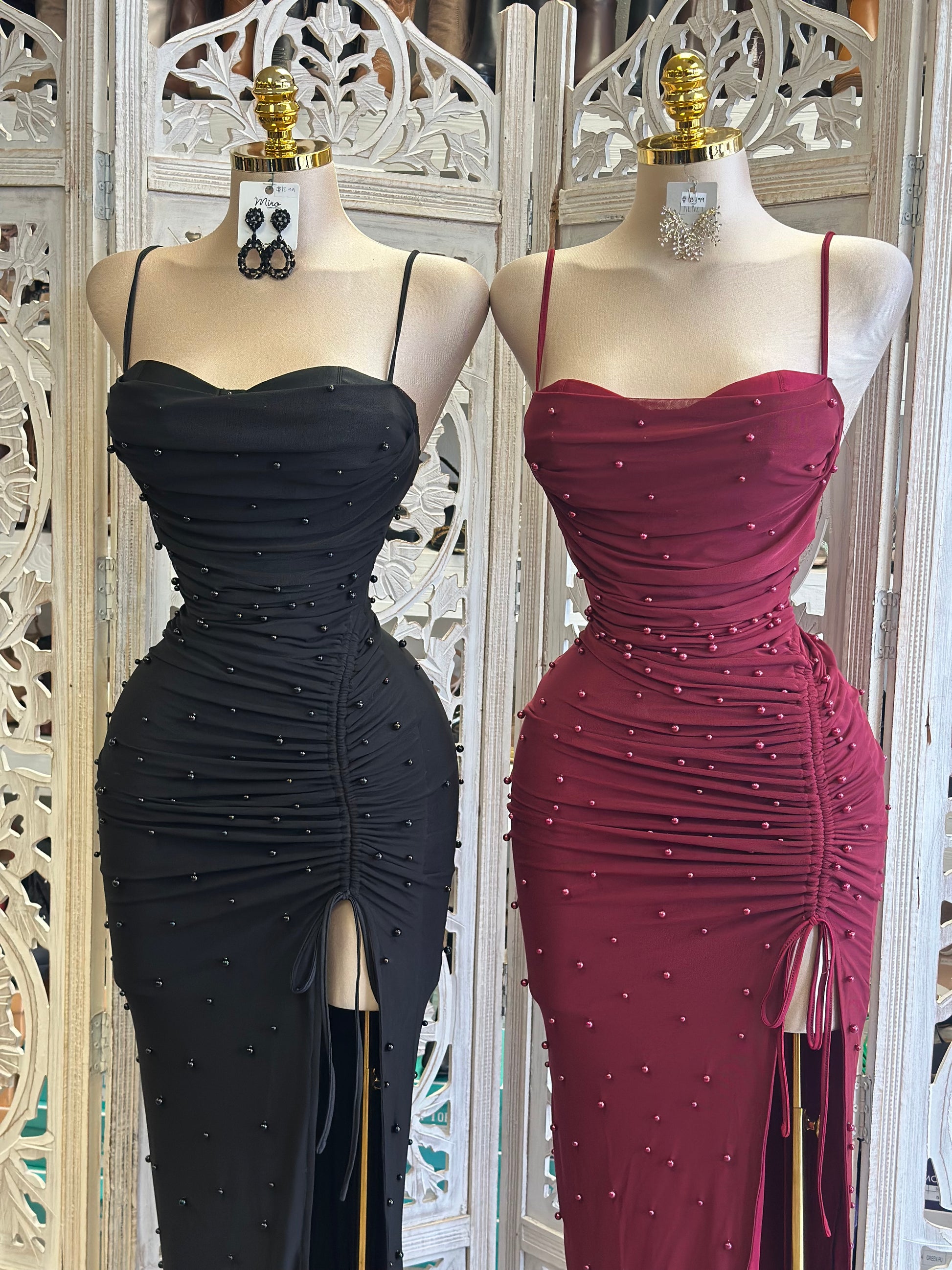 Heartline Pearl Embellished Ruched Dress- Stretchy,Estira