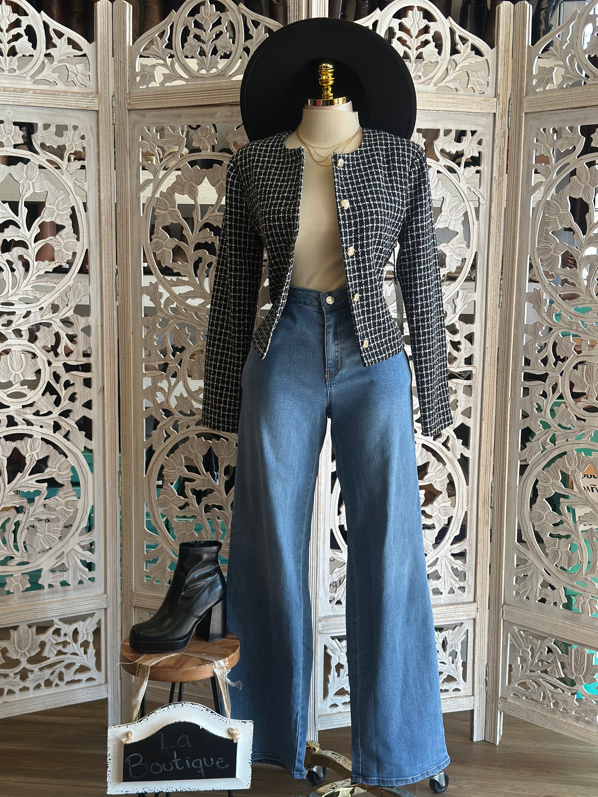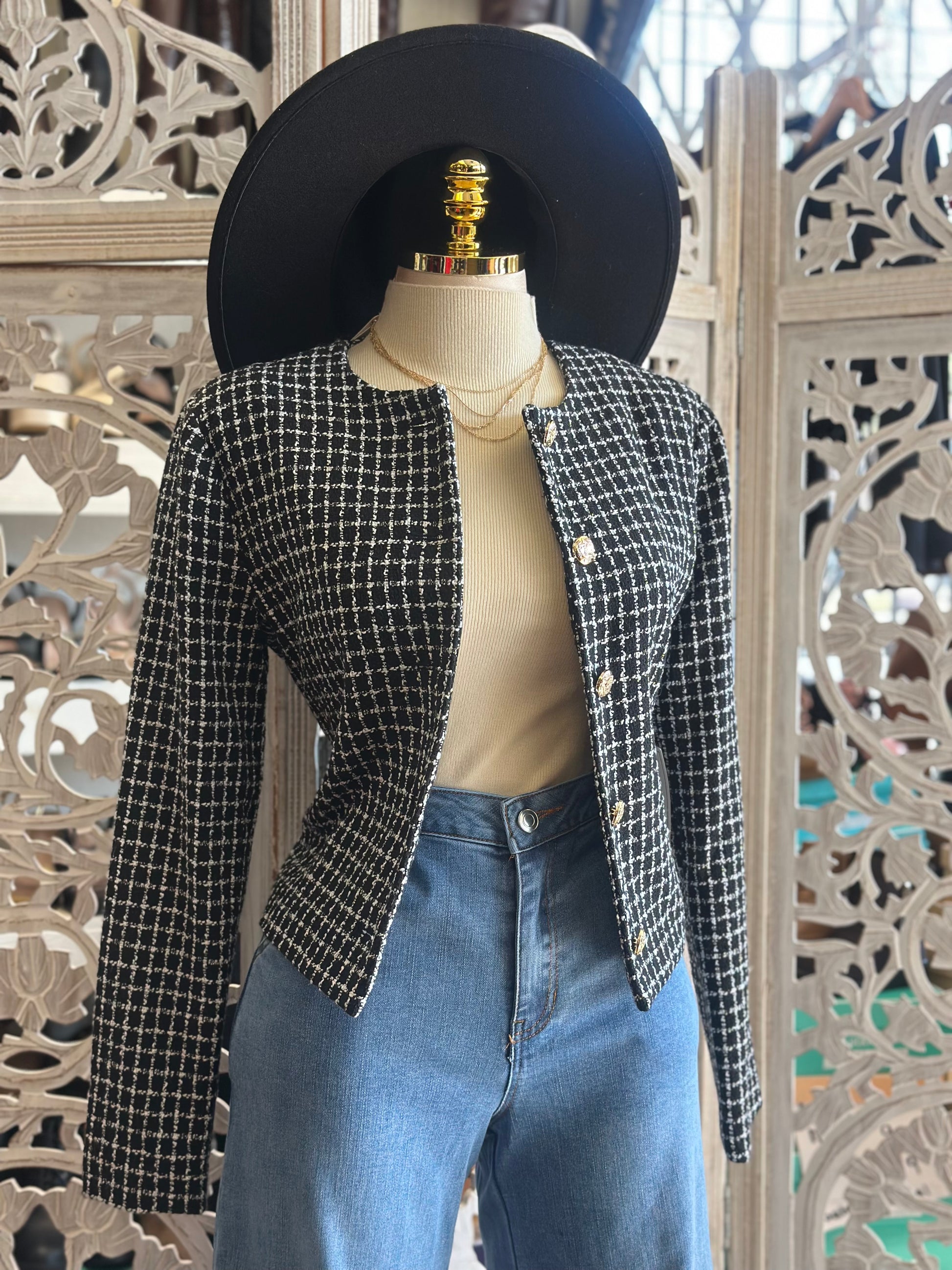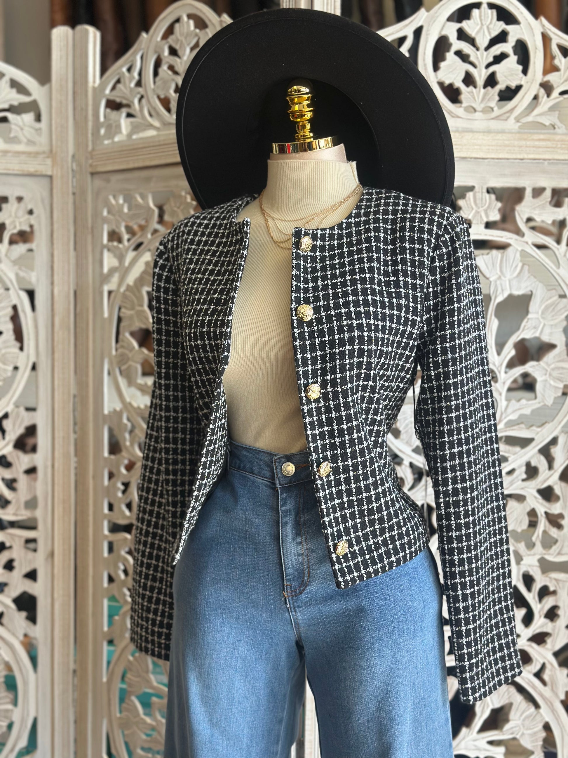 Houndstooth White and Black Pattern Blazer- No Estira, Not Stretchy