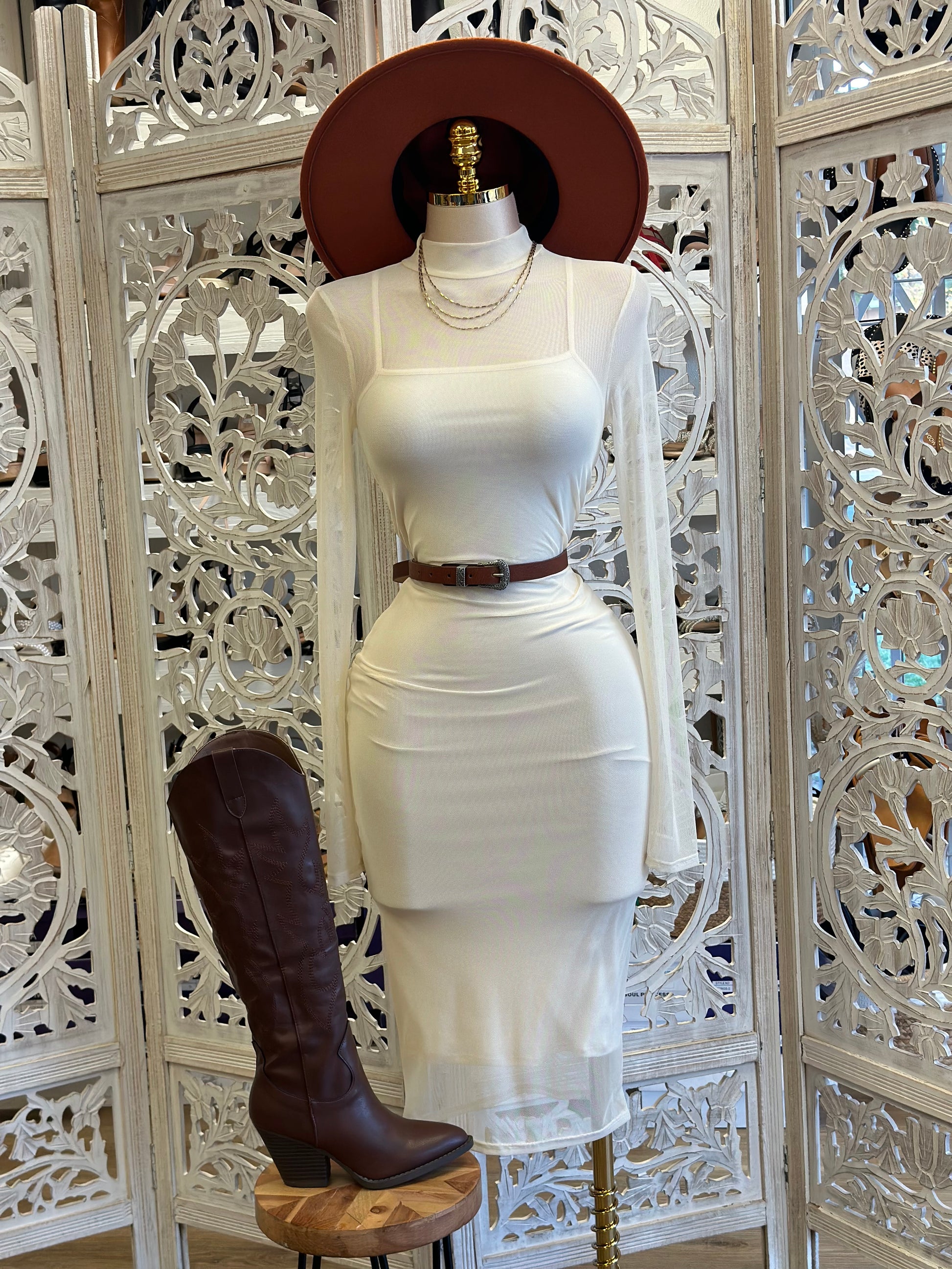 Ivory Long Sleeve Mesh Midi Dress - Estira, Stretchy