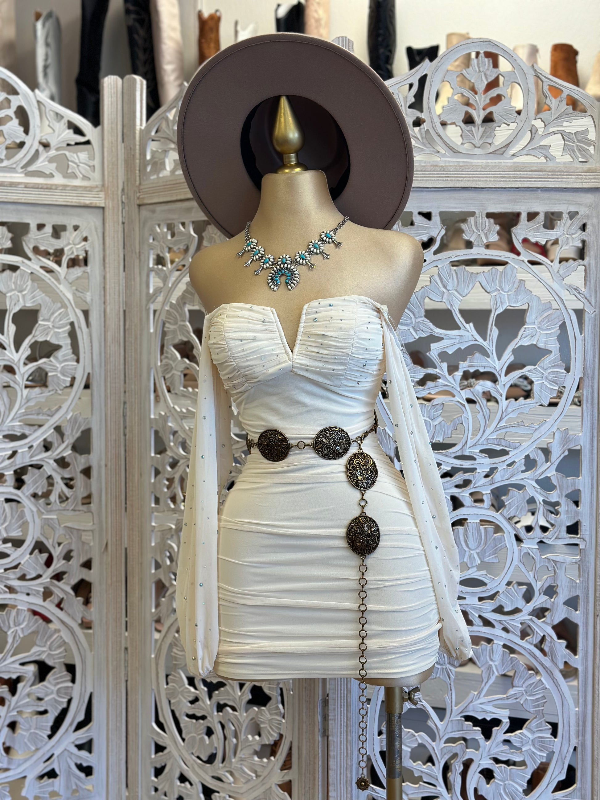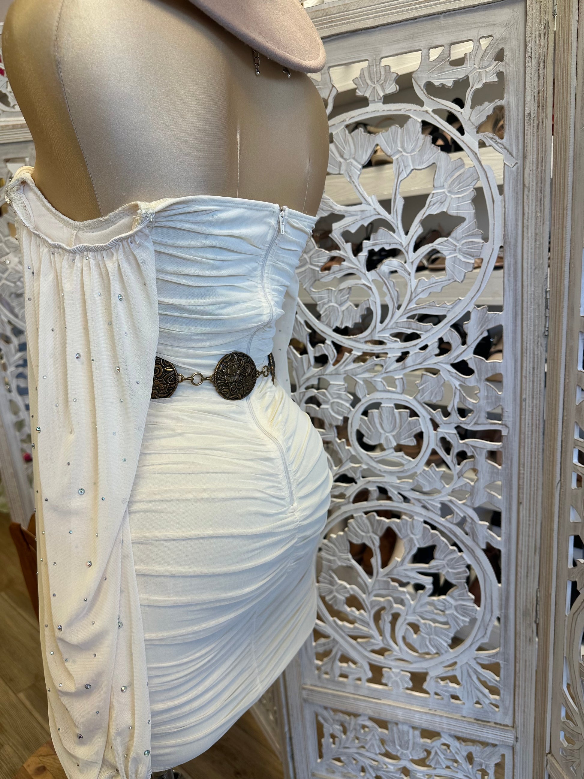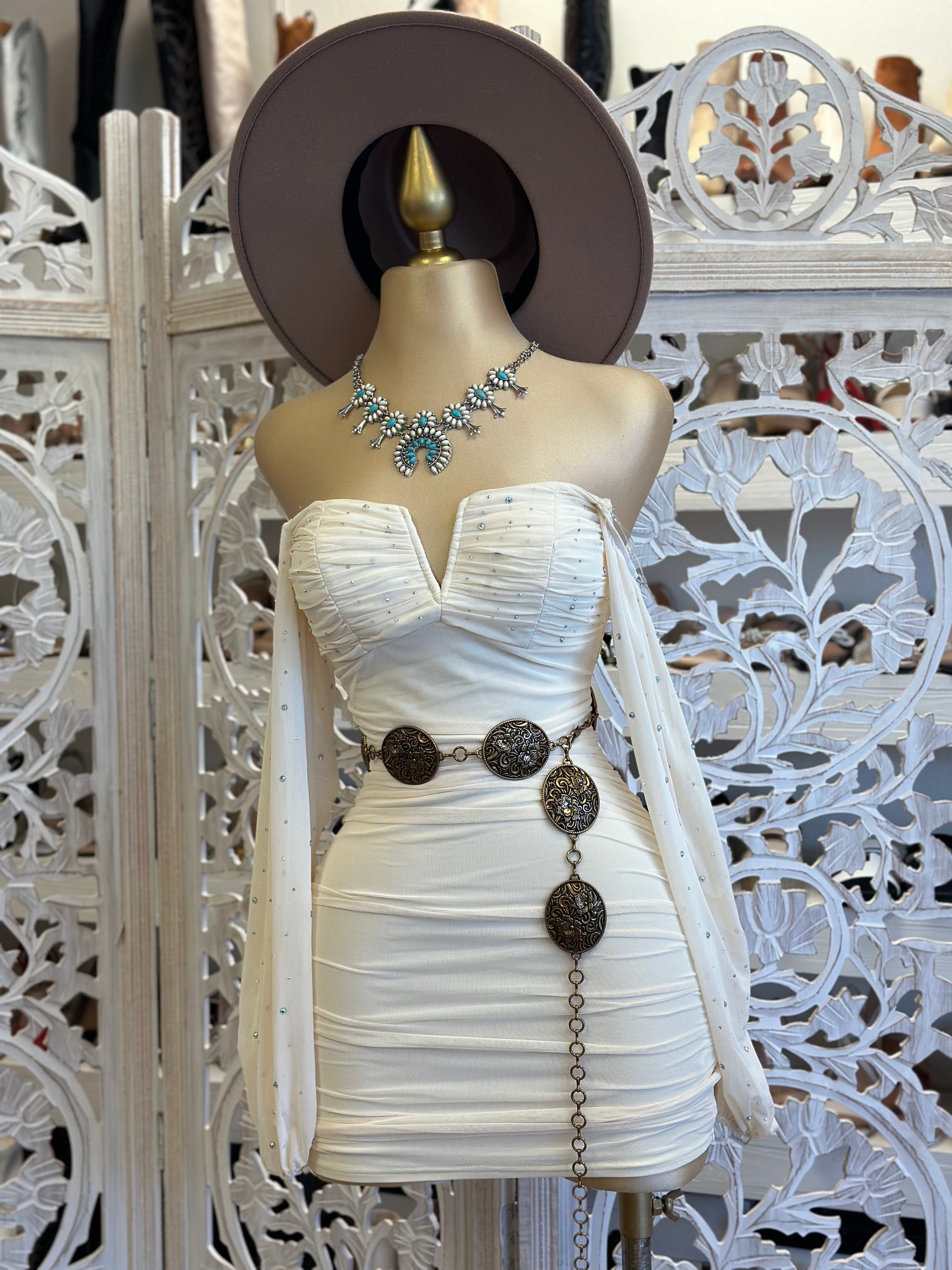 Ivory Rhinestone Bell Sleeve Mini Dress- Stretchy