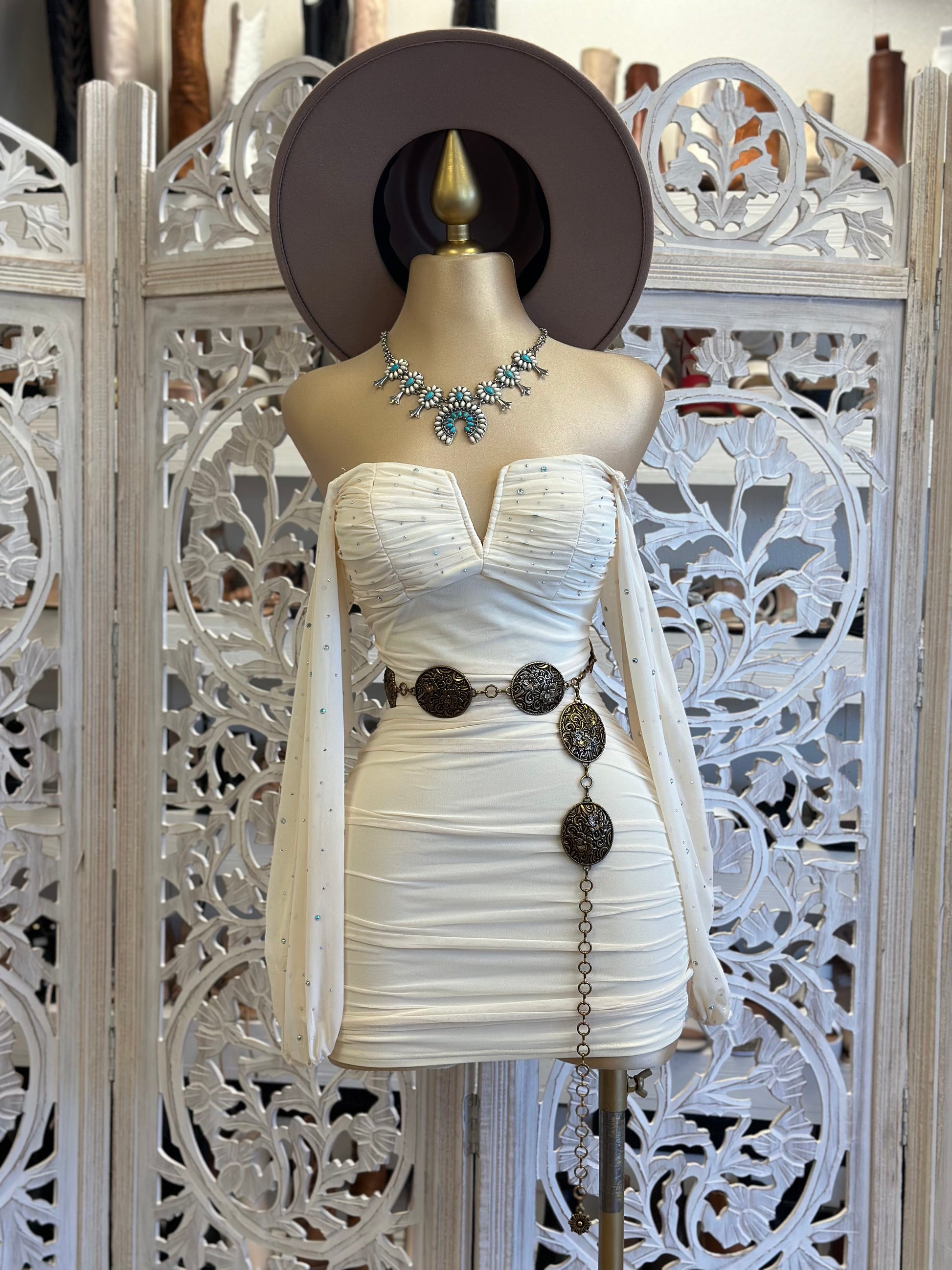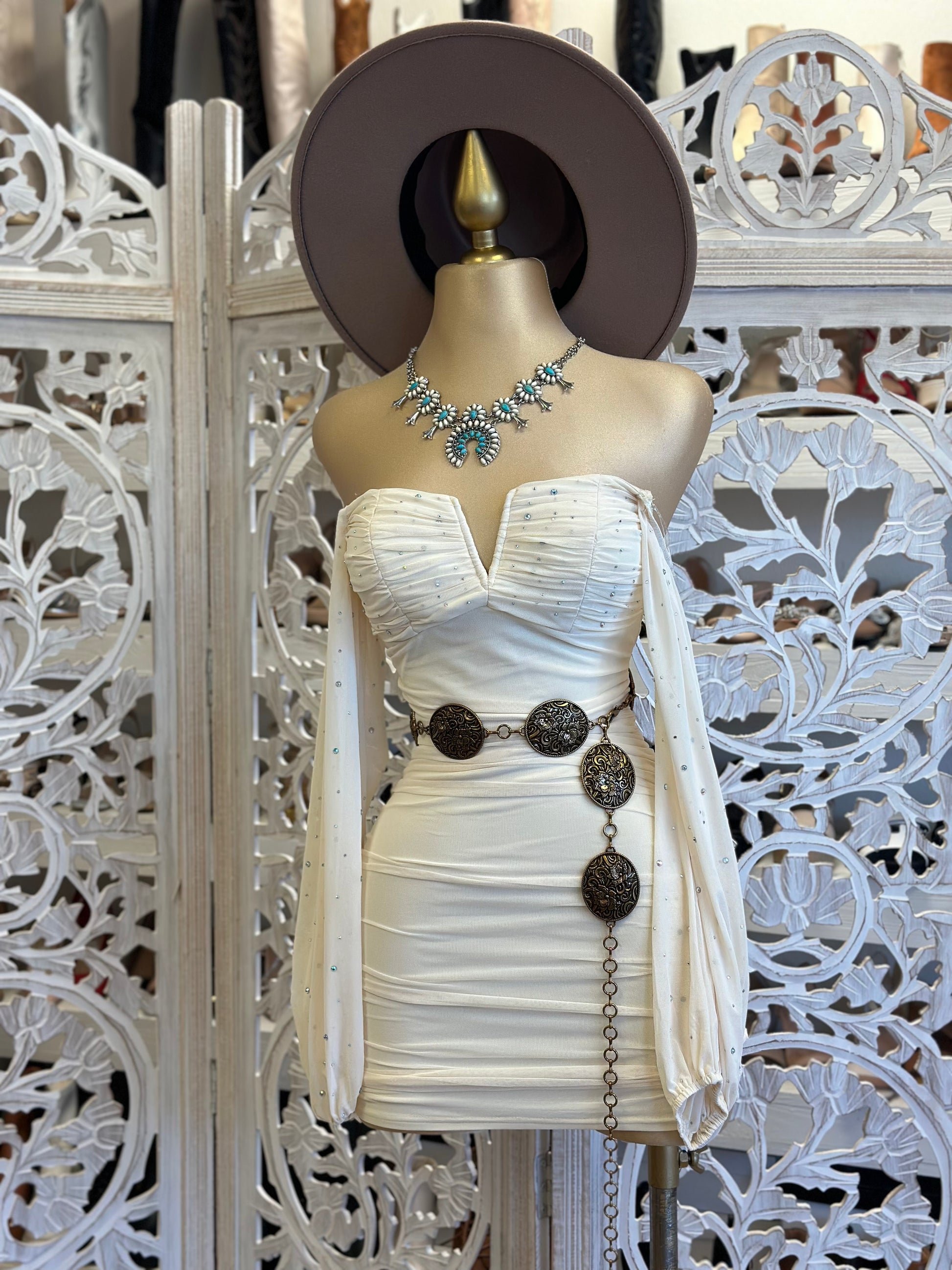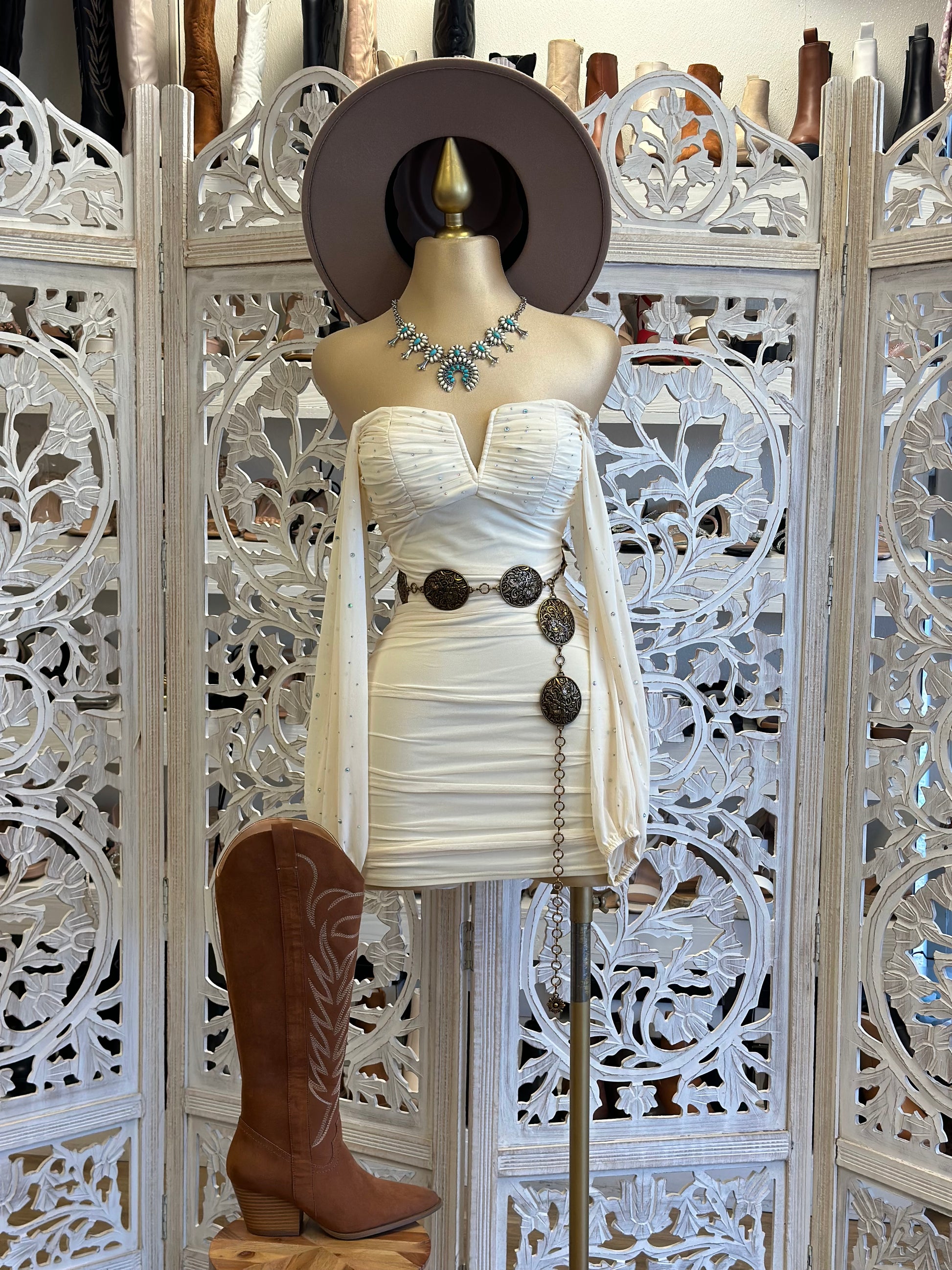 Ivory Rhinestone Bell Sleeve Mini Dress- Stretchy