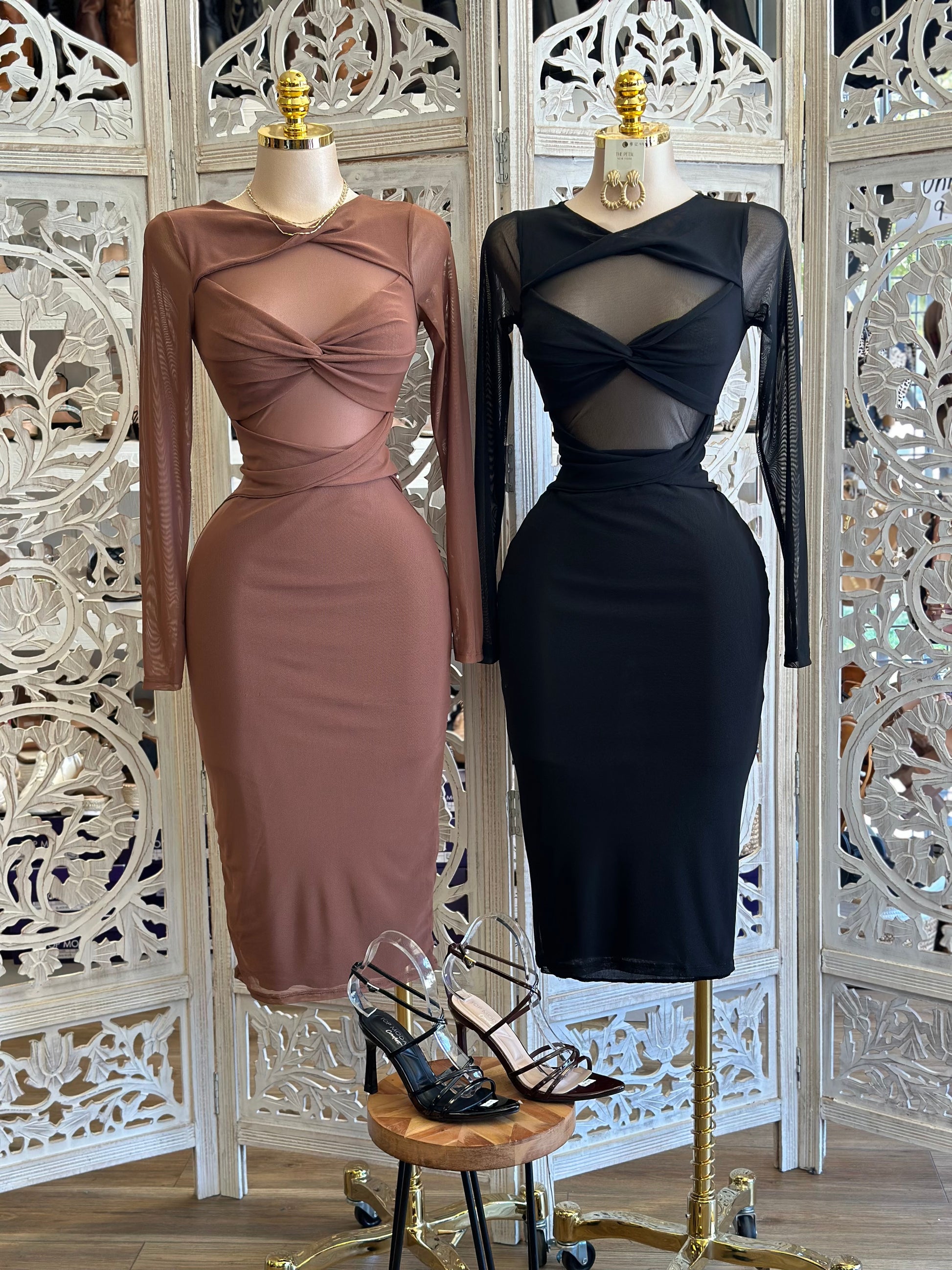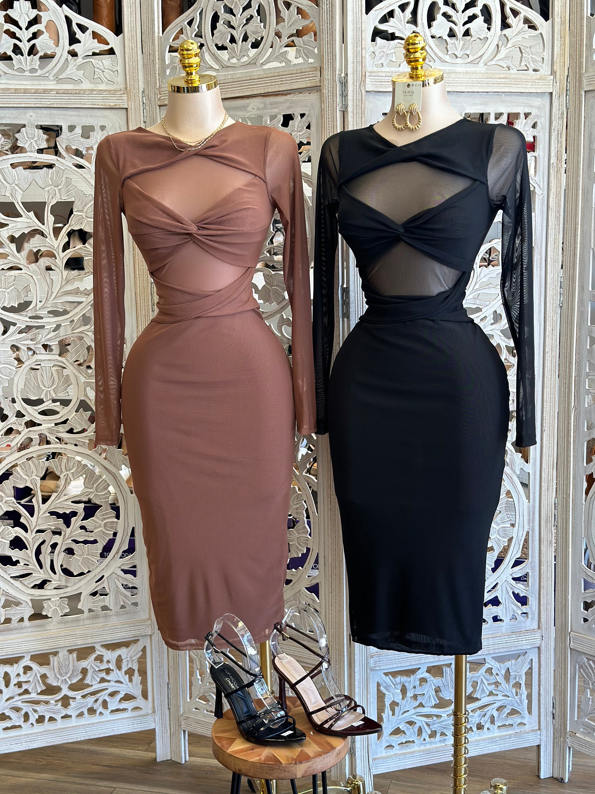 Knotted Long Sleeve Mesh Midi Dress - Estira, Stretchy