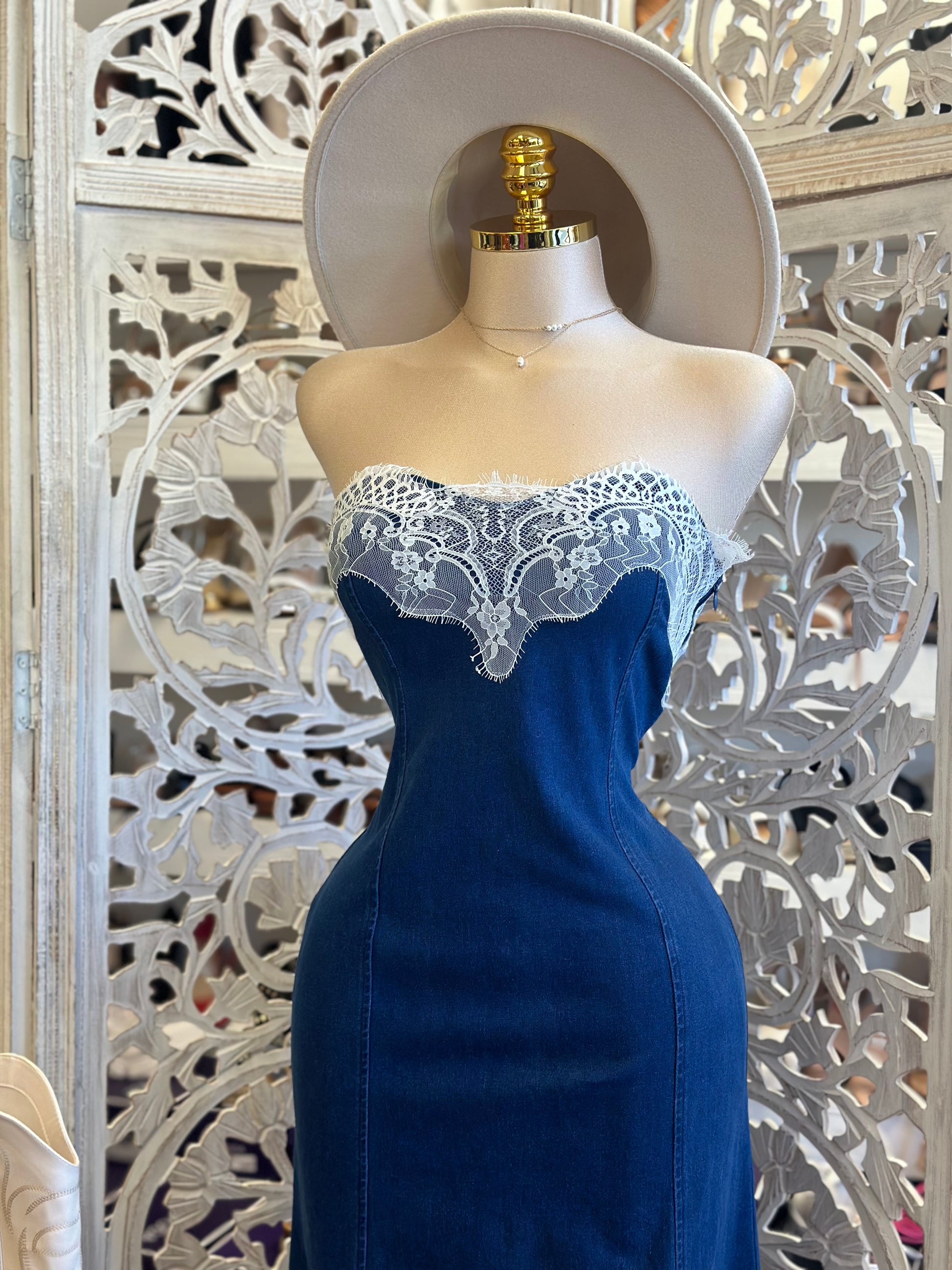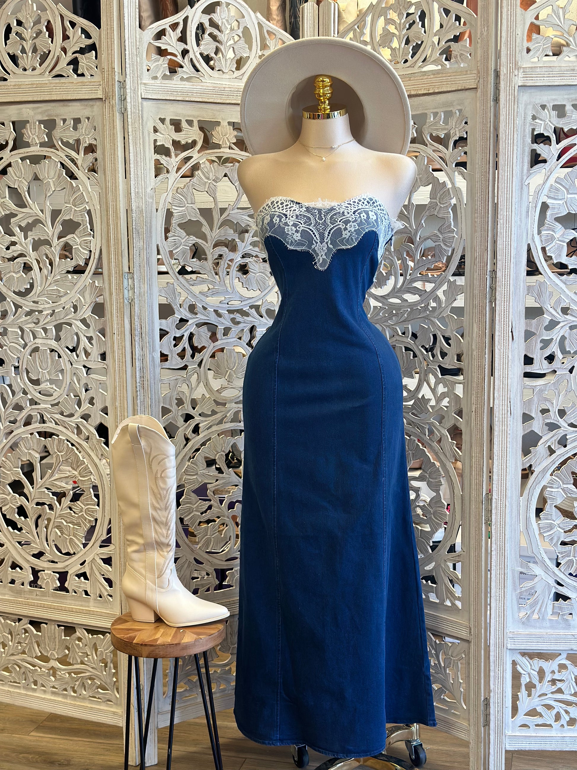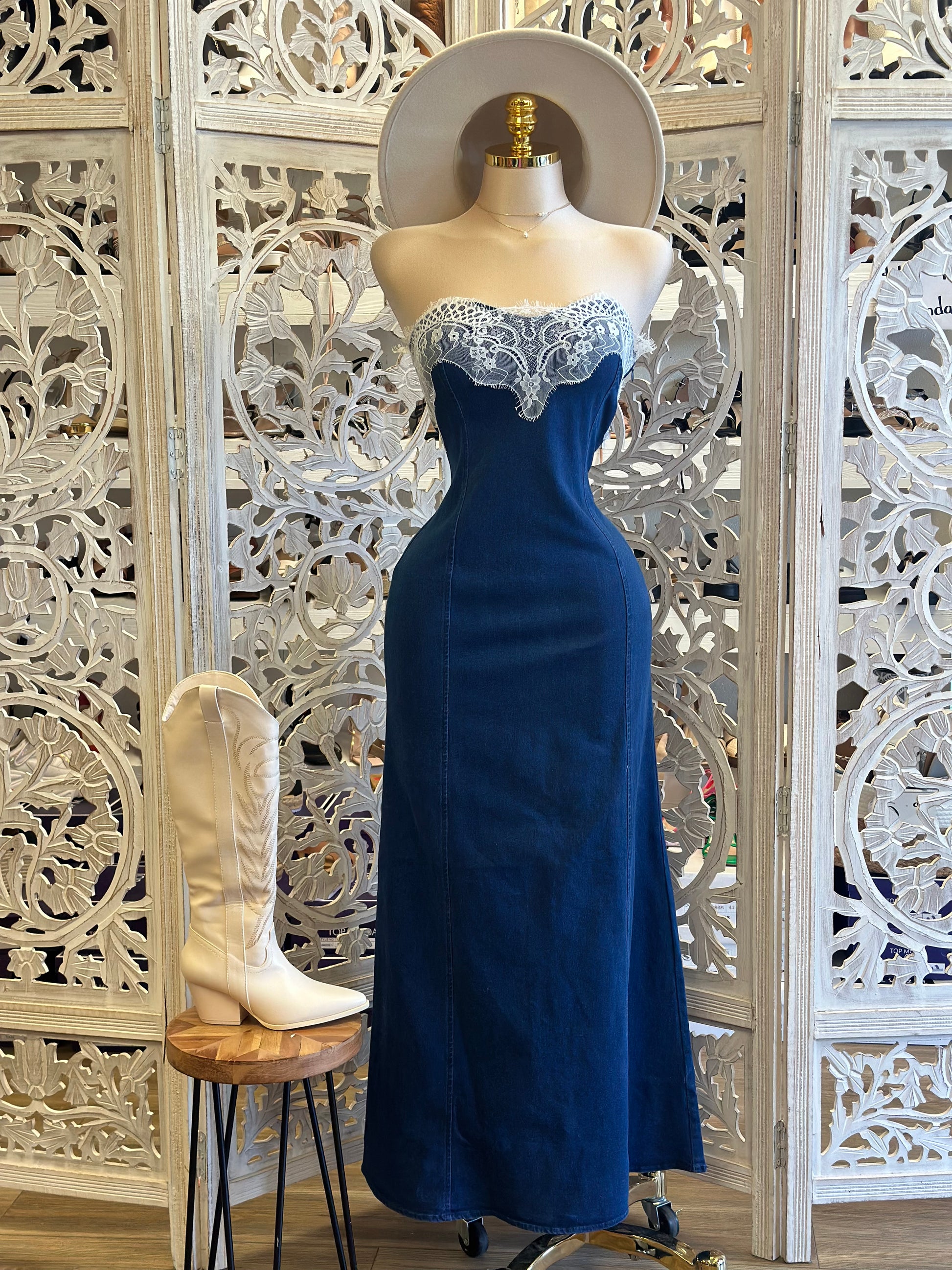 Lace Denim Maxi Dress - Slightly Stretchy, Estira Poco