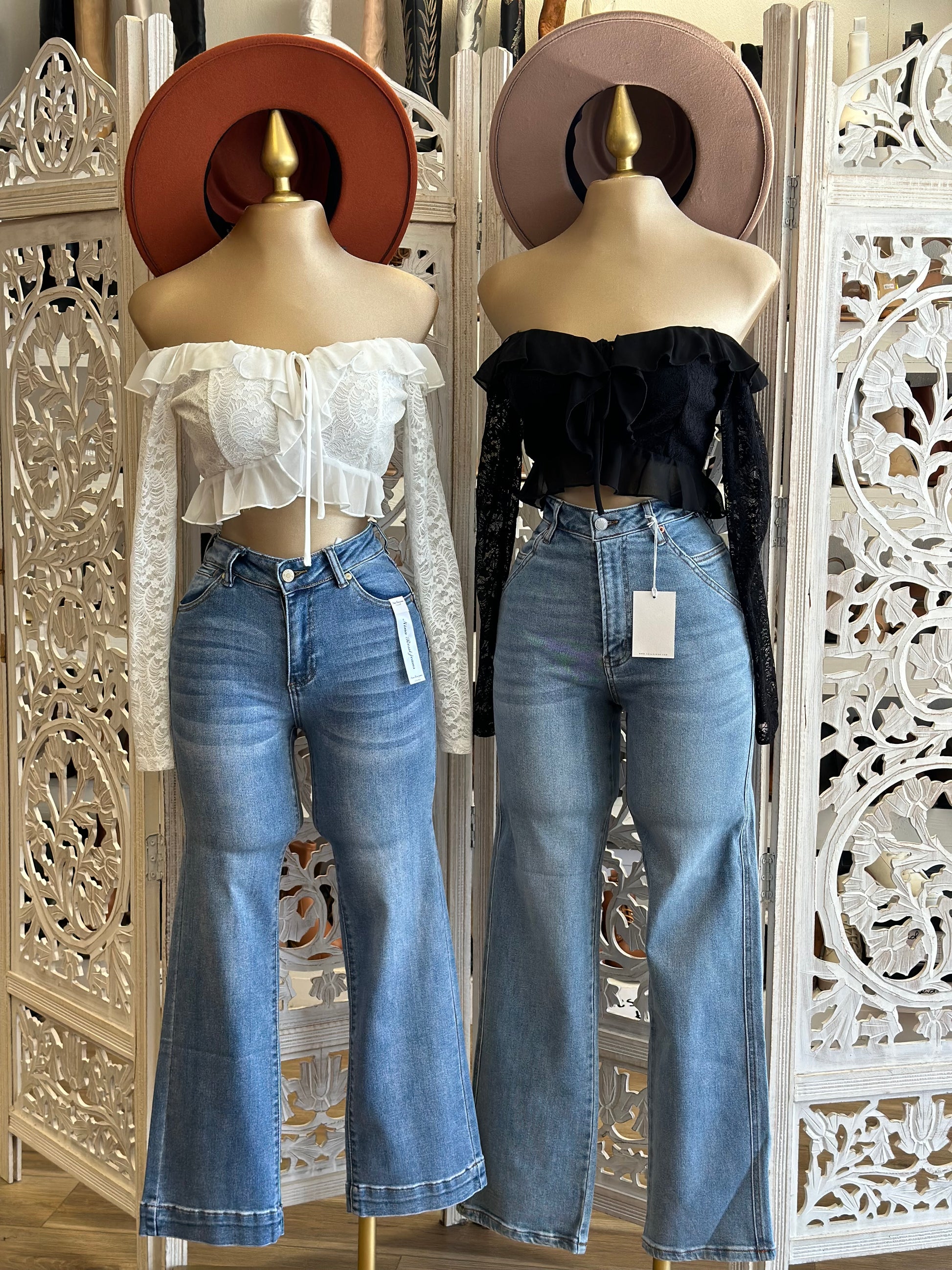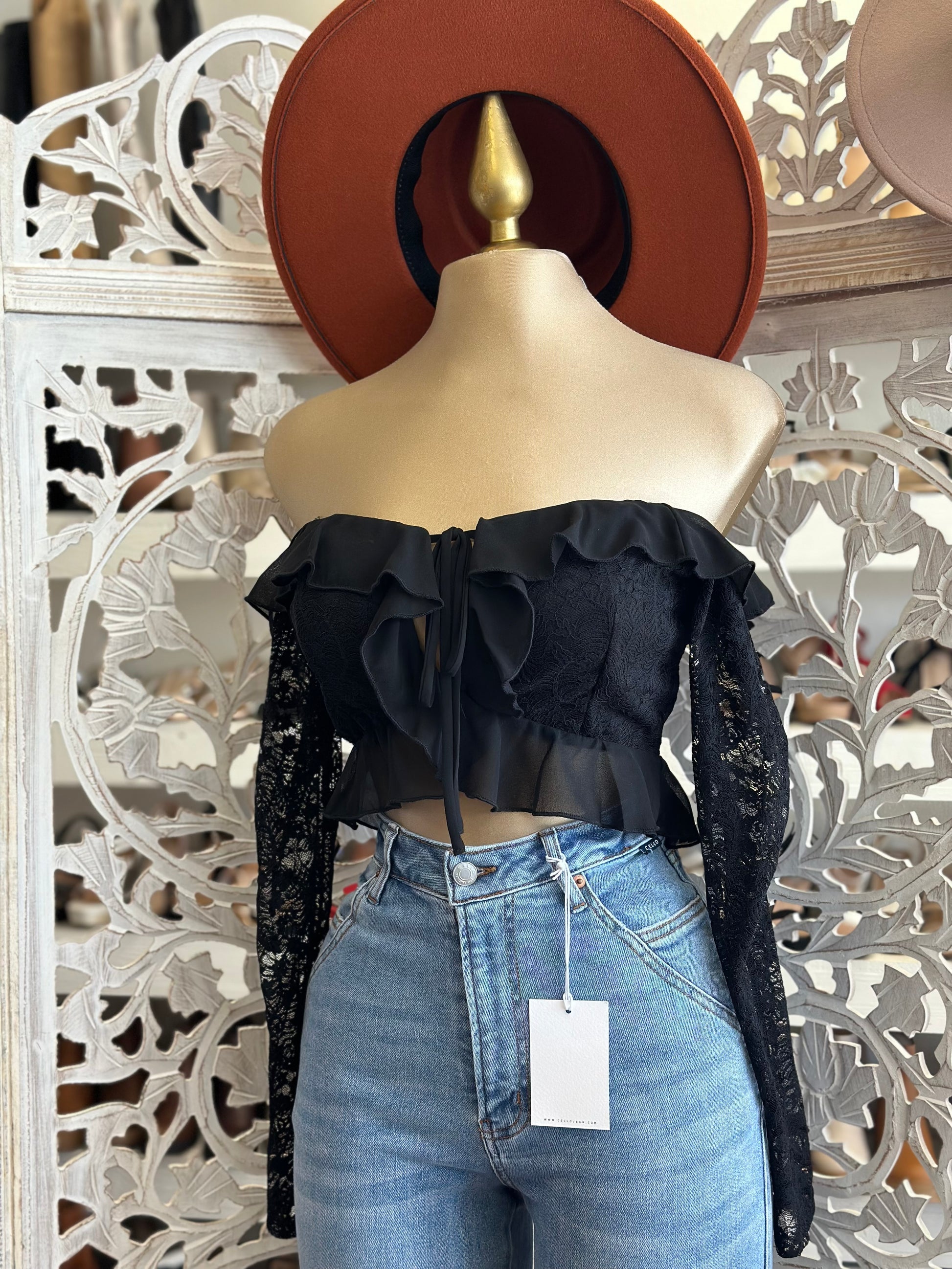 Lace Tie Off Shoulder Cropped Ruffled Blouse