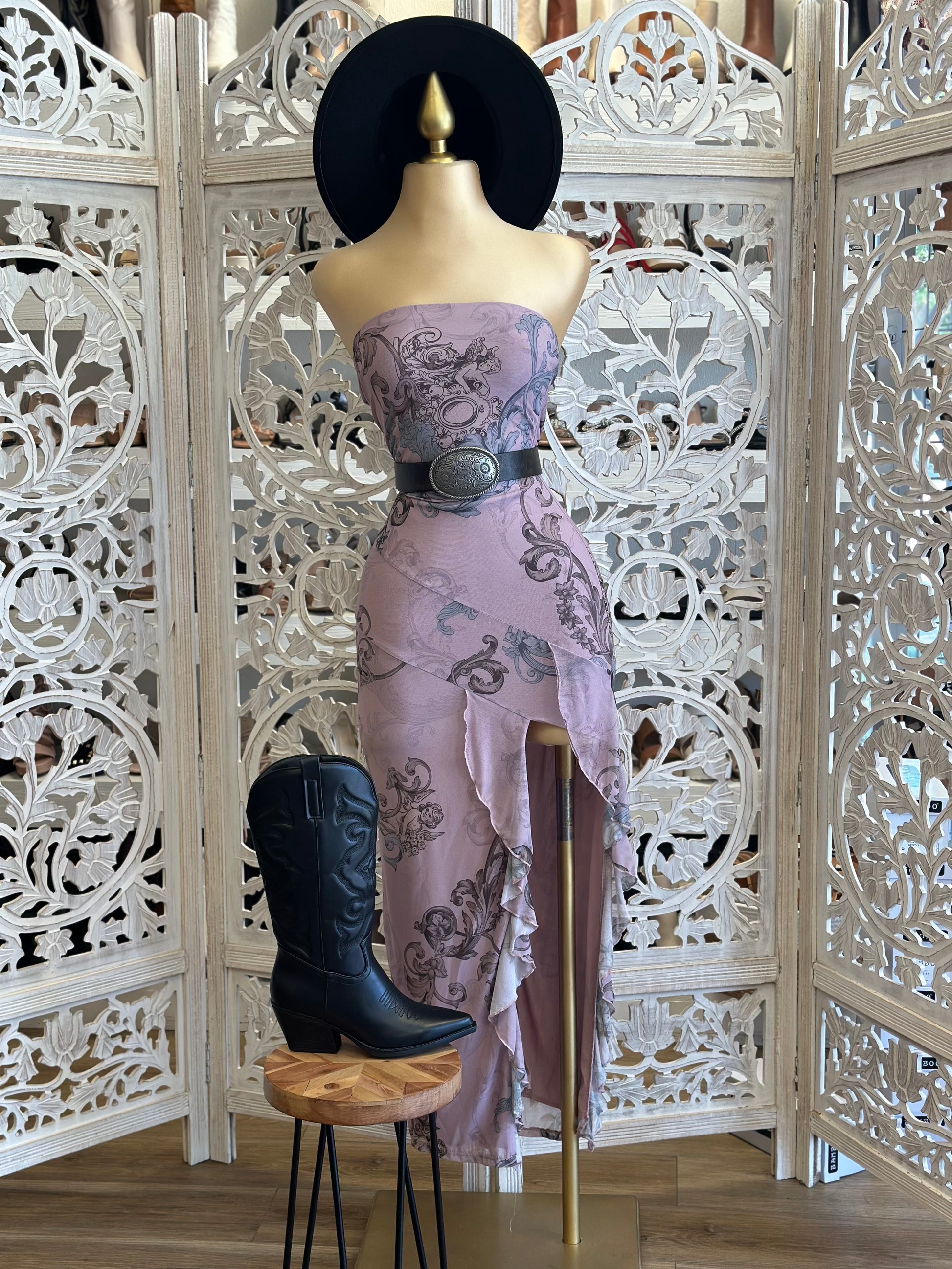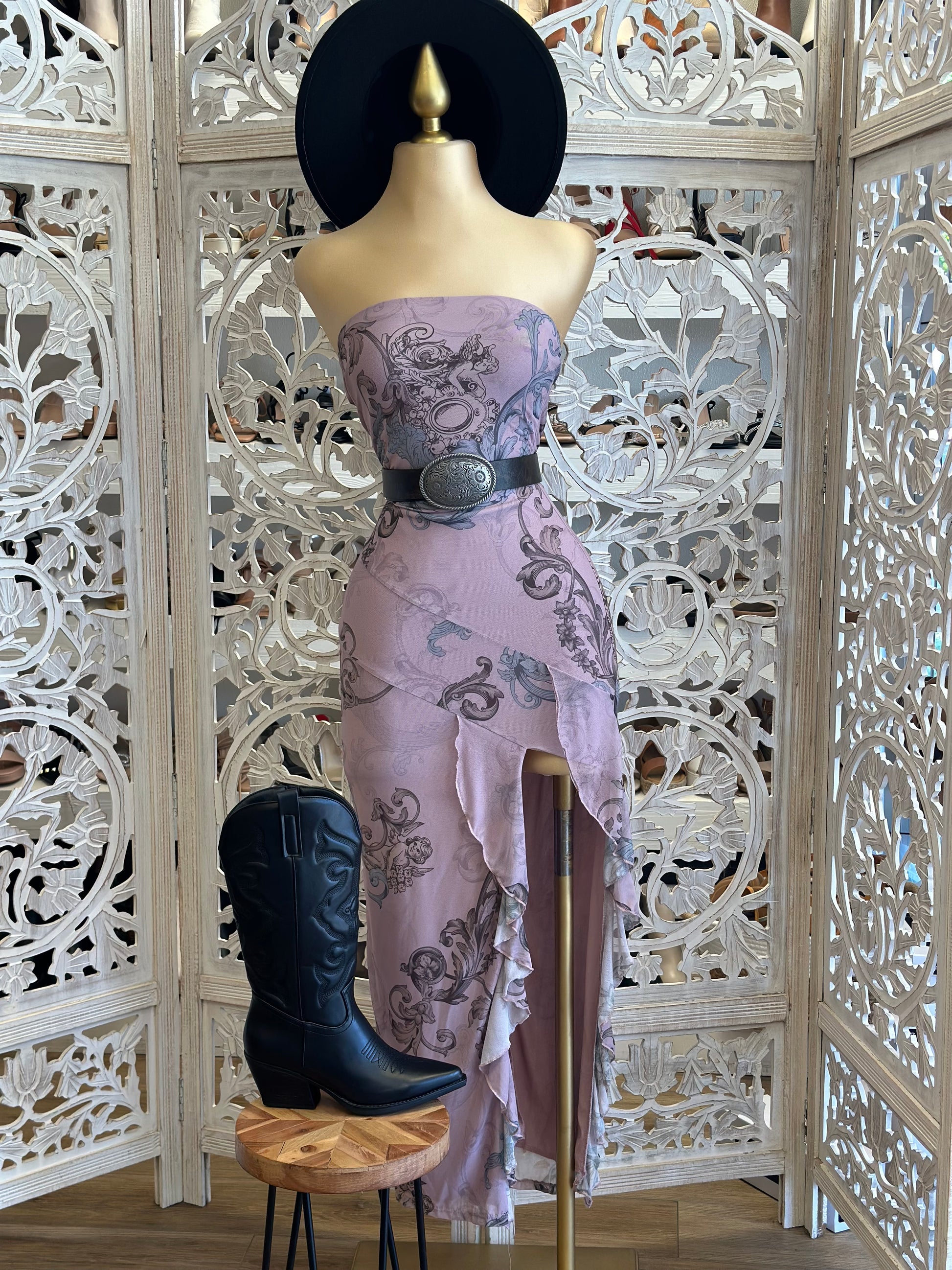 Lavender Patterned Strapless Ruffled Dress- Stretchy