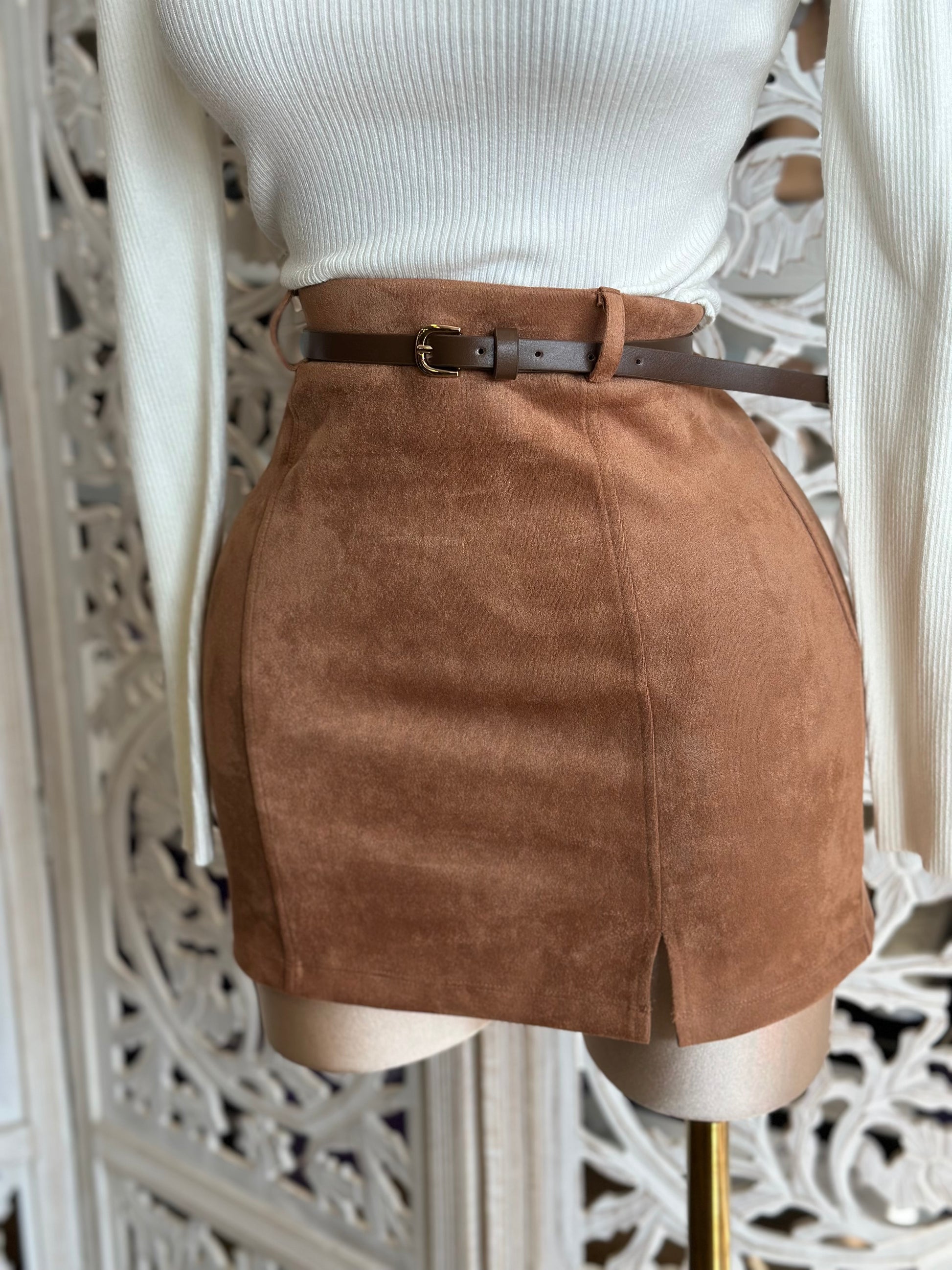 Light Brown Suede Mini Skirt with Belt - Estira, Stretchy