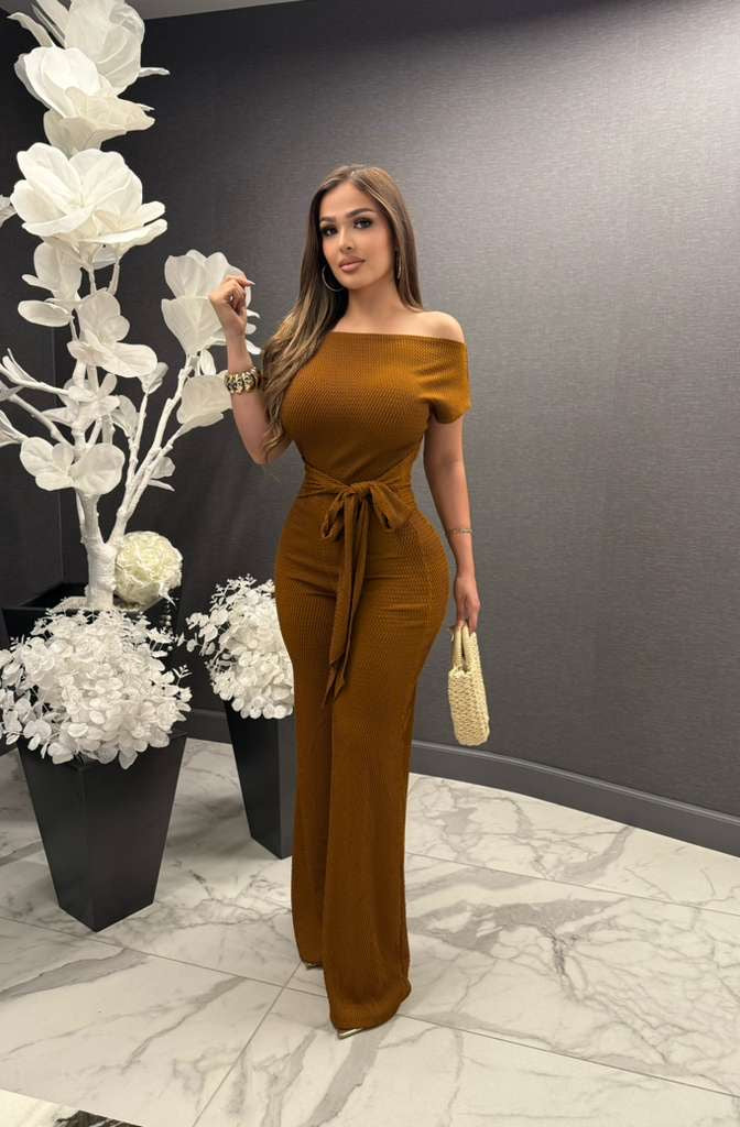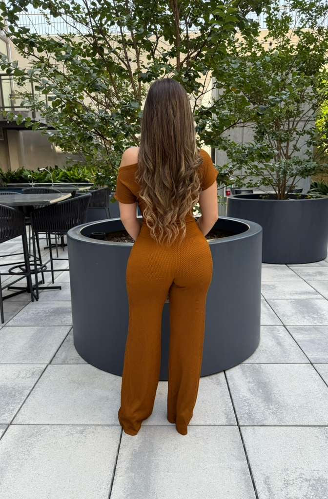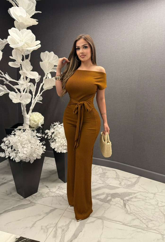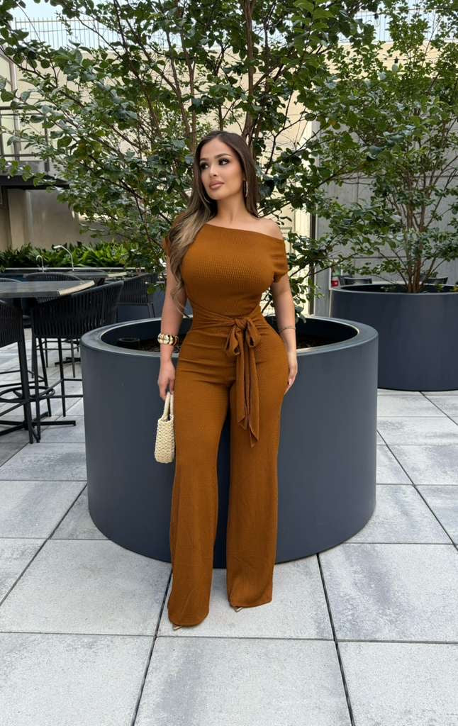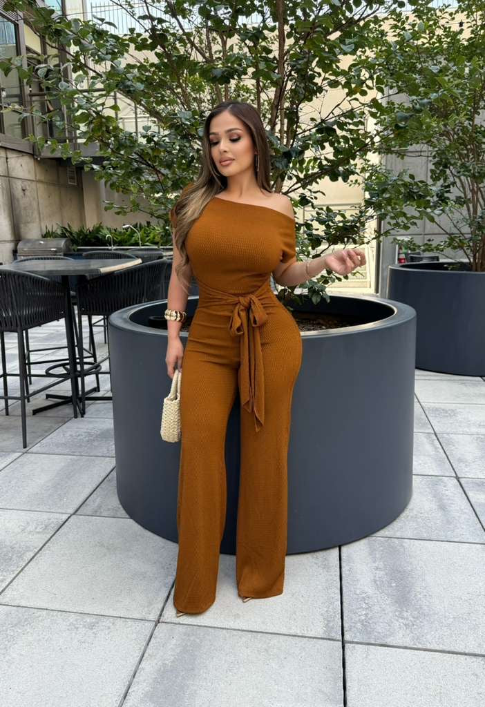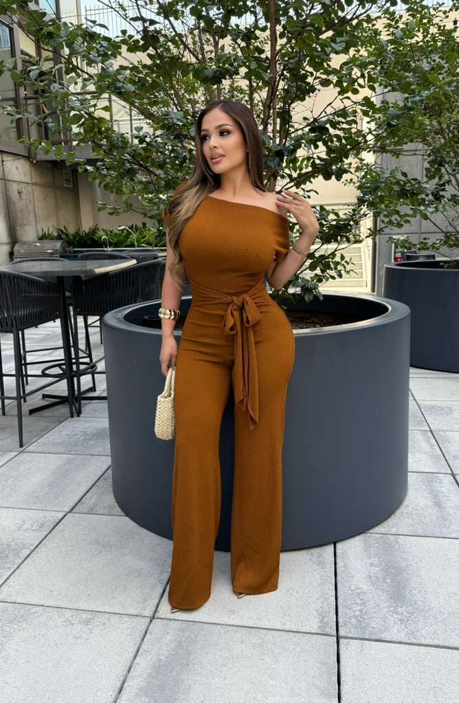 Mahogany Ribbed Asymmetrical Jumpsuit - Stretchy,Estira