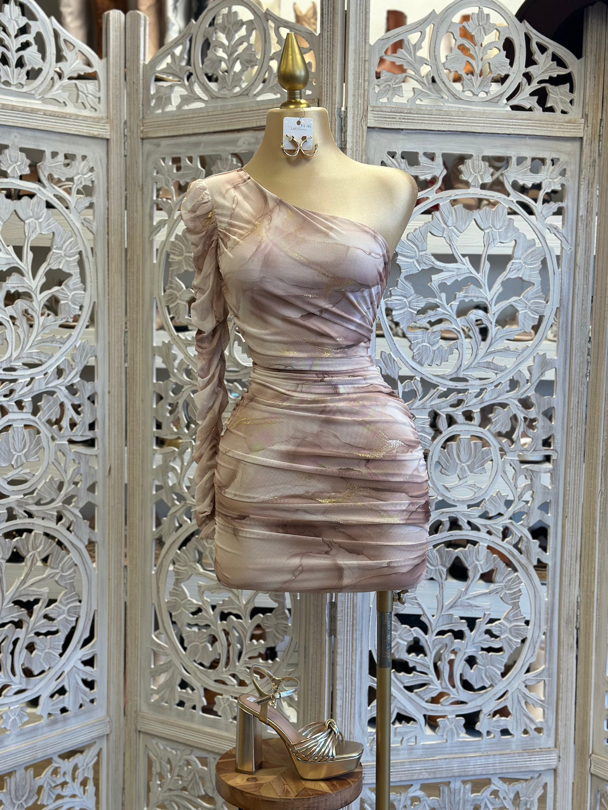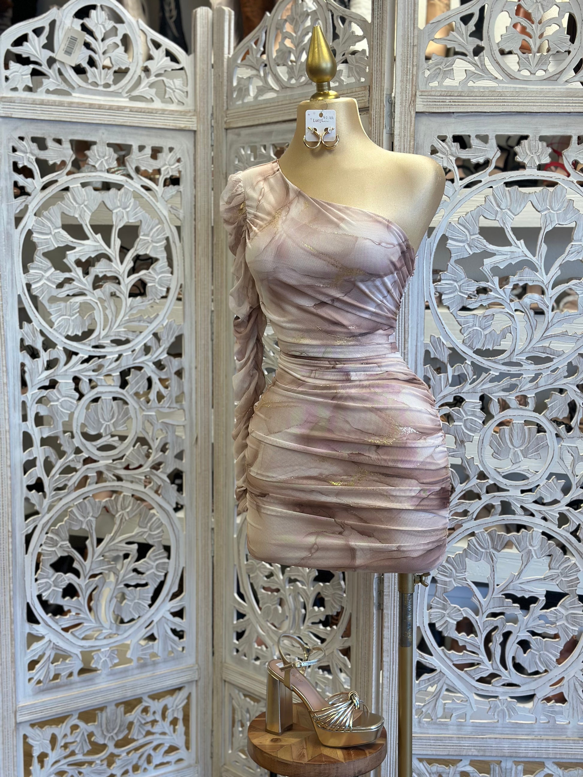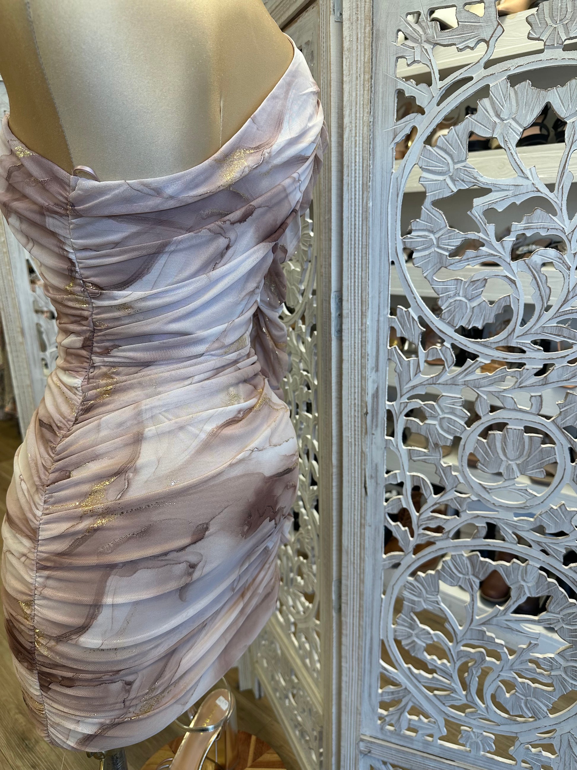 Marble One Sleeve Ruched Mini Dress- Stretchy