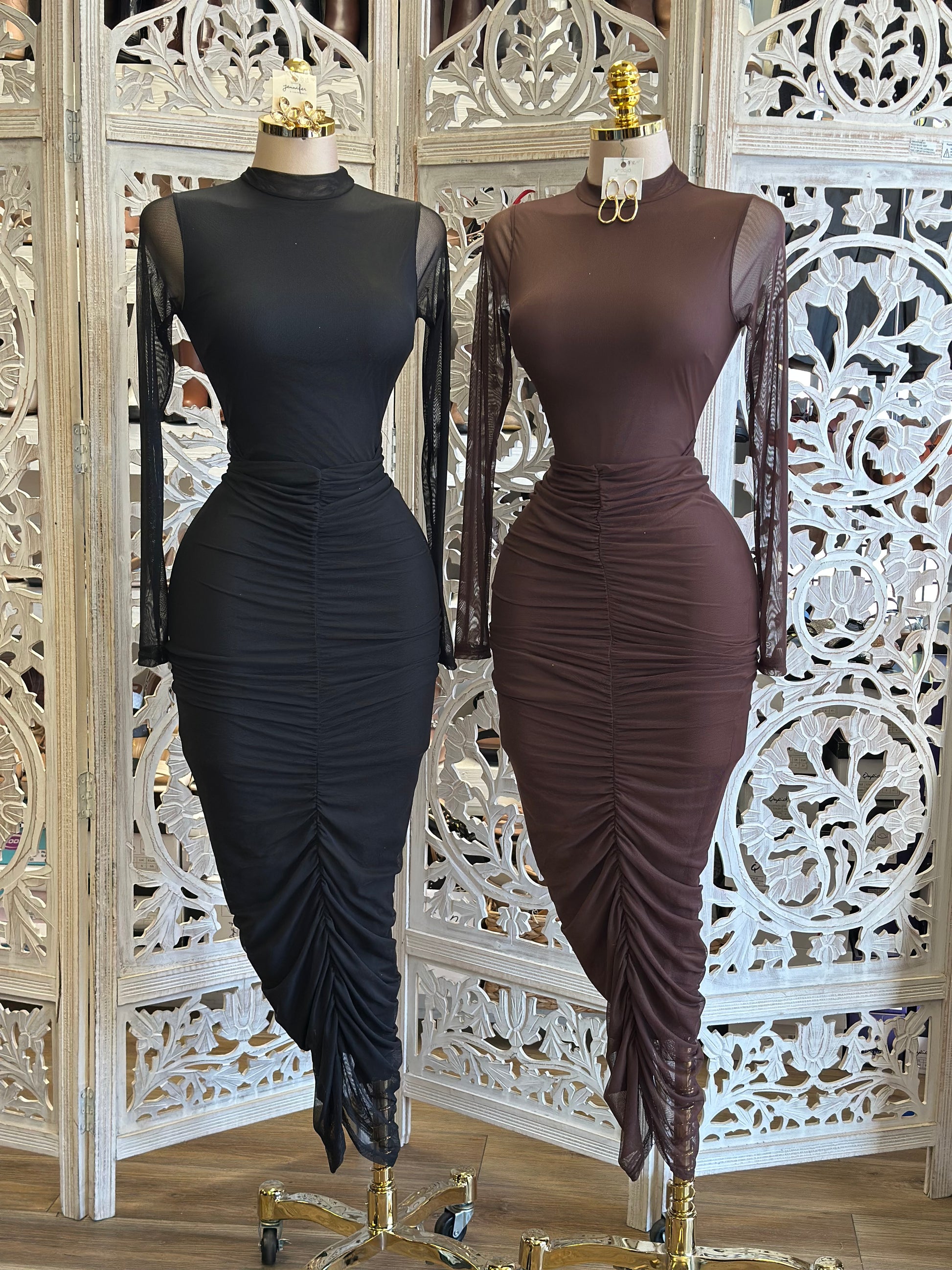 Mesh Embroidered Sleeve Ruched Dress- Stretchy,Estira