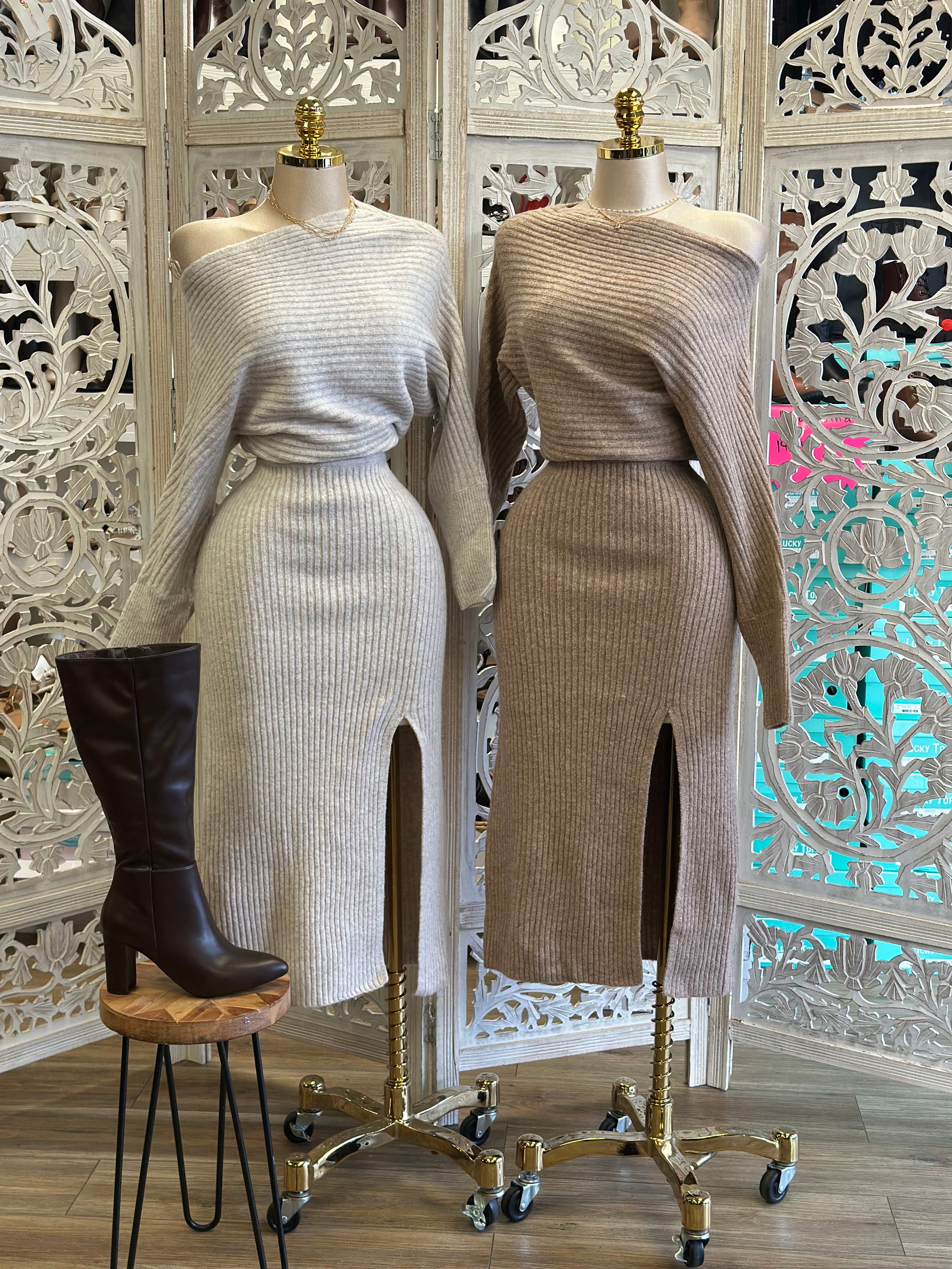 Neutral Off Shoulder Sweater Dress- Stretchy,Estira