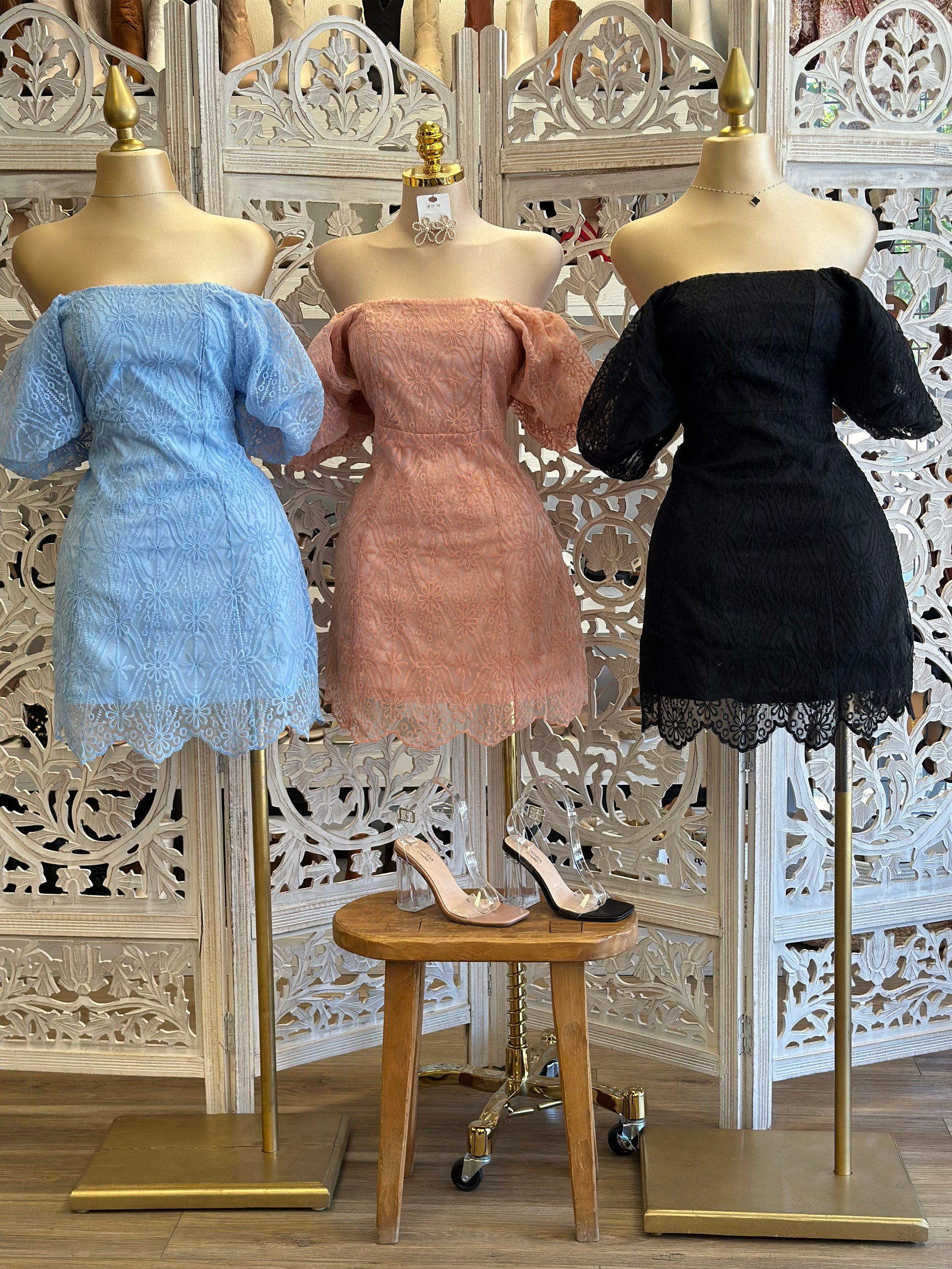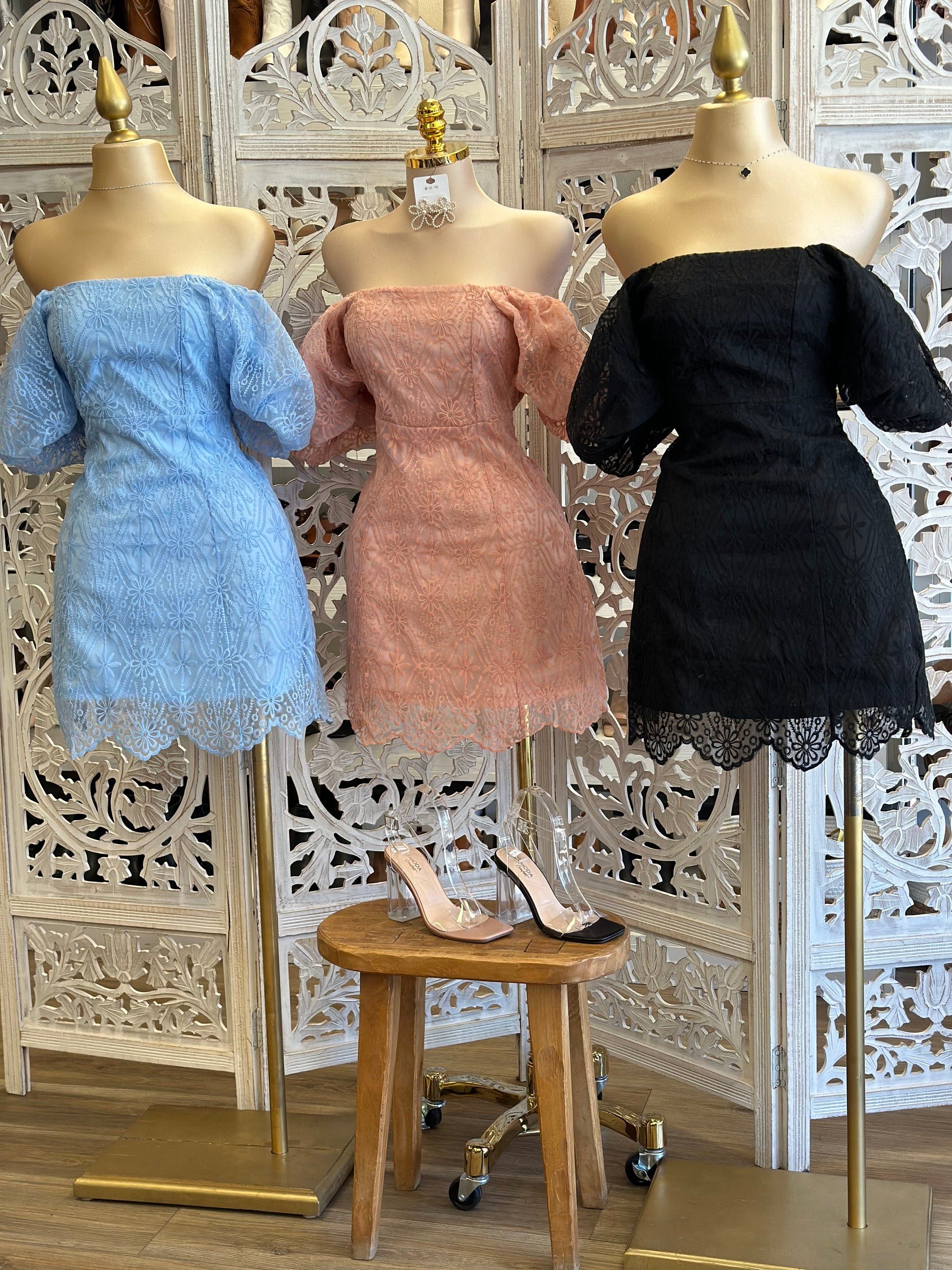 Off Shoulder Lace Embroidered Mini Dress- Not Stretchy, No Estira