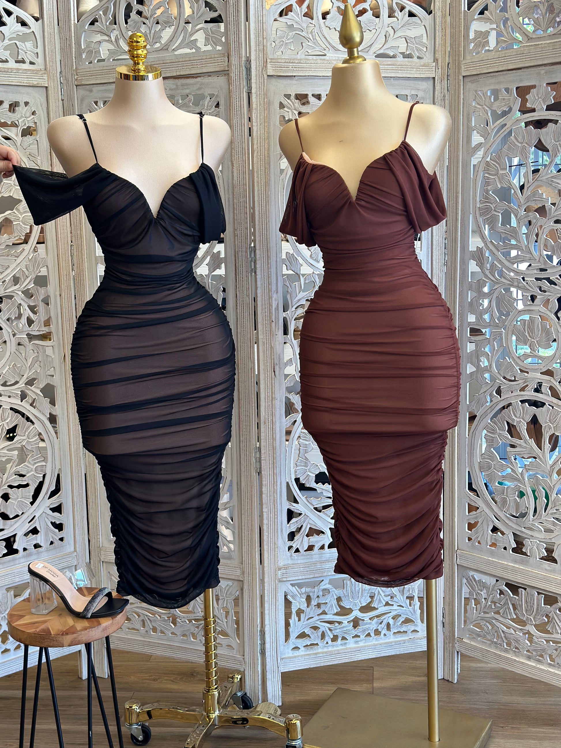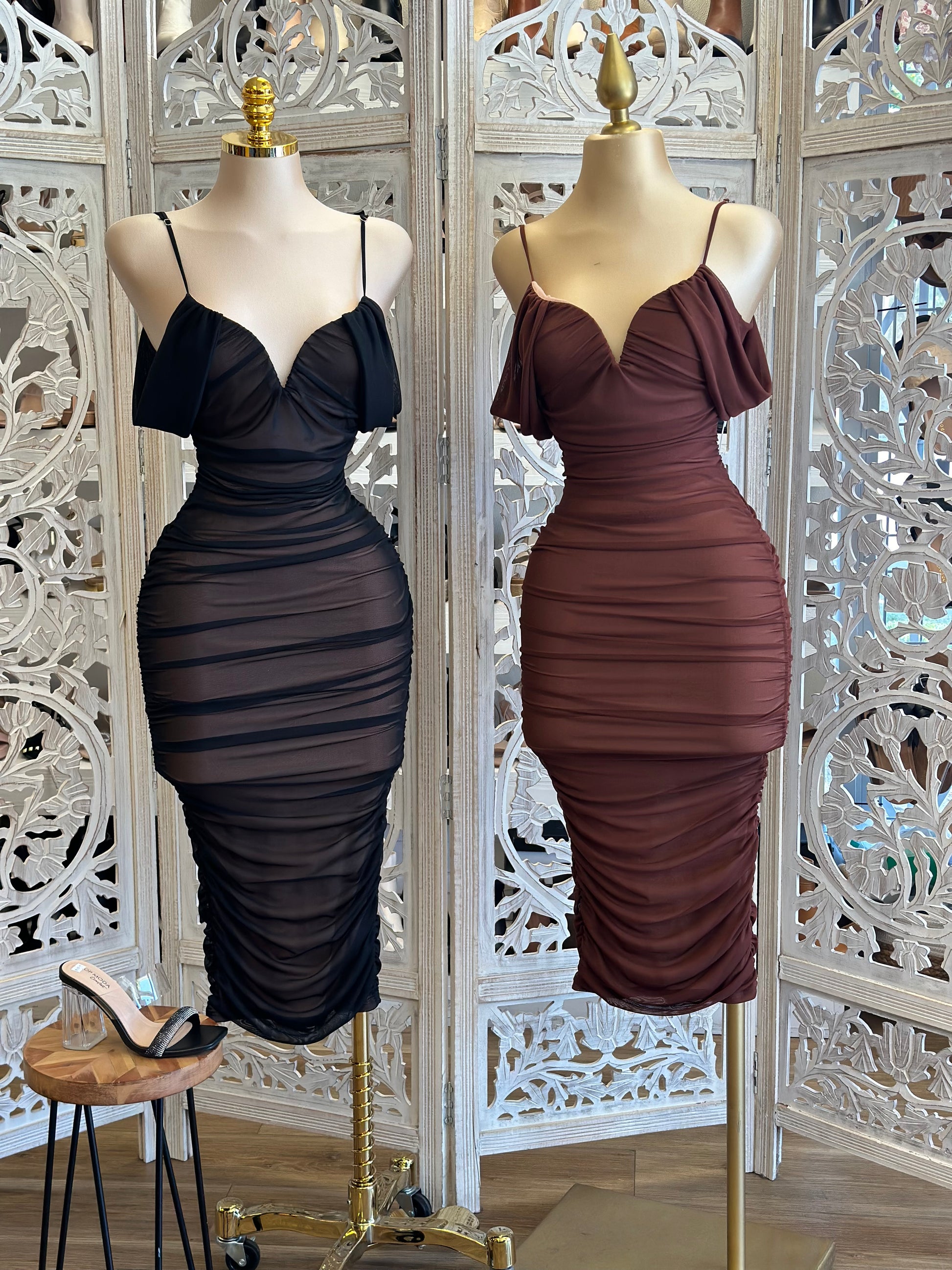 Off Shoulder Midi Bodycon Ruched Dress- Stretchy