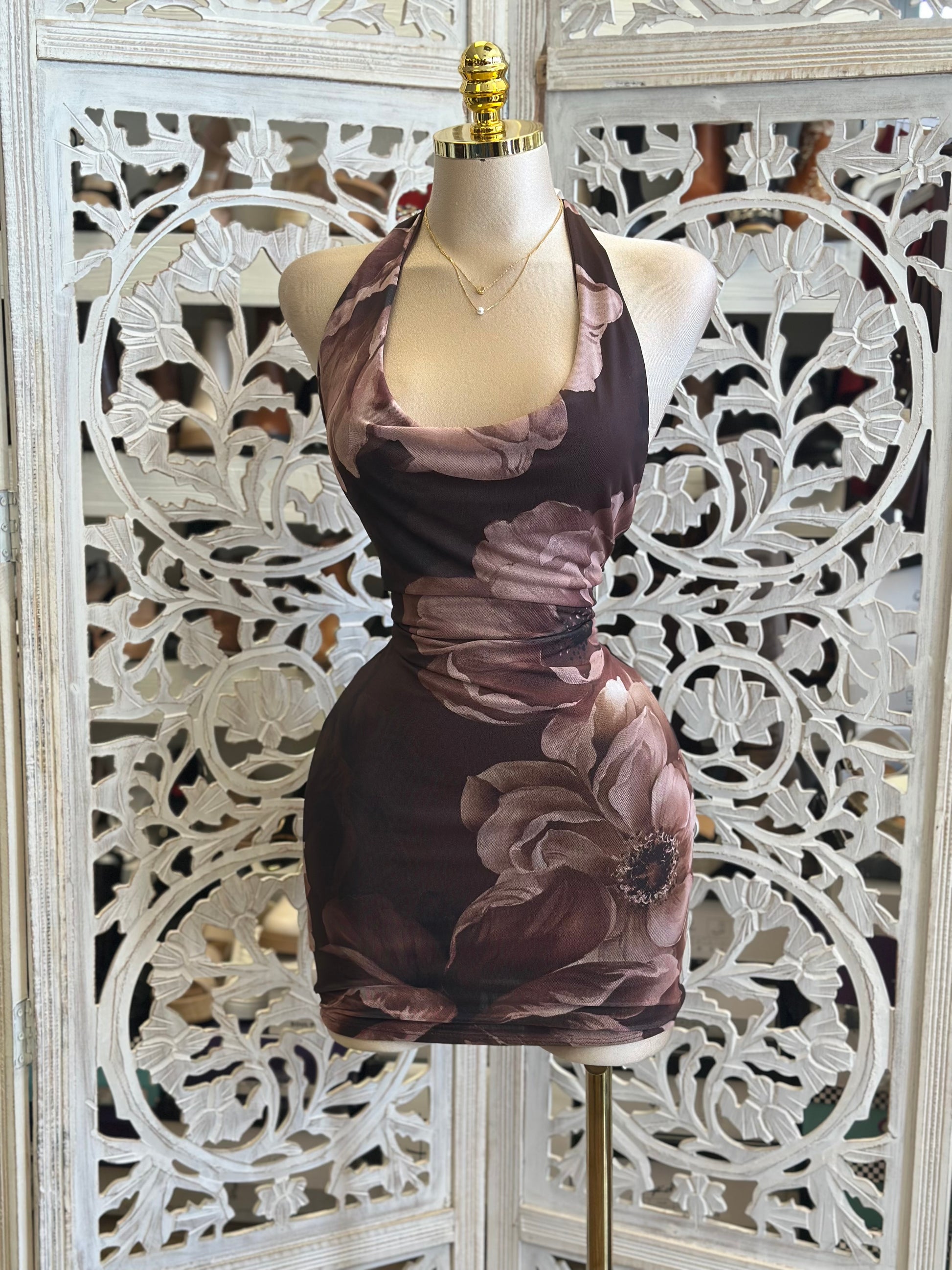 Oval Neck Floral Mini Dress-Estira, Stretchy