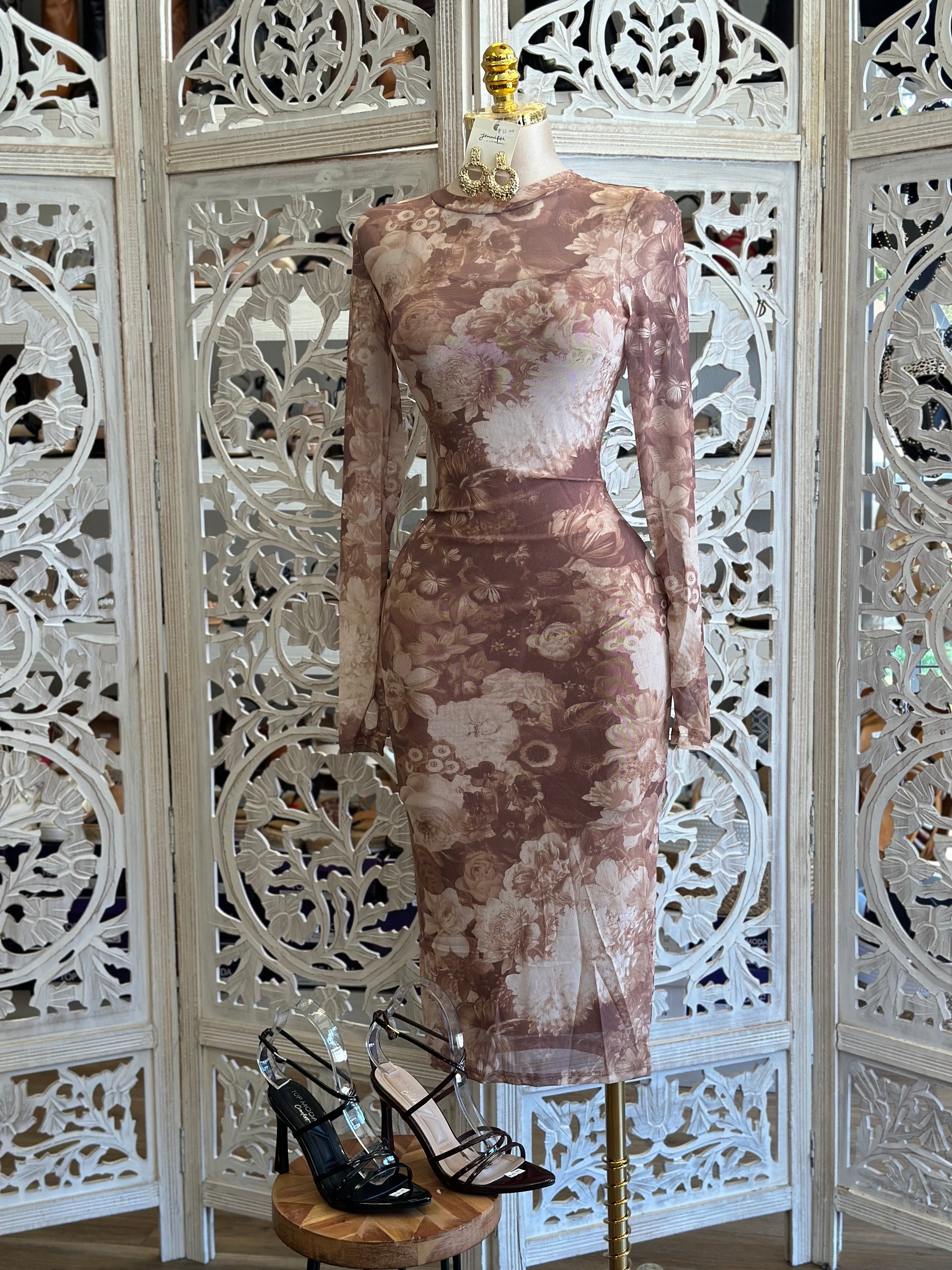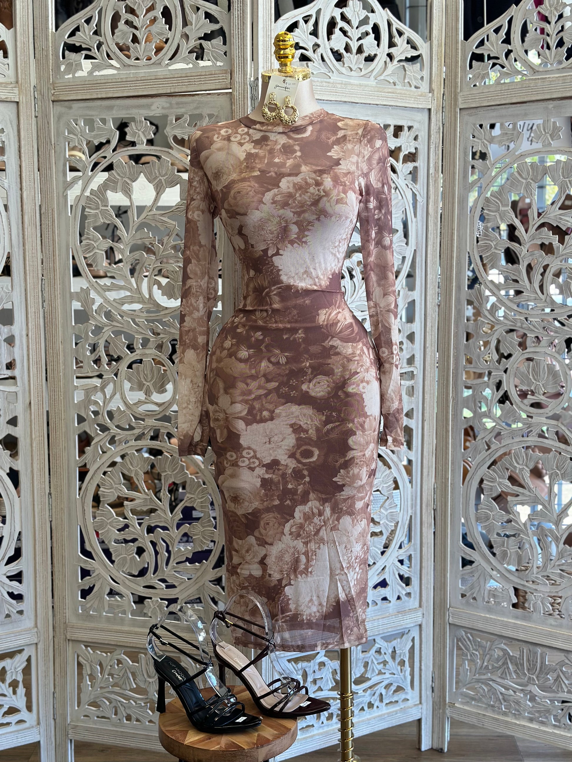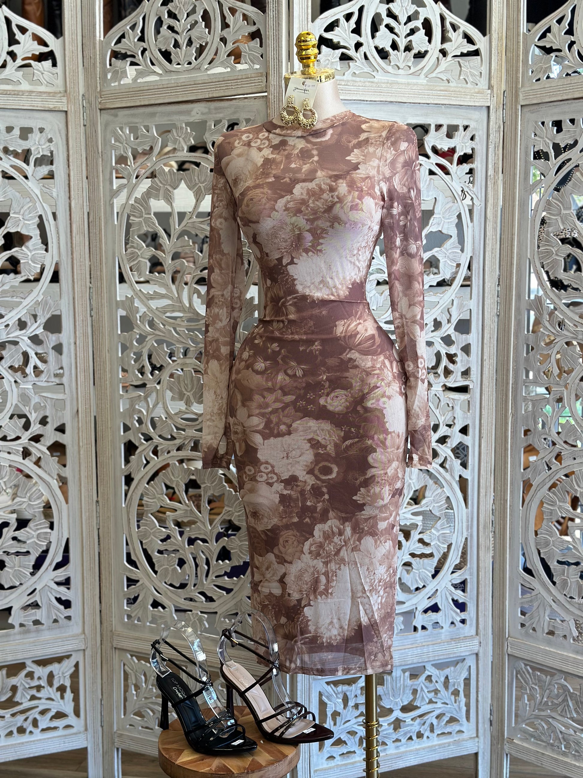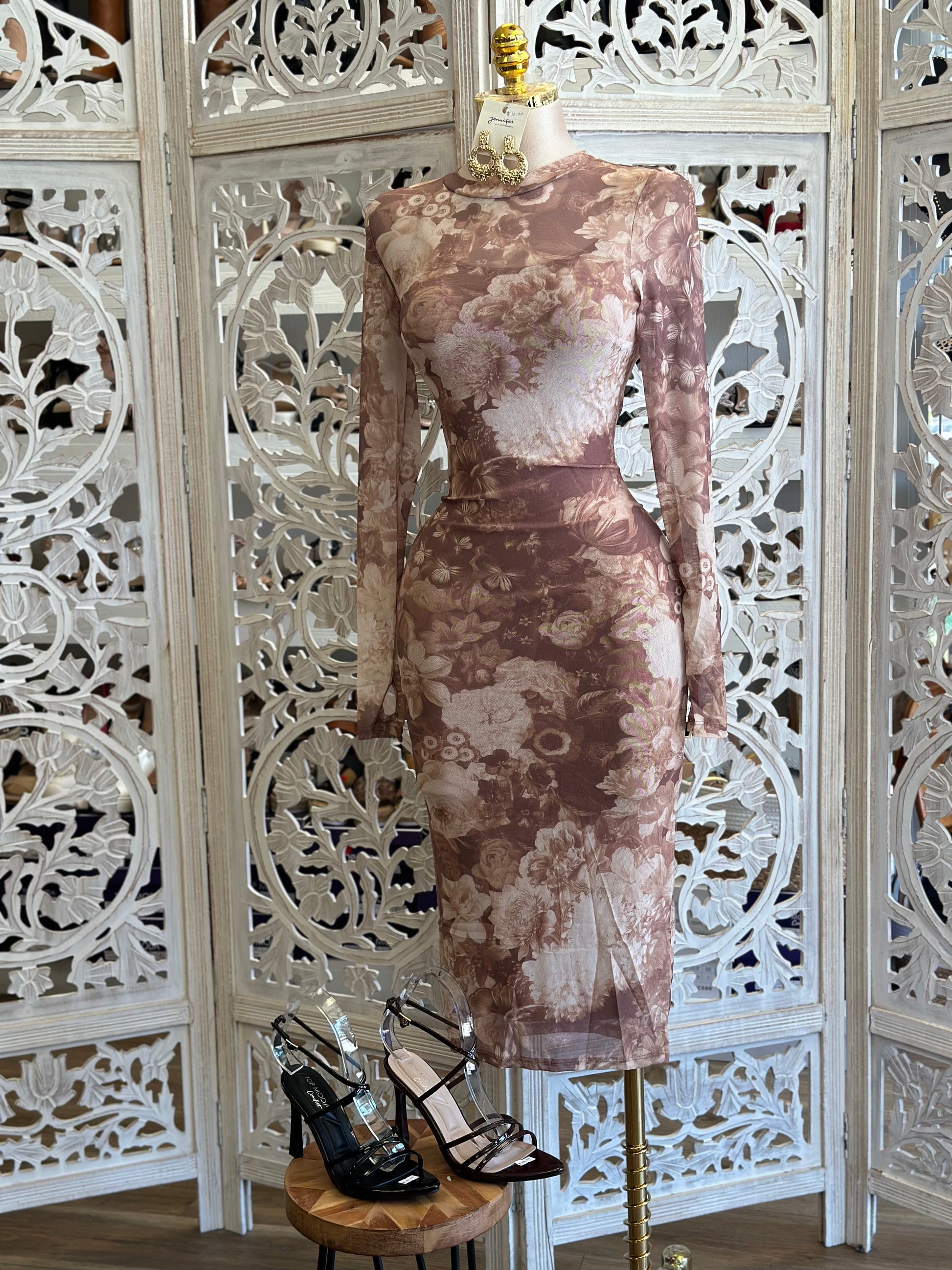 Pattern Long Sleeve Mesh Midi Dress - Estira, Stretchy