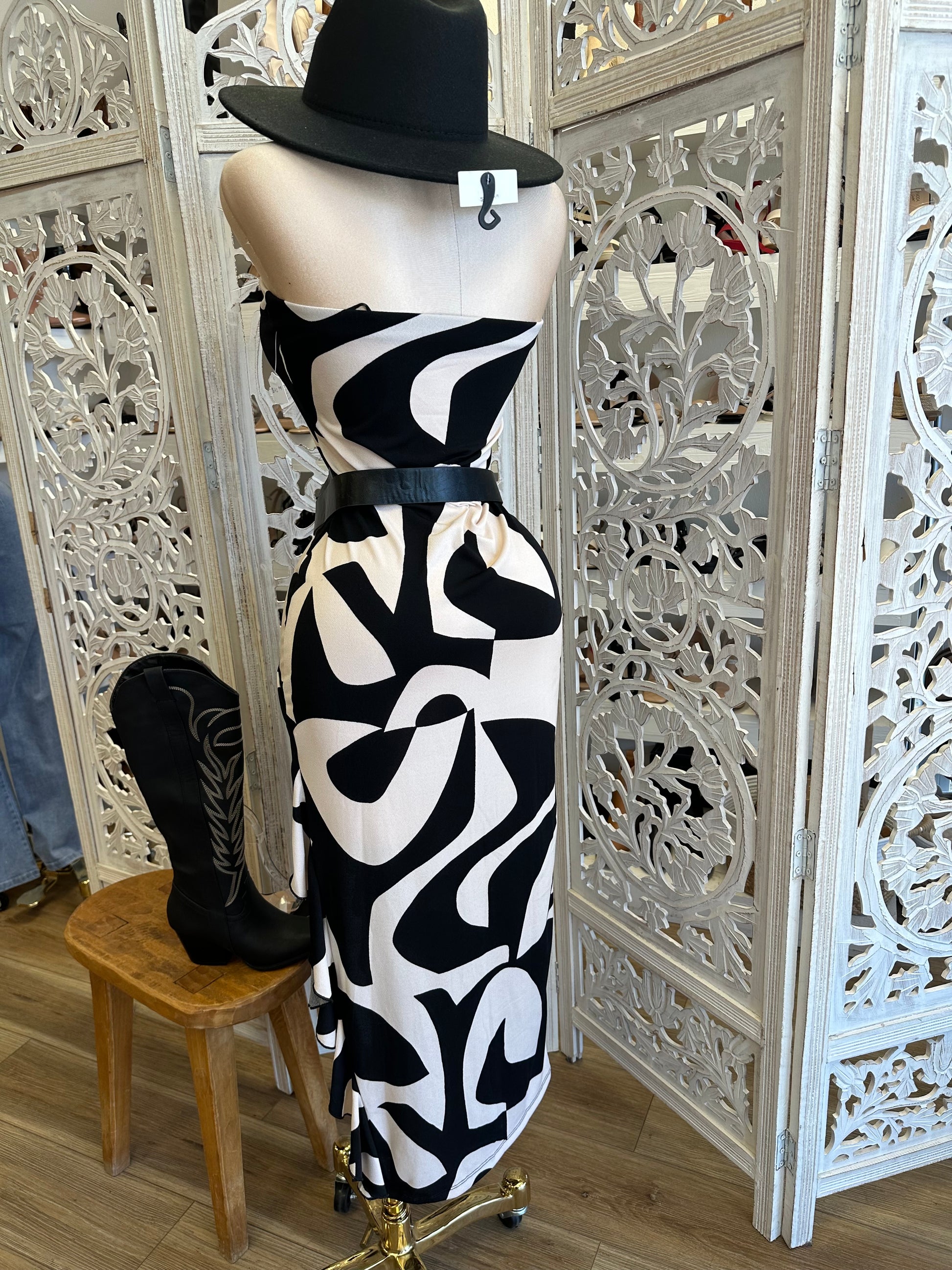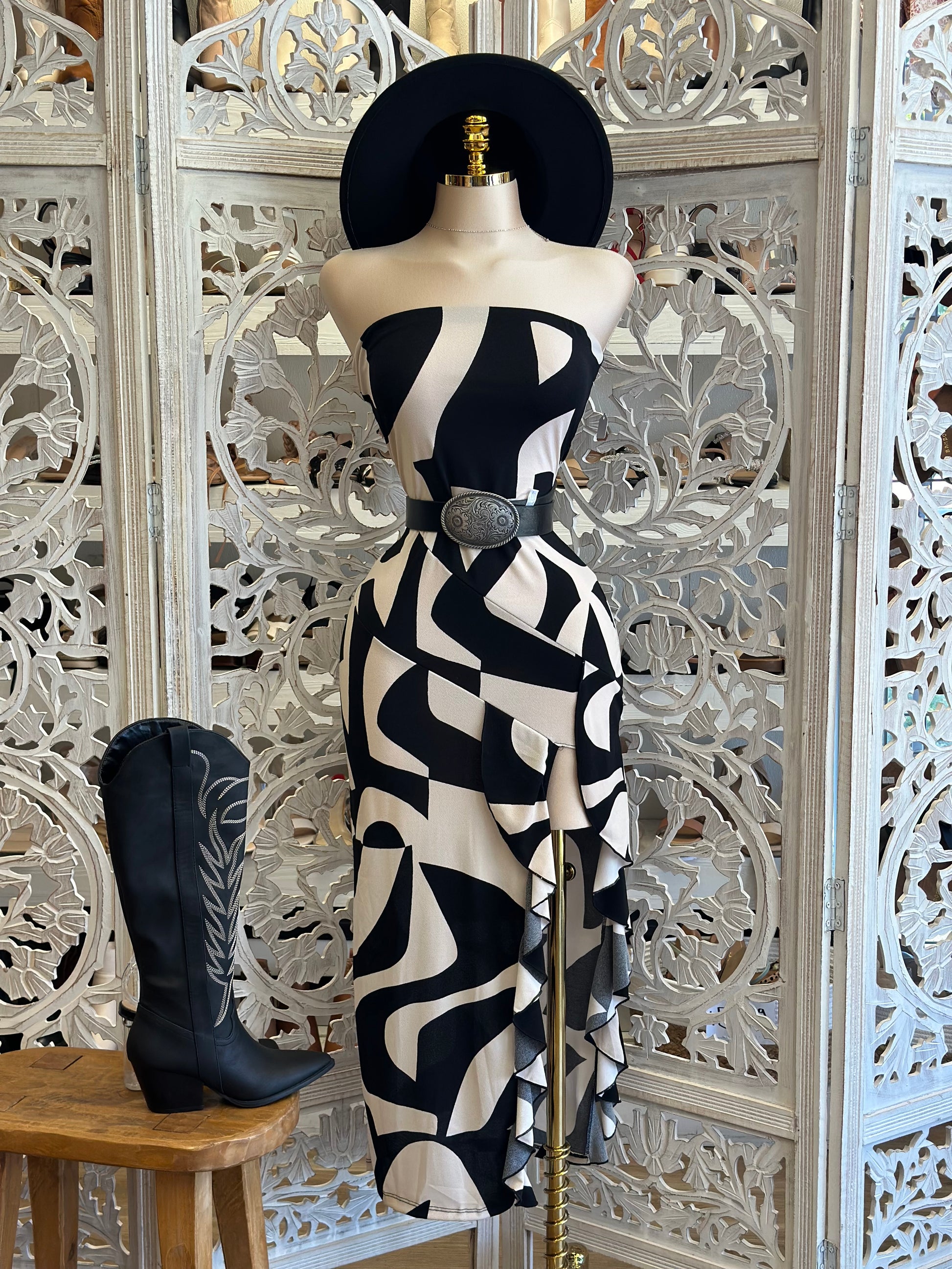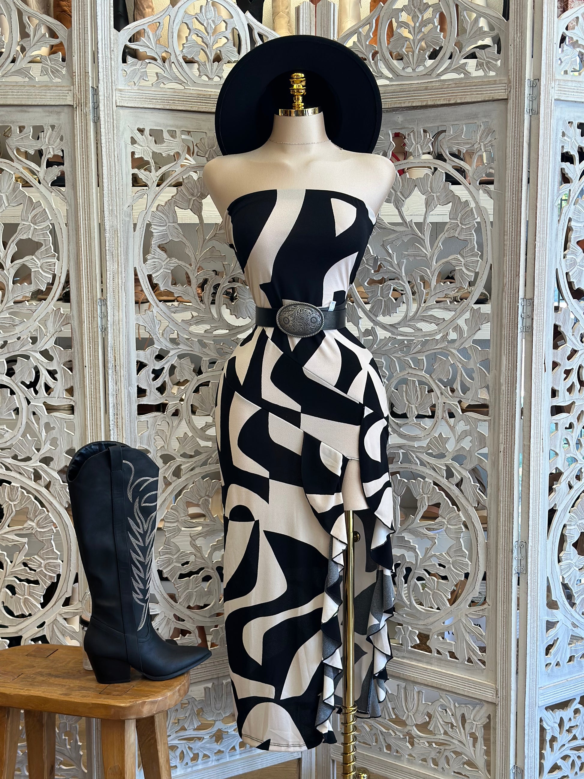 Patterned Strapless Ruffled Dress- Stretchy, Estira