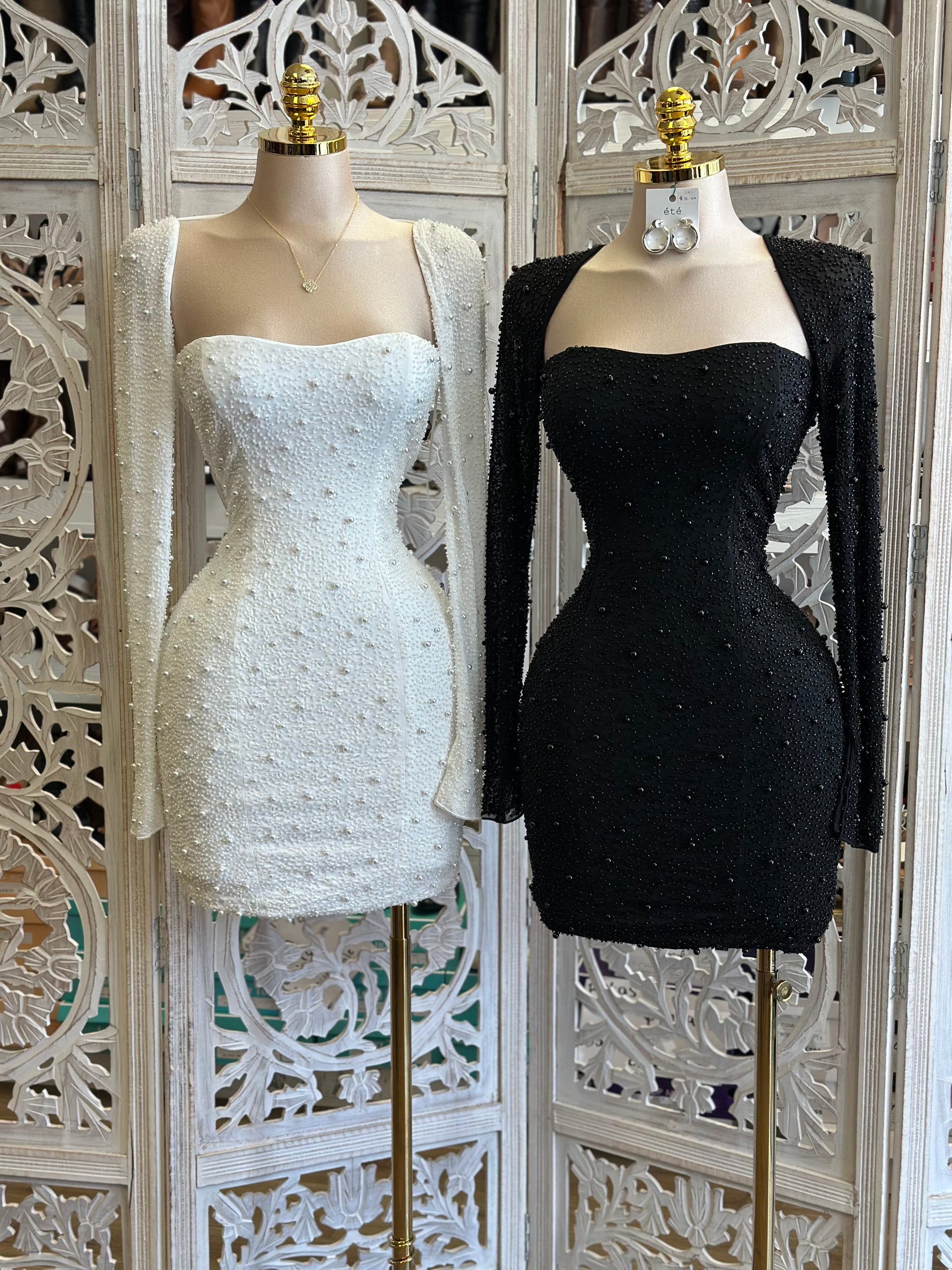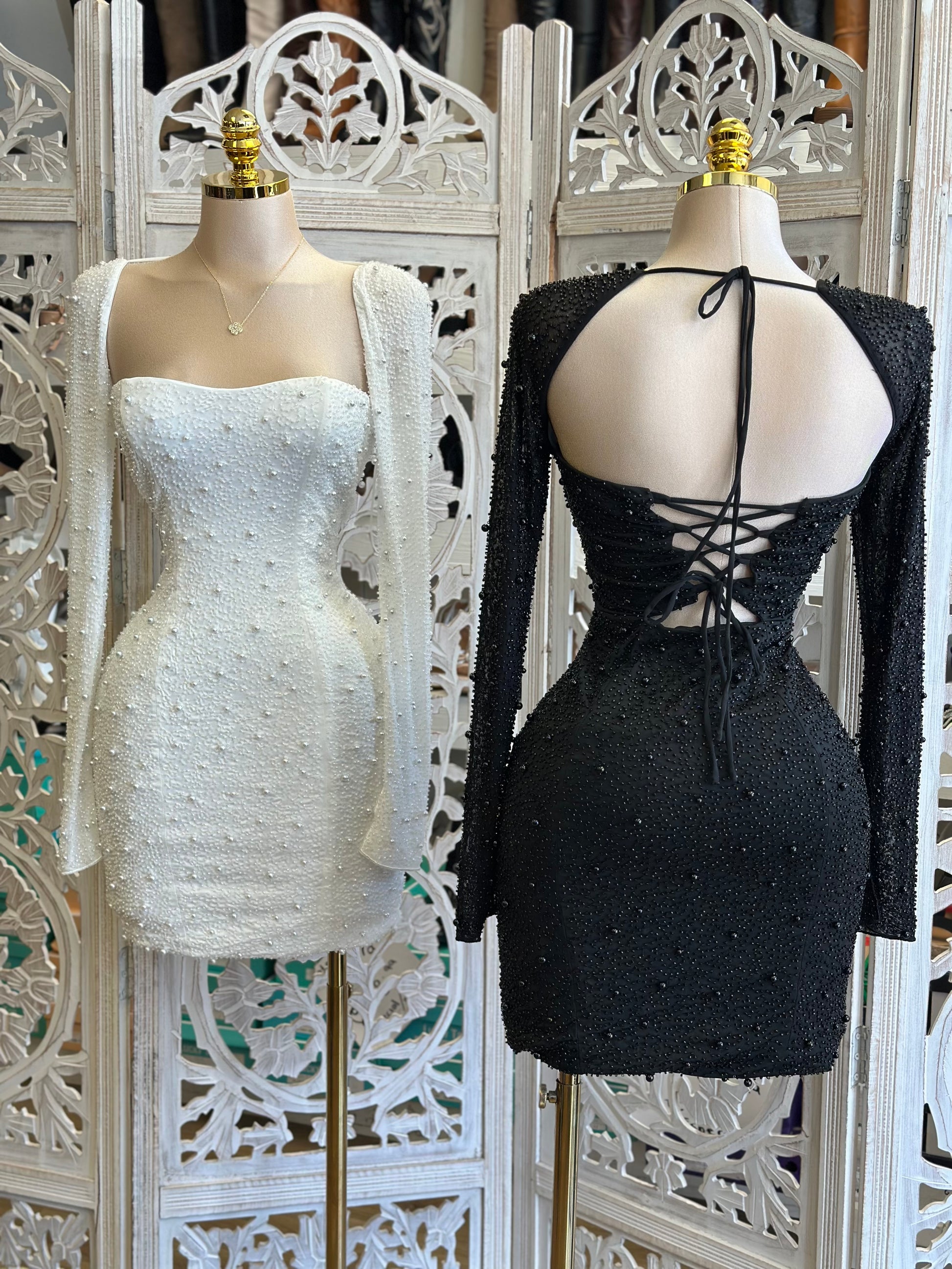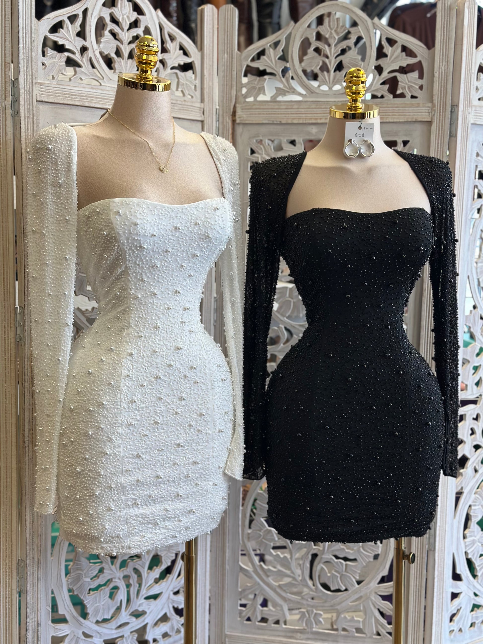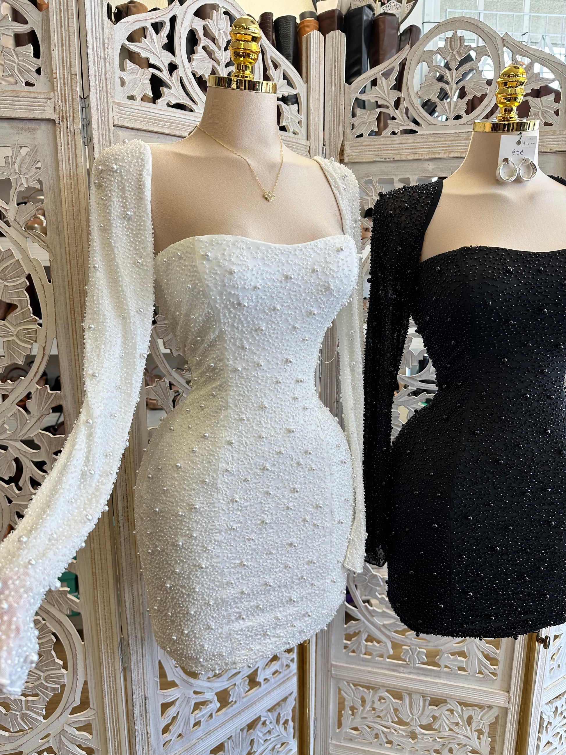 Pearl Embellished Square Neck Mini Dress- Stretchy ,Estira