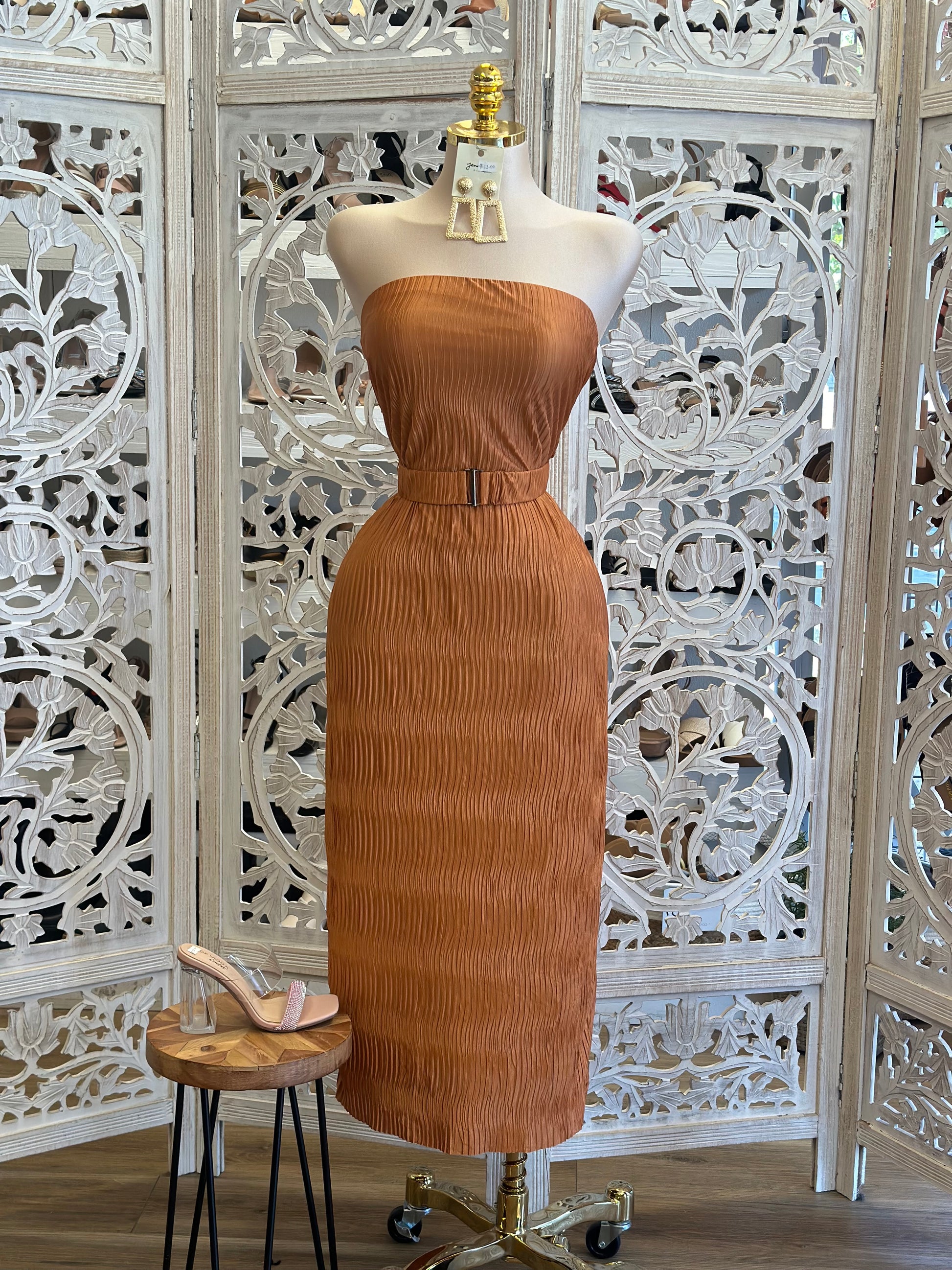 Pleated Rust Strapless Dress - Estira, Stretchy