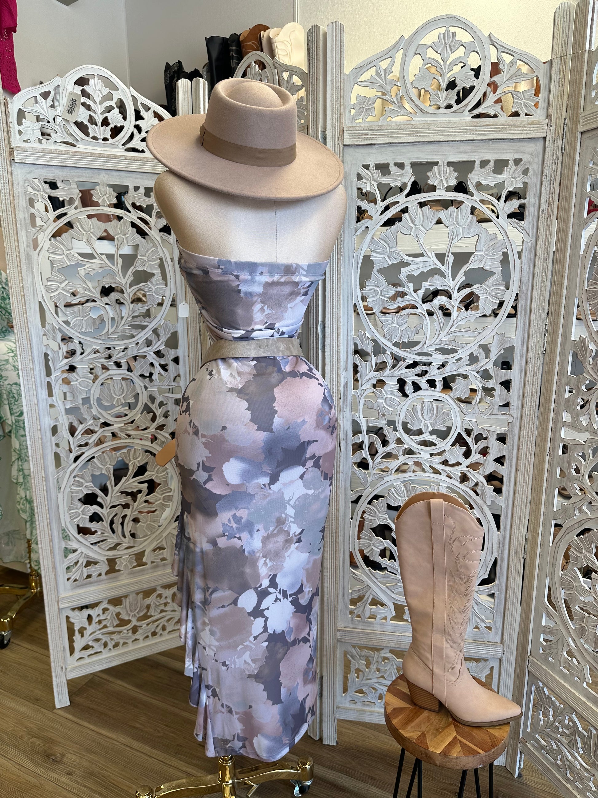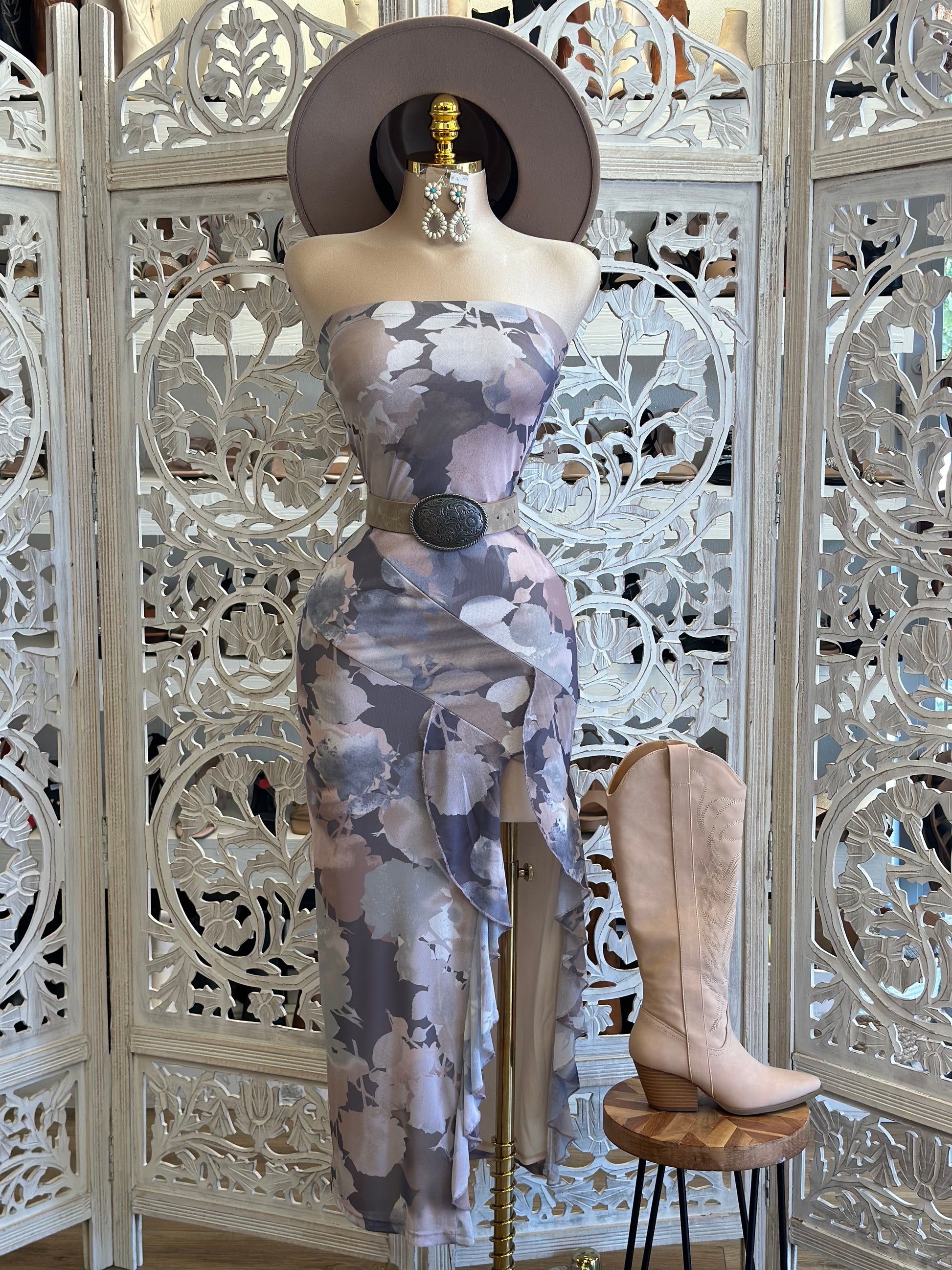 Purple Patterned Strapless Ruffled Dress- Stretchy, Estira
