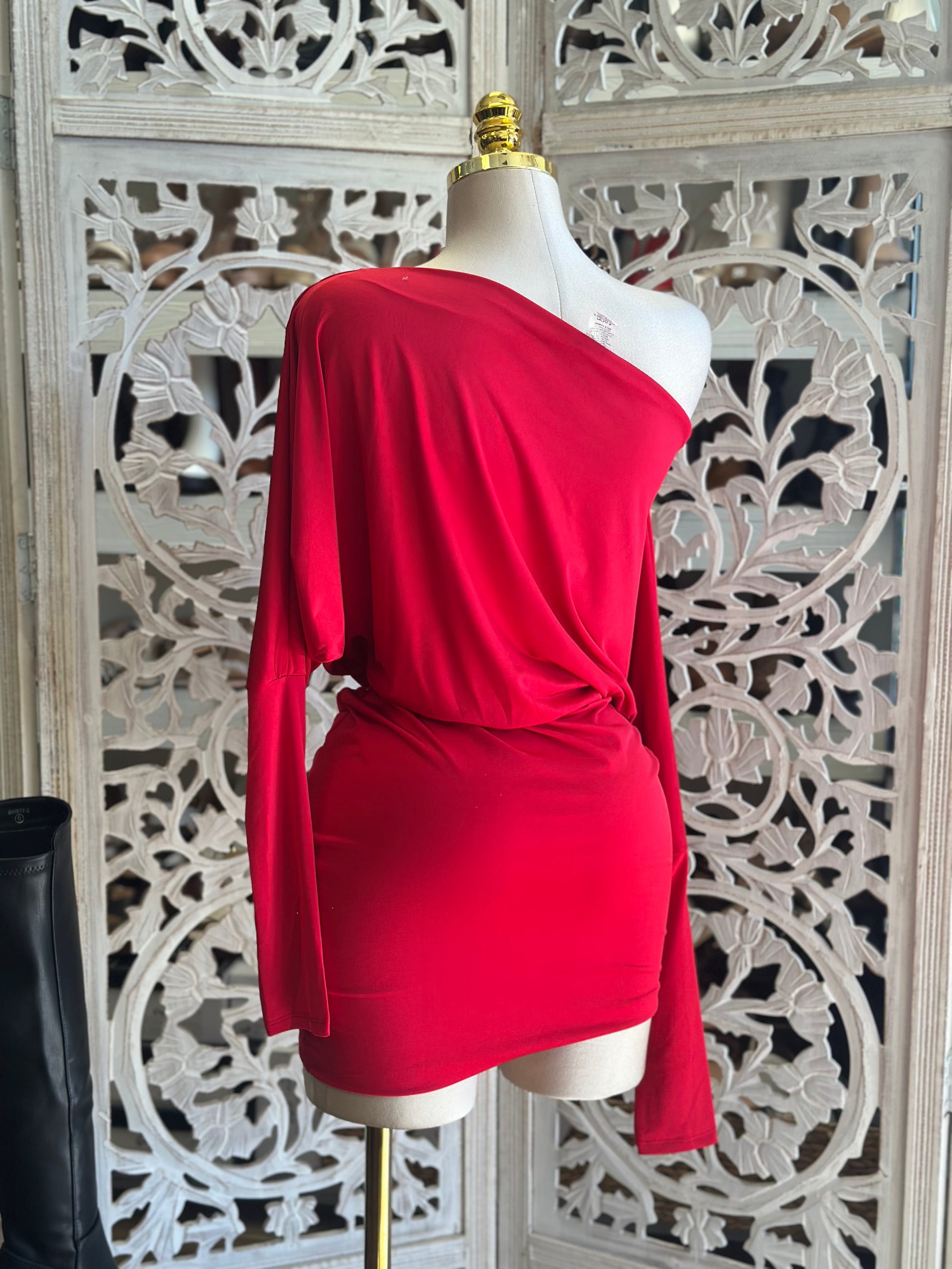 Red Asymmetrical Off Shoulder Mini Dress- Stretchy,Estira